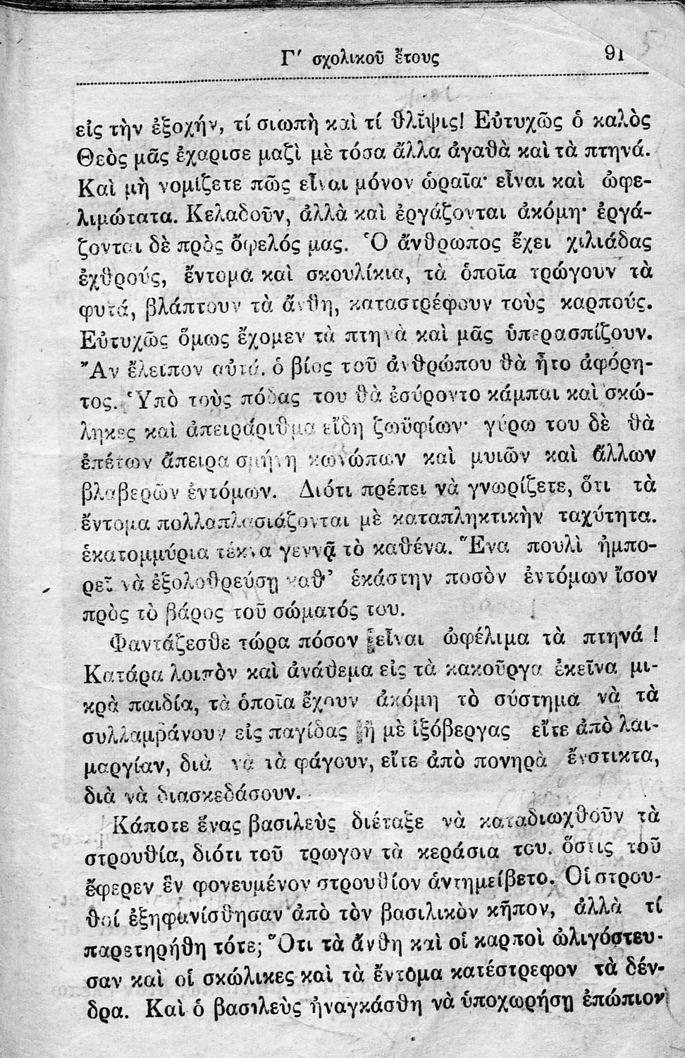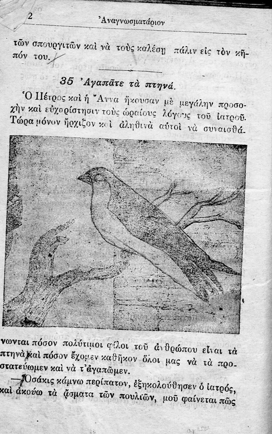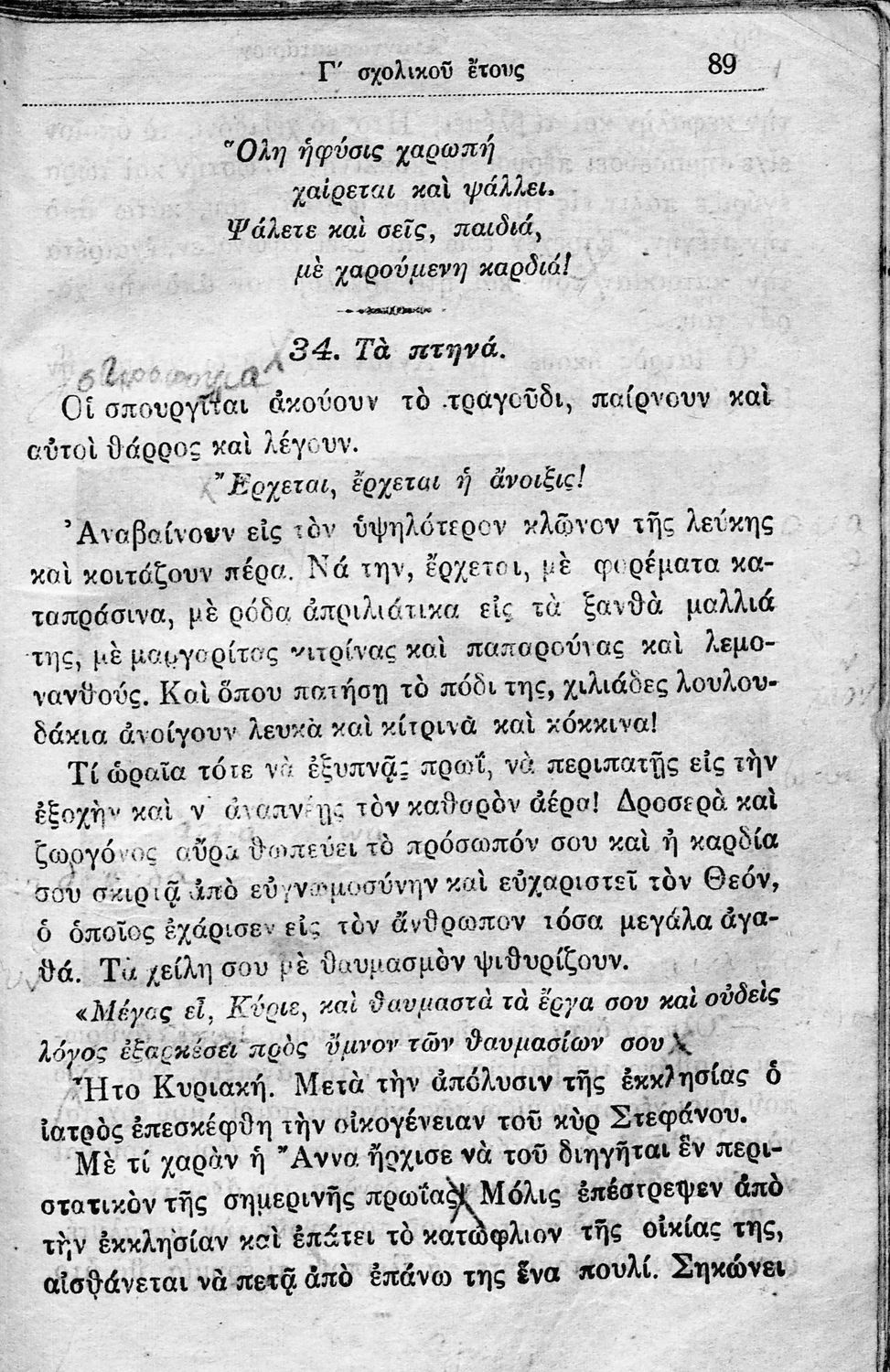 Παρουσίαση περιεχομένου: Σχολικό εγχειρίδιο Γλώσσας για την Γ΄ Δημοτικού. Περιλαμβάνει κείμενα σχετικά με την αγροτική ζωή και τη φύση. Εγκρίθηκε στον Πανταζοπούλειο διαγωνισμό που προκηρύχτηκε στις 24-7-1913 για να συνταχτεί αναγνωσματάριο για τα Α΄, Β΄, Γ΄, Δ΄ έτη της Δημοτικής Εκπαιδεύσεως.