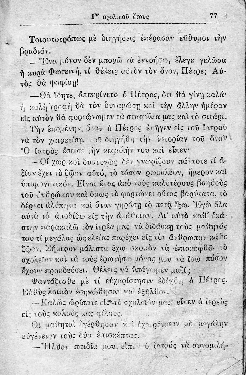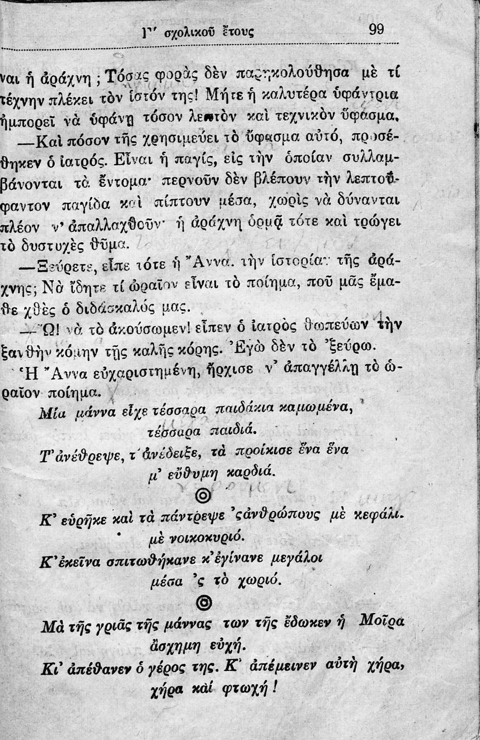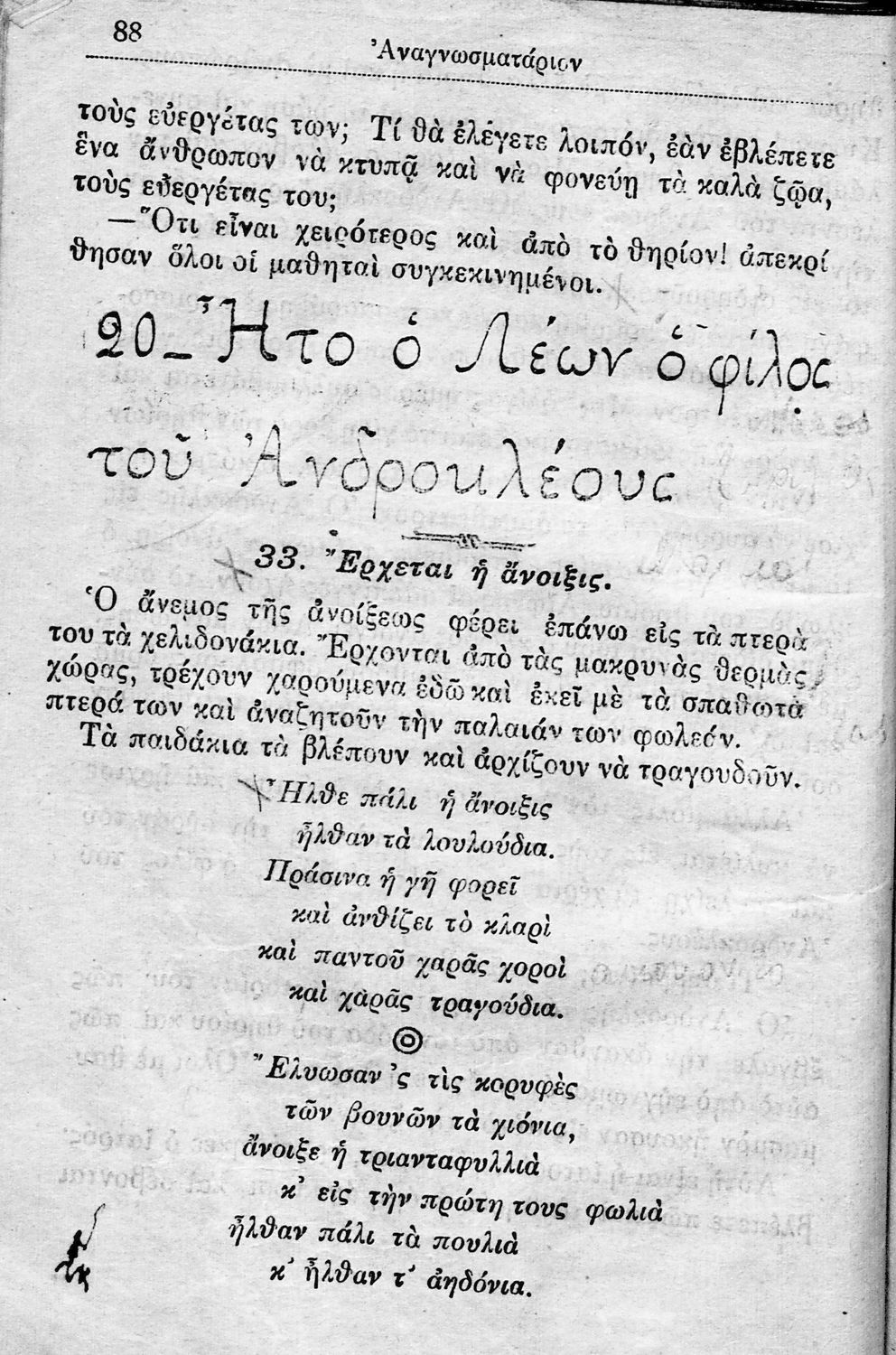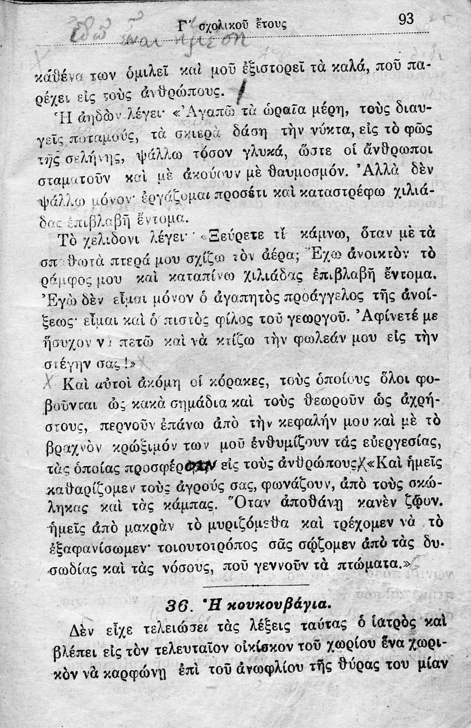 Παρουσίαση περιεχομένου: Σχολικό εγχειρίδιο Γλώσσας για την Γ΄ Δημοτικού. Περιλαμβάνει κείμενα σχετικά με την αγροτική ζωή και τη φύση. Εγκρίθηκε στον Πανταζοπούλειο διαγωνισμό που προκηρύχτηκε στις 24-7-1913 για να συνταχτεί αναγνωσματάριο για τα Α΄, Β΄, Γ΄, Δ΄ έτη της Δημοτικής Εκπαιδεύσεως.