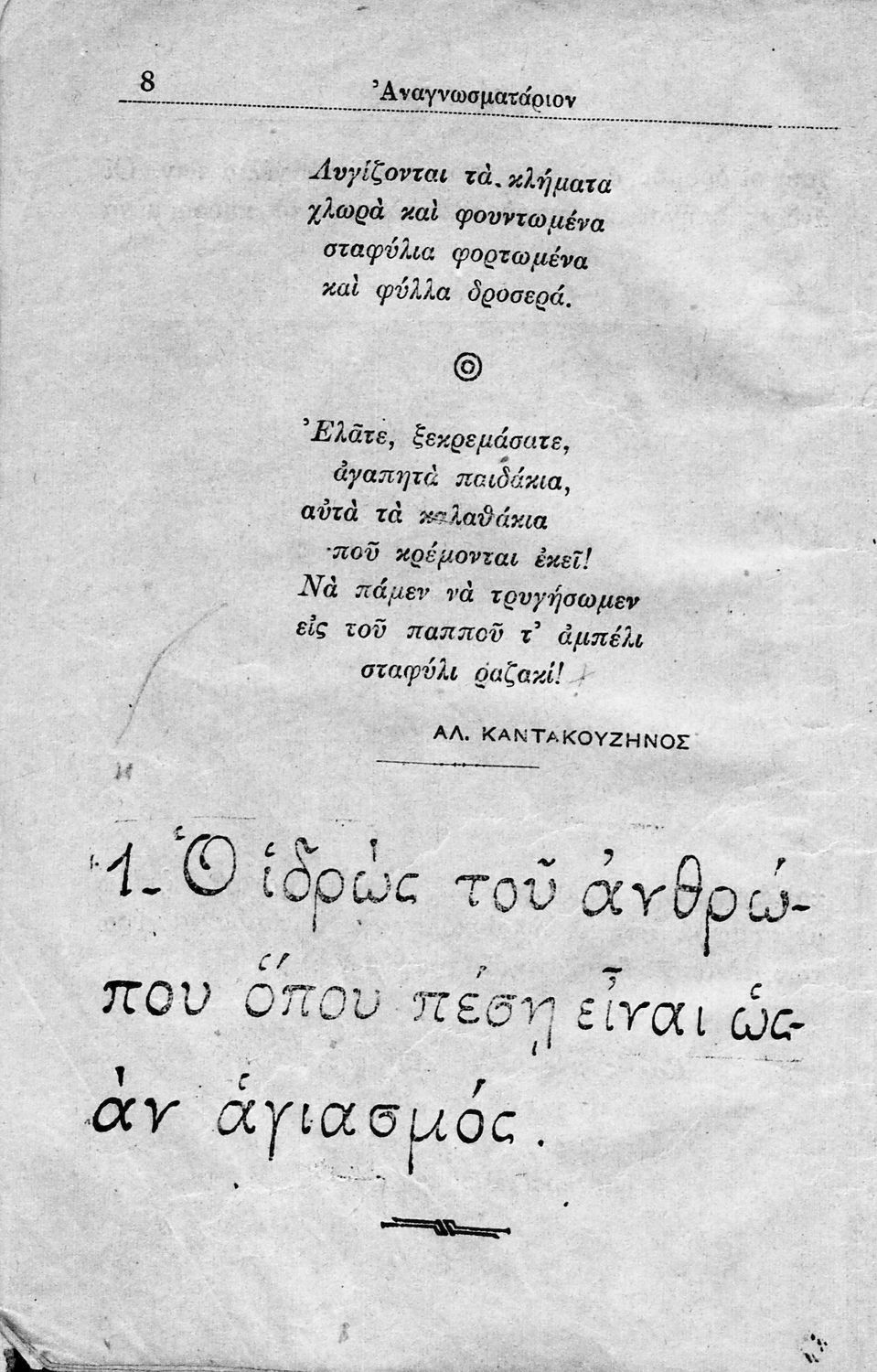 Σχολικό εγχειρίδιο Γλώσσας για την Γ΄ Δημοτικού. Περιλαμβάνει κείμενα σχετικά με την αγροτική ζωή και τη φύση. Εγκρίθηκε στον Πανταζοπούλειο διαγωνισμό που προκηρύχτηκε στις 24-7-1913 για να συνταχτεί αναγνωσματάριο για τα Α΄, Β΄, Γ΄, Δ΄ έτη της Δημοτικής Εκπαιδεύσεως.