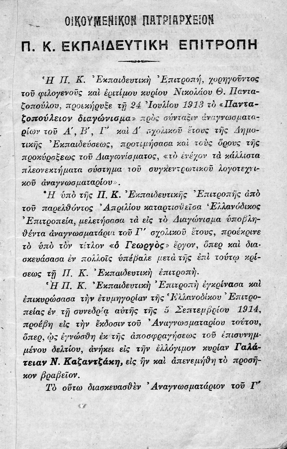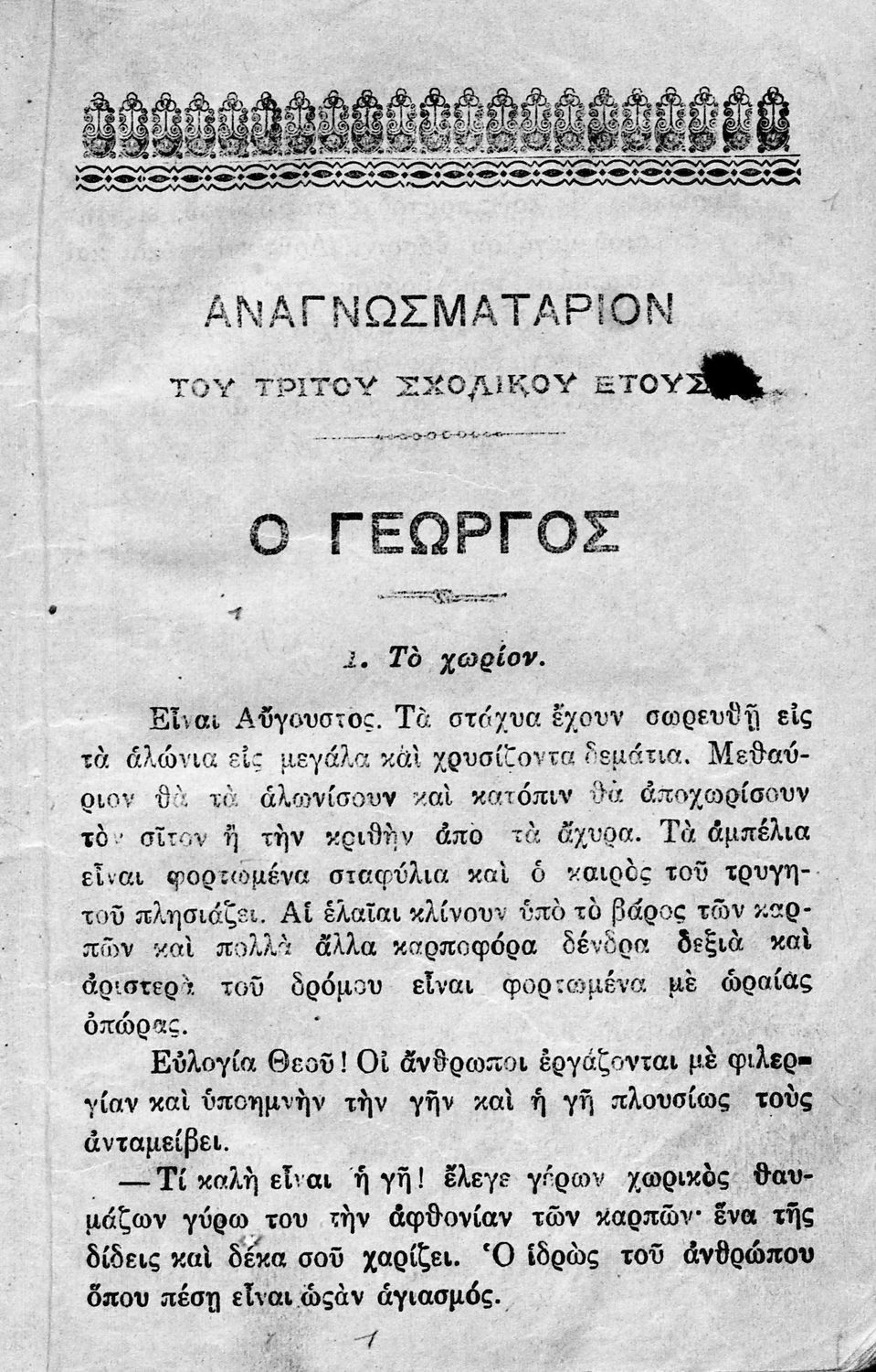 Τίτλος: Ο Γεωργός, Αναγνωσματάριον του τρίτου σχολικού έτους της πρώτης παιδεύσεως εκδιδόμενον υπό Π.Κ. Εκπαιδευτικής Επιτροπής κατά διασκευήν του εν τω Πανταζοπουλείω διαγωνίσματι εγκριθέντος έργου της Γαλάτειας Ν.Καζαντζάκη