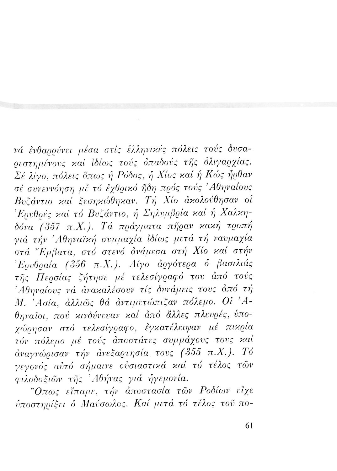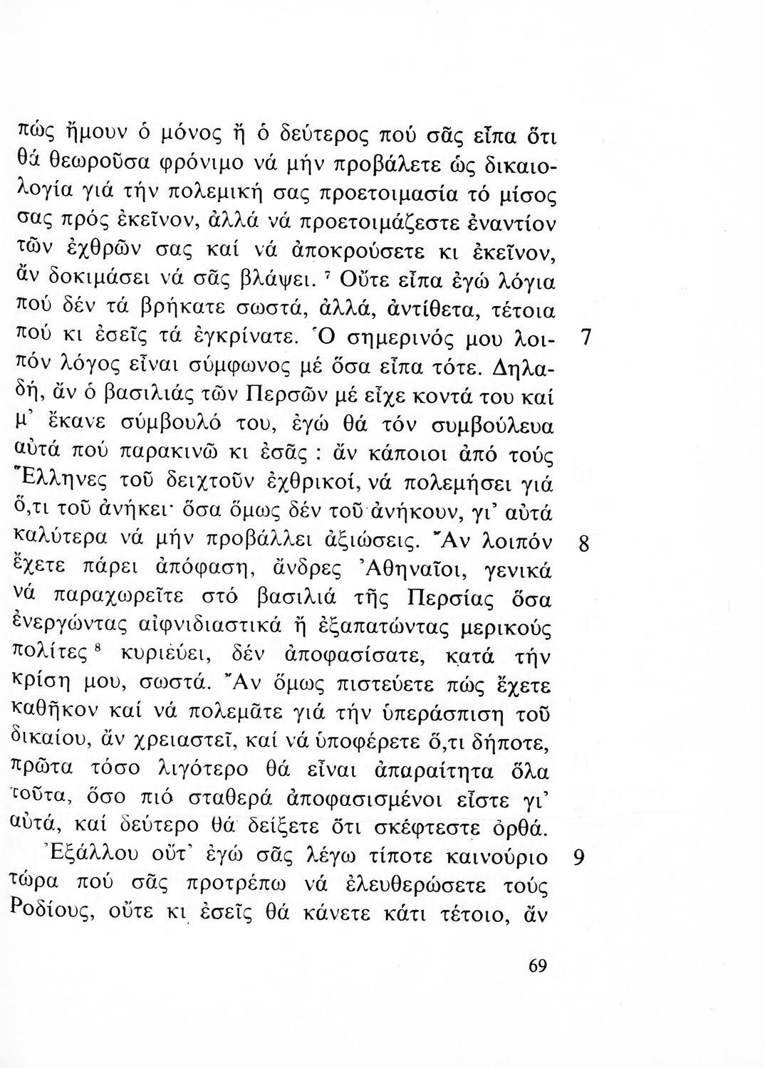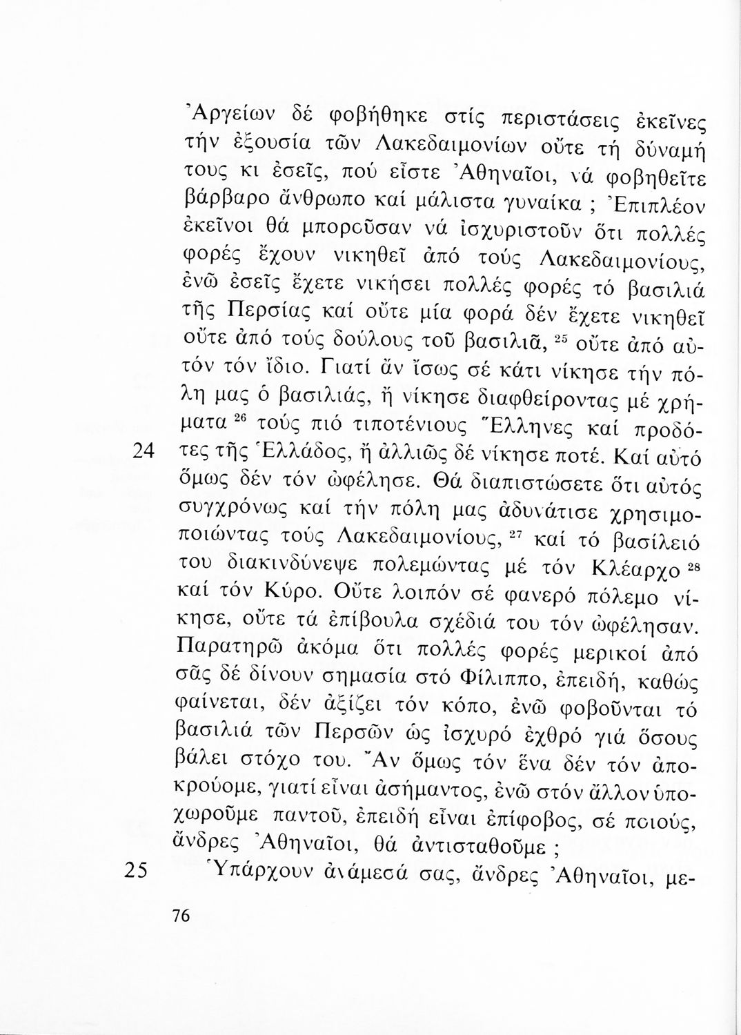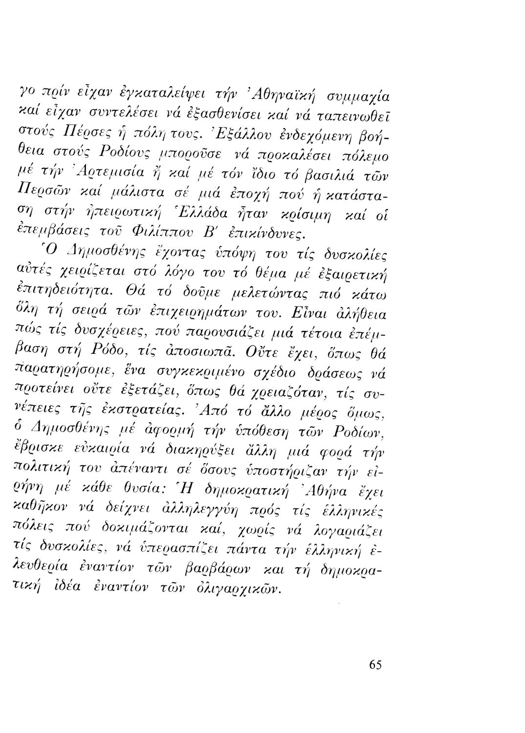 Σχολικό εγχειρίδιο Αρχαίων Ελληνικών Γ΄ Γυμνασίου περιλαμβάνει εισαγωγή στη ζωή και το έργο του Δημοσθένη, τους Λόγους του Γ΄ Ολυνθιακός και Υπέρ της ελευθερίας των Ροδίων σε μετάφραση και ερμηνευτικές σημειώσεις.
