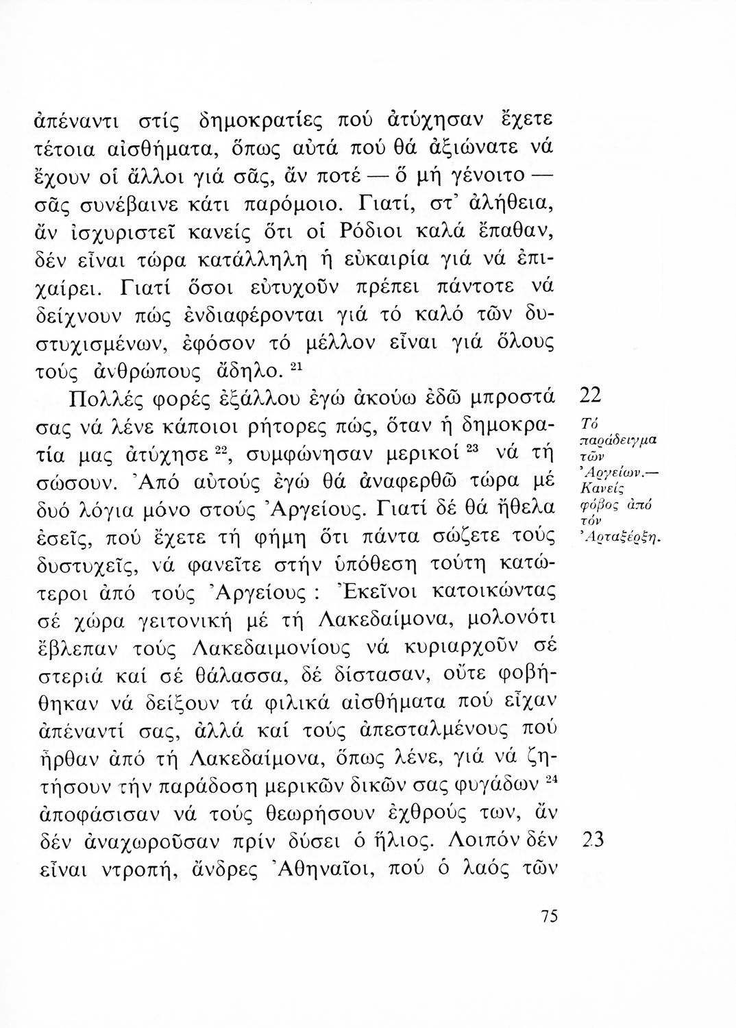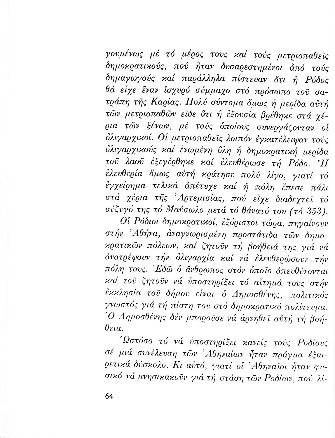 Σχολικό εγχειρίδιο Αρχαίων Ελληνικών Γ΄ Γυμνασίου περιλαμβάνει εισαγωγή στη ζωή και το έργο του Δημοσθένη, τους Λόγους του Γ΄ Ολυνθιακός και Υπέρ της ελευθερίας των Ροδίων σε μετάφραση και ερμηνευτικές ...