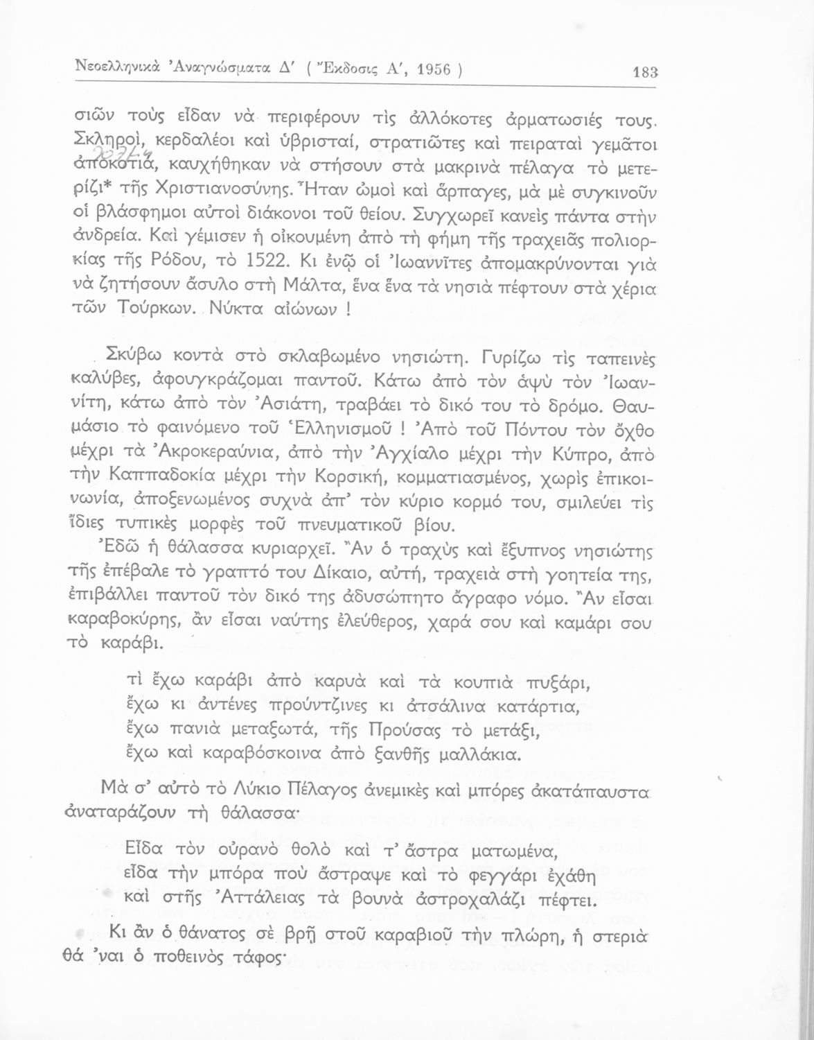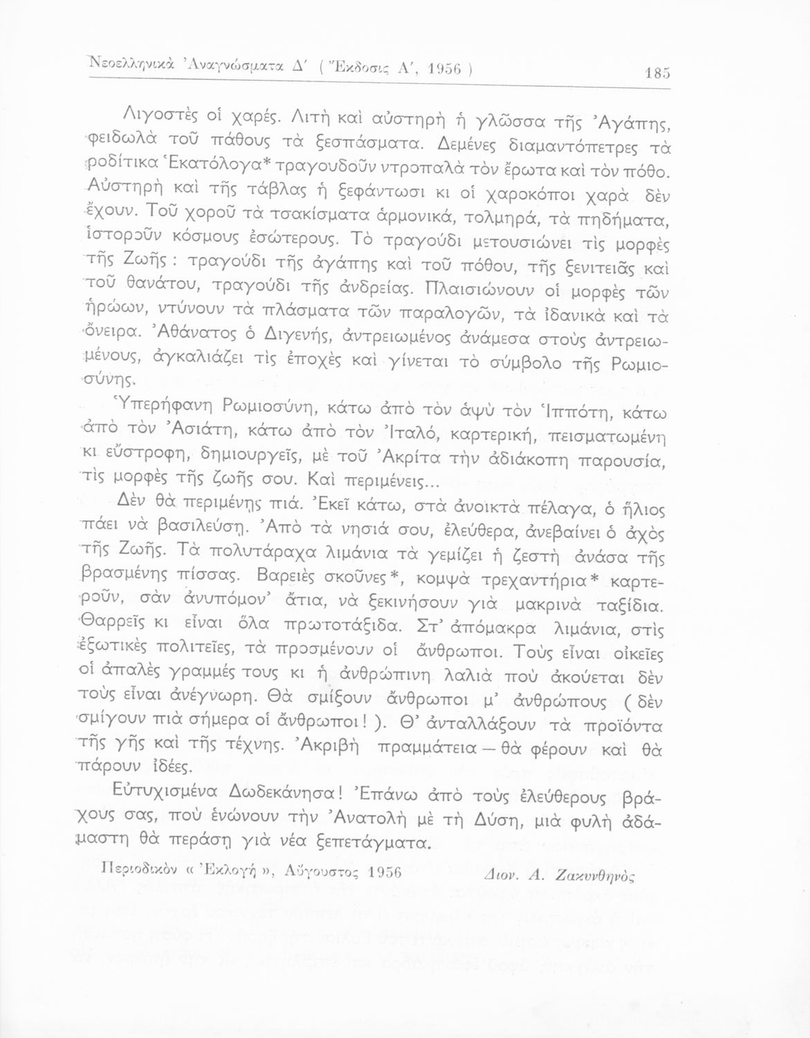 Σχολικό εγχειρίδιο Νέων Ελληνικών Δ΄ Γυμνασίου Θηλέων που περιλαμβάνει πεζά, ποιήματα και δημοτικά τραγούδια εμπνευσμένα από την σύγχρονη ελληνική ιστορία και την οικογενειακή και θρησκευτική ζωή. Περιέχει και