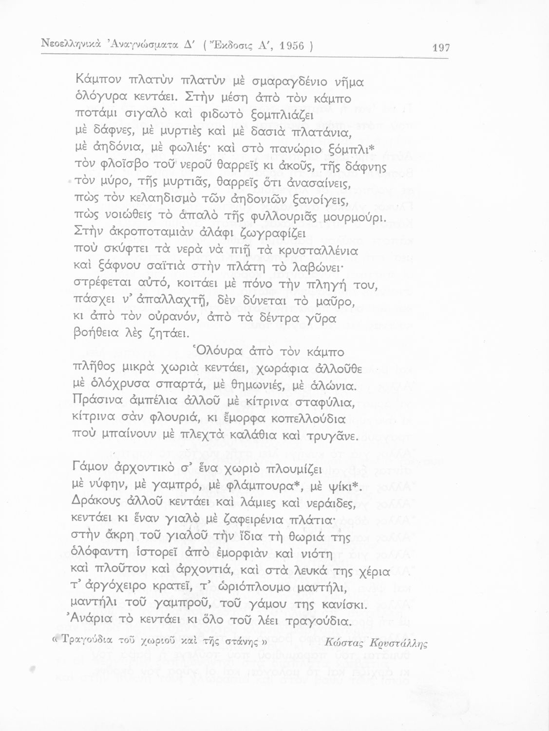 Σχολικό εγχειρίδιο Νέων Ελληνικών Δ΄ Γυμνασίου που περιλαμβάνει ποιήματα και πεζά Ελλήνων συγγραφέων και δημοτικά τραγούδια εμπνευσμένα από την ελληνική φύση, την καθημερινή ζωή των ανθρώπων, τη θρησκευτική ...