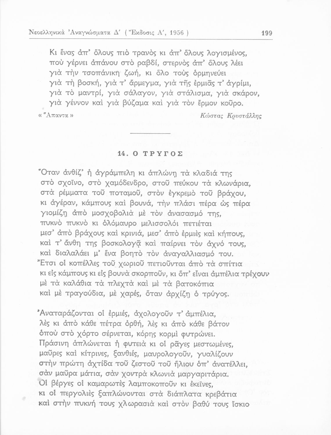 Σχολικό εγχειρίδιο Νέων Ελληνικών Δ' Γυμνασίου που περιλαμβάνει πεζά, ποιήματα και παροιμίες Ελλήνων συγγραφέων εμπνευσμένα από την θρησκευτική και κοινωνική ζωή, τη βυζαντινή ιστορία, την αρχαία και σύγχρονη ελληνική ιστορία, και την ελληνική φύση. Περιέχει παράρτημα με βιογραφίες των συγγραφέων και λεξιλόγιο.