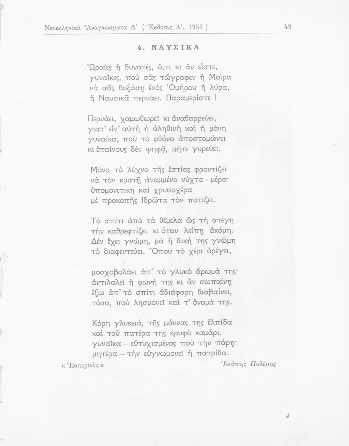 Σχολικό εγχειρίδιο Νέων Ελληνικών Δ΄ Γυμνασίου Θηλέων που περιλαμβάνει πεζά, ποιήματα και δημοτικά τραγούδια εμπνευσμένα από την σύγχρονη ελληνική ιστορία και την οικογενειακή και θρησκευτική ζωή. Περιέχει και