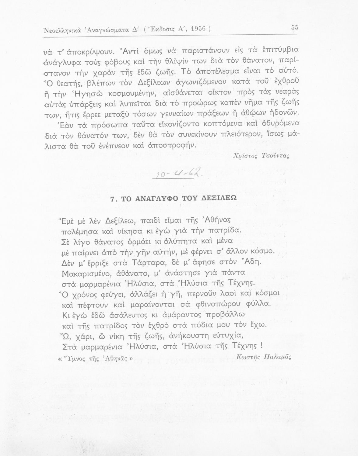 Σχολικό εγχειρίδιο Νέων Ελληνικών Δ΄ Γυμνασίου και Β΄ Αστικού Σχολείου που περιέχει πεζά και ποιήματα Ελλήνων συγγραφέων εμπνευσμένα από τη θρησκευτική και κοινωνική ζωή, την ελληνική μυθολογία, την αρχαία και