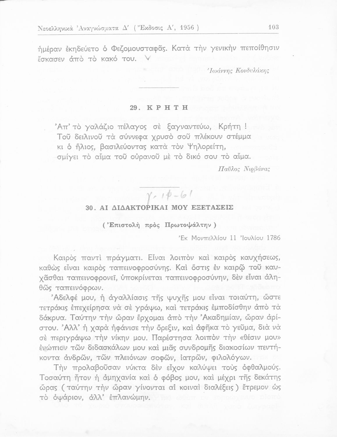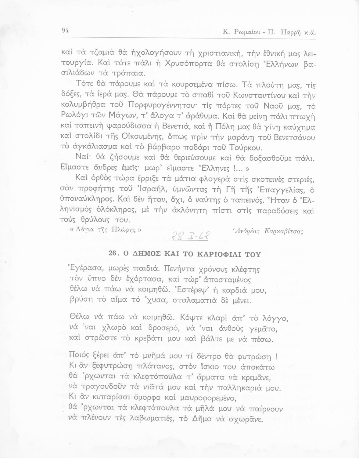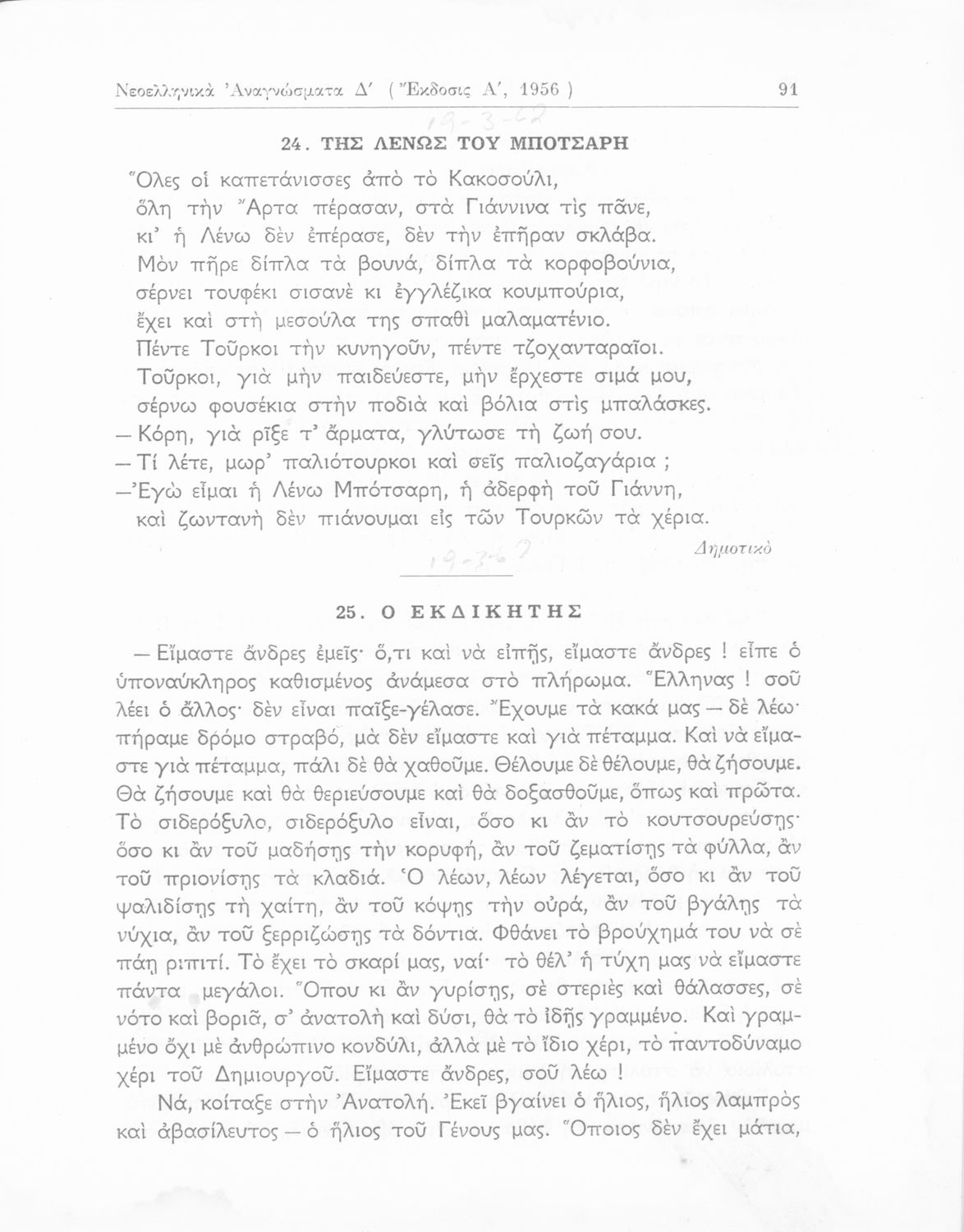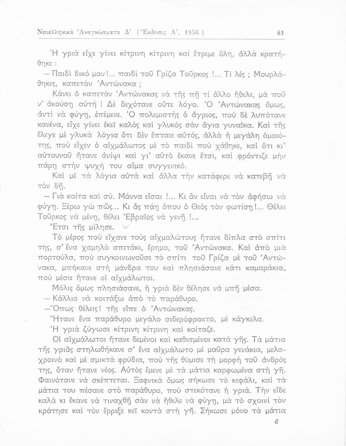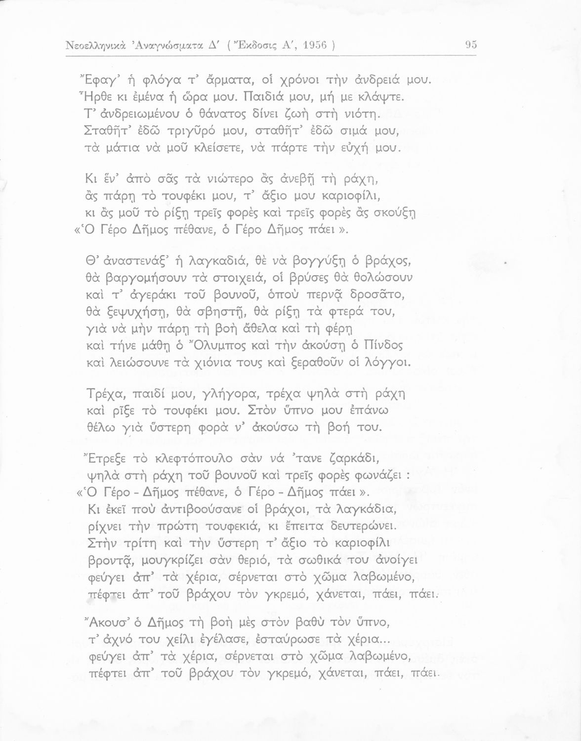 Σχολικό εγχειρίδιο Νέων Ελληνικών Δ΄ Γυμνασίου Θηλέων που περιλαμβάνει πεζά, ποιήματα και δημοτικά τραγούδια εμπνευσμένα από την σύγχρονη ελληνική ιστορία και την οικογενειακή και θρησκευτική ζωή. Περιέχει και