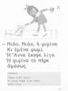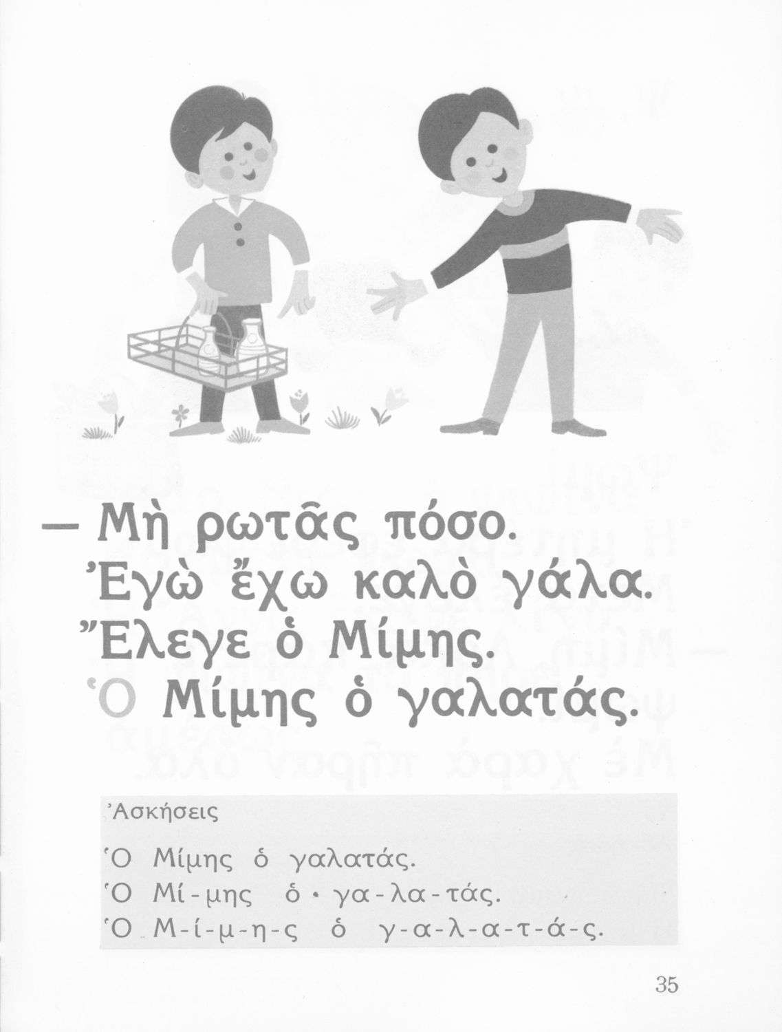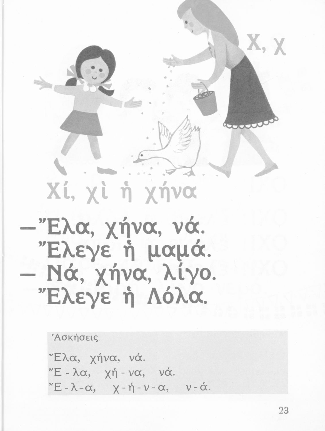 Αναγνωστικό Α΄ Δημοτικού που περιέχει γράμματα, συλλαβές, λέξεις, προτάσεις και κείμενα εμπνευσμένα από την οικογενειακή και κοινωνική ζωή του τόπου. Φέρει το σύμβολο της δικτατορίας.