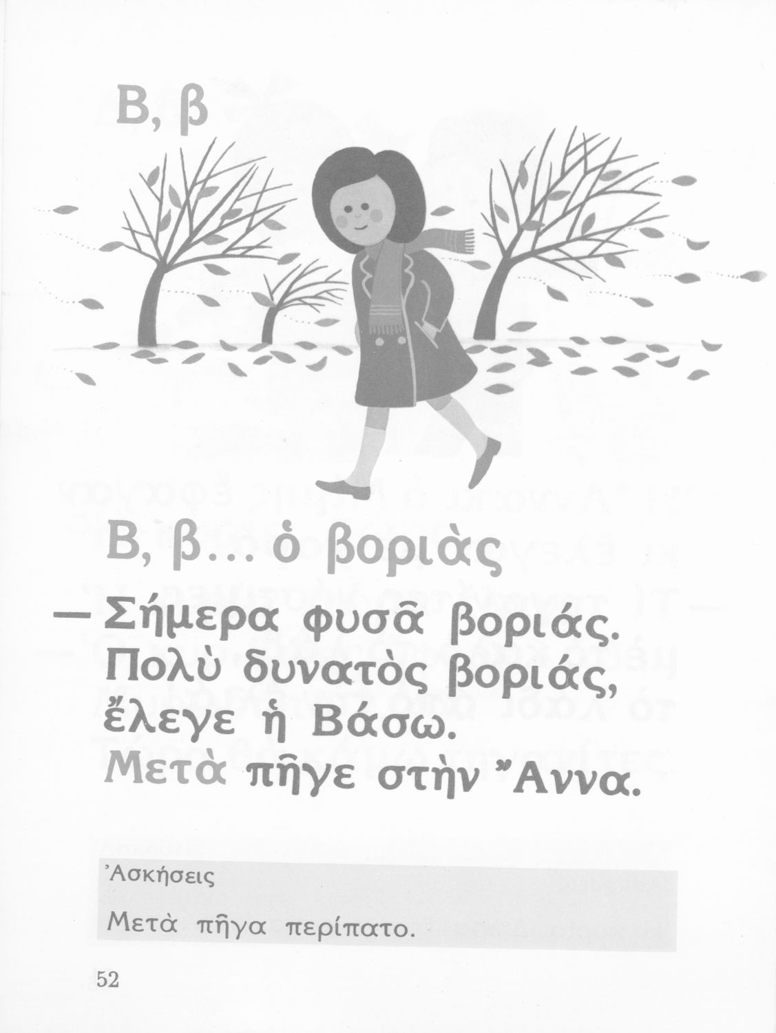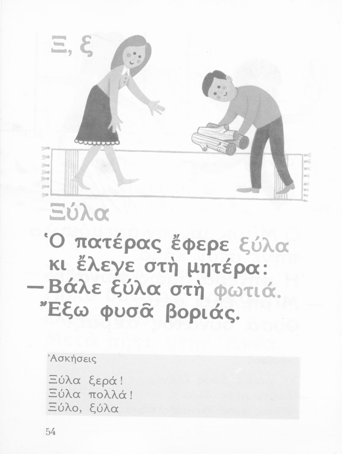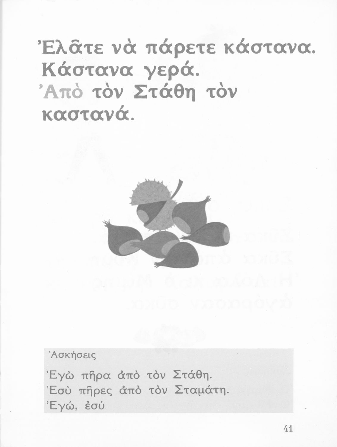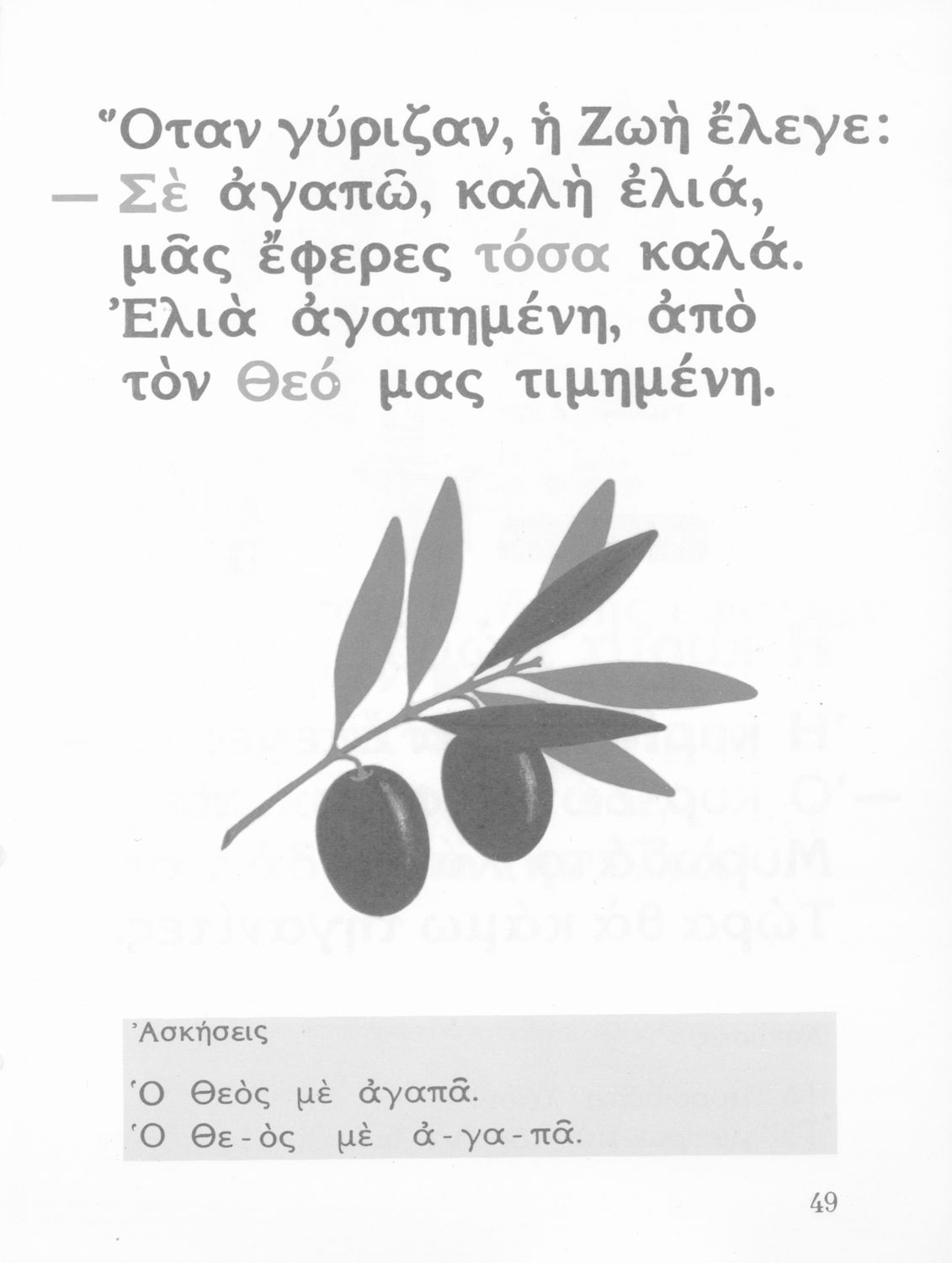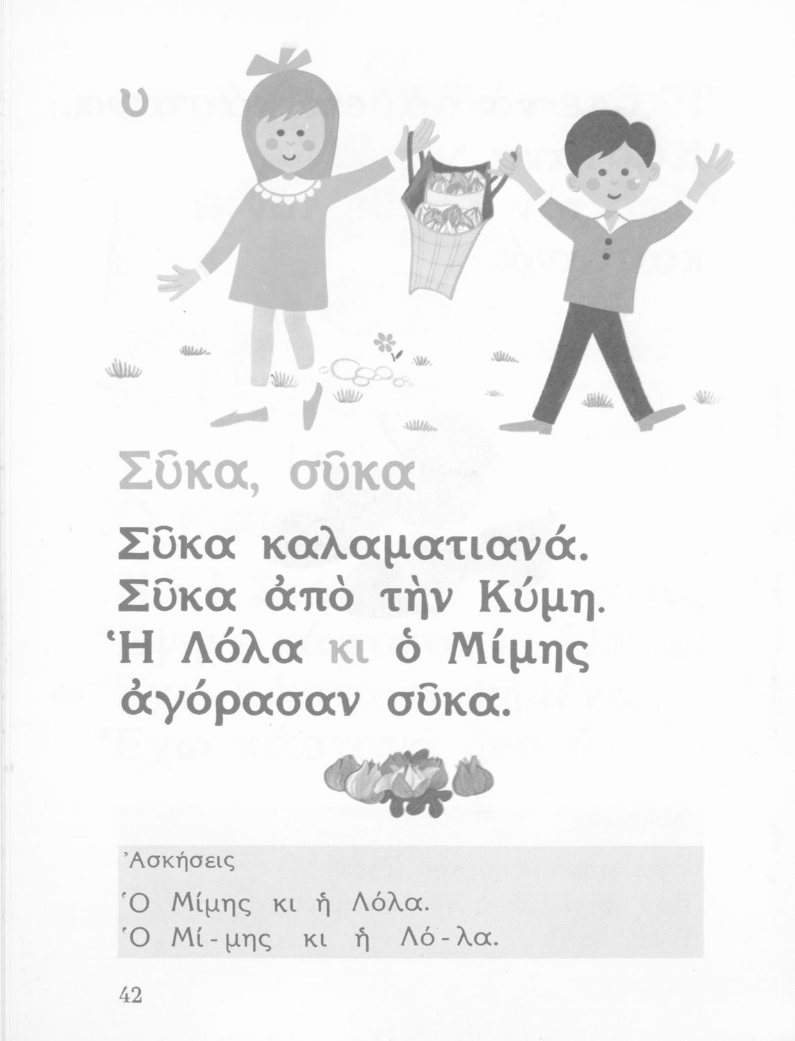 Αναγνωστικό Α΄ Δημοτικού που περιέχει γράμματα, συλλαβές, λέξεις, προτάσεις και κείμενα εμπνευσμένα από την οικογενειακή και κοινωνική ζωή του τόπου. Φέρει το σύμβολο της δικτατορίας.