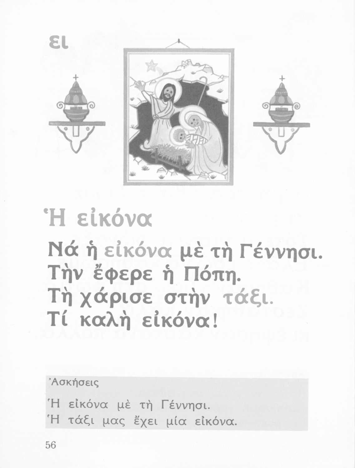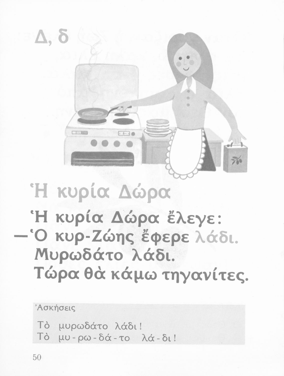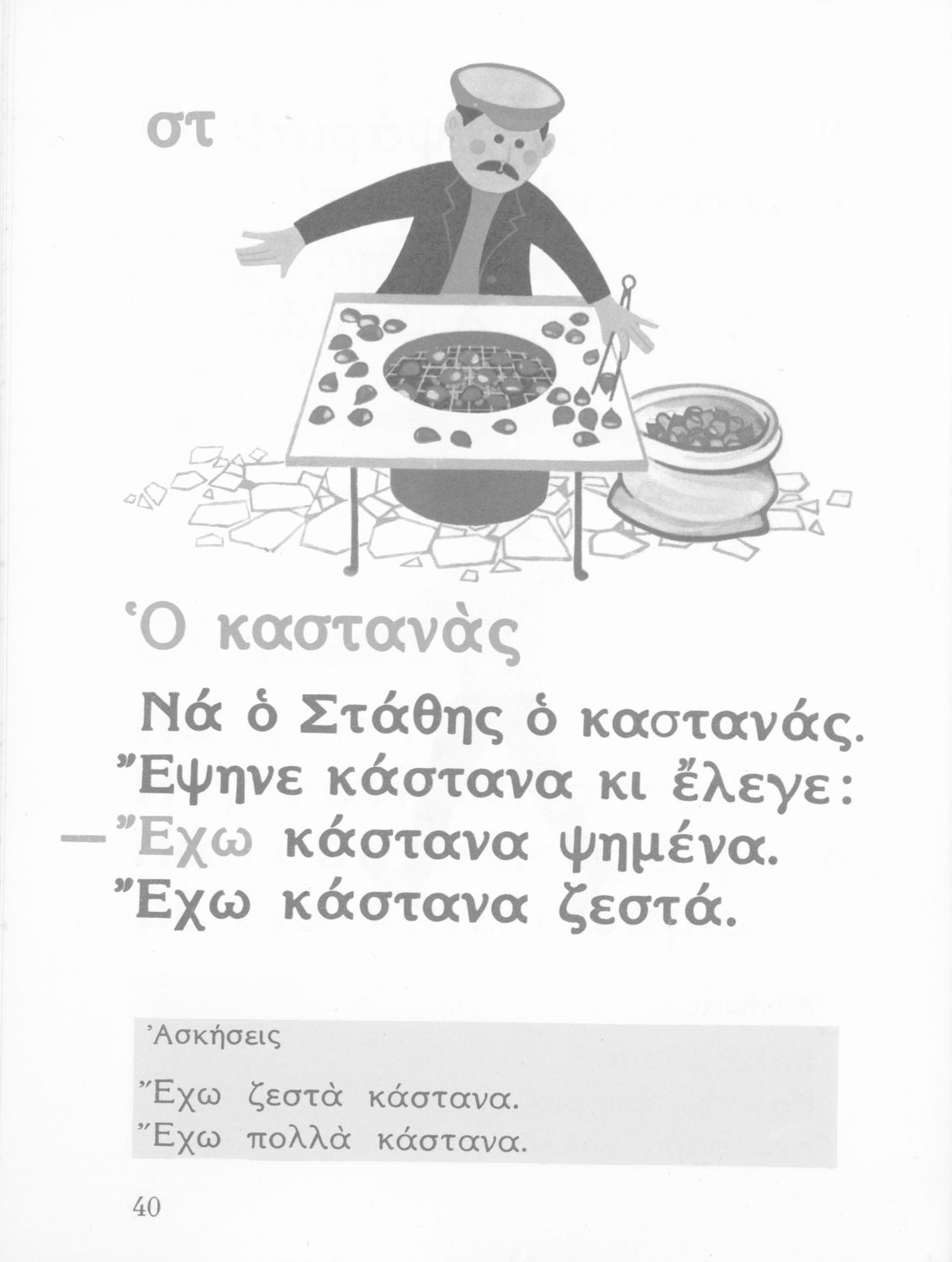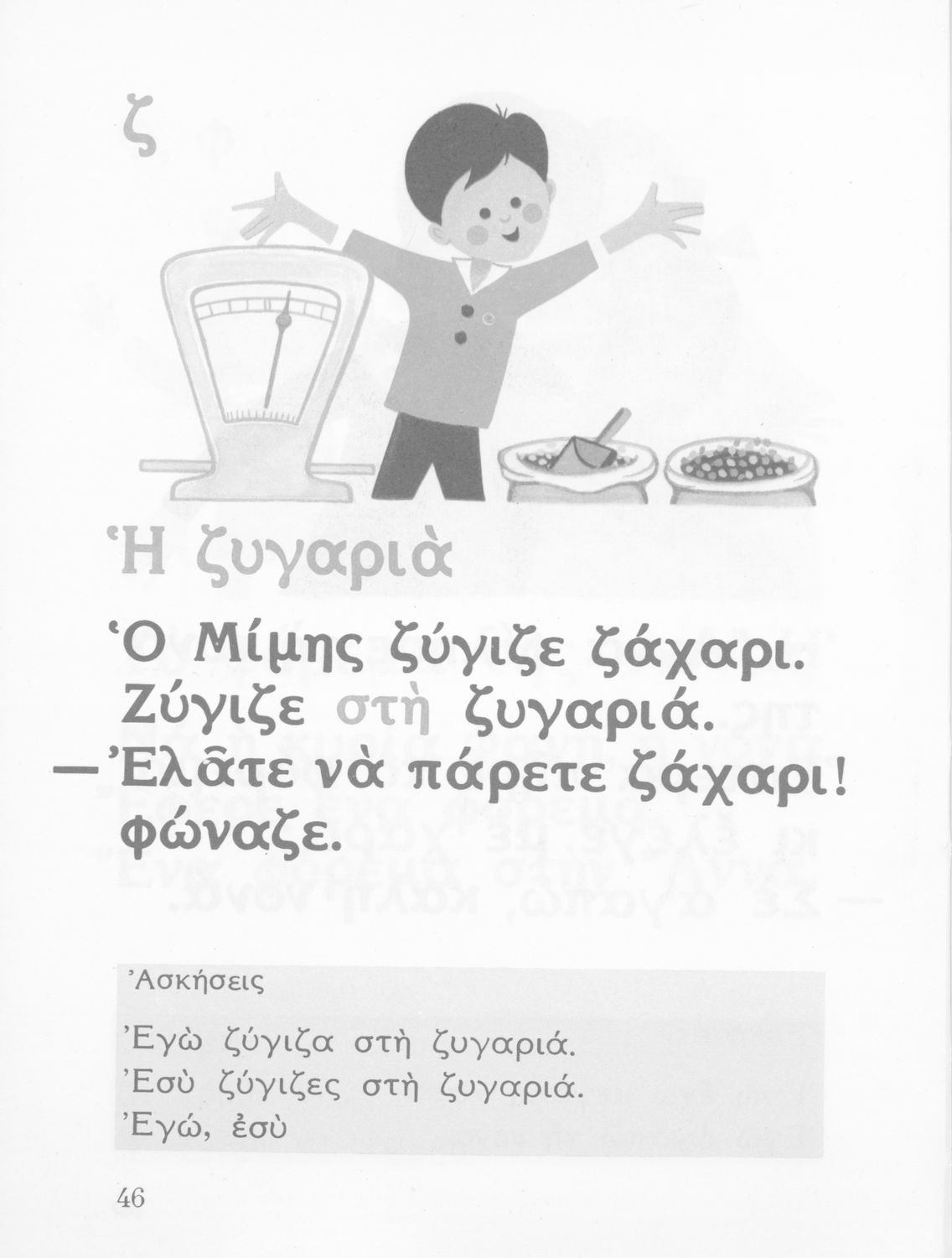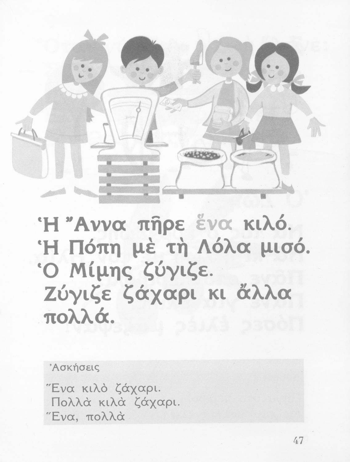 Αναγνωστικό Α΄ Δημοτικού που περιέχει γράμματα, συλλαβές, λέξεις, προτάσεις και κείμενα εμπνευσμένα από την οικογενειακή και κοινωνική ζωή του τόπου. Φέρει το σύμβολο της δικτατορίας.