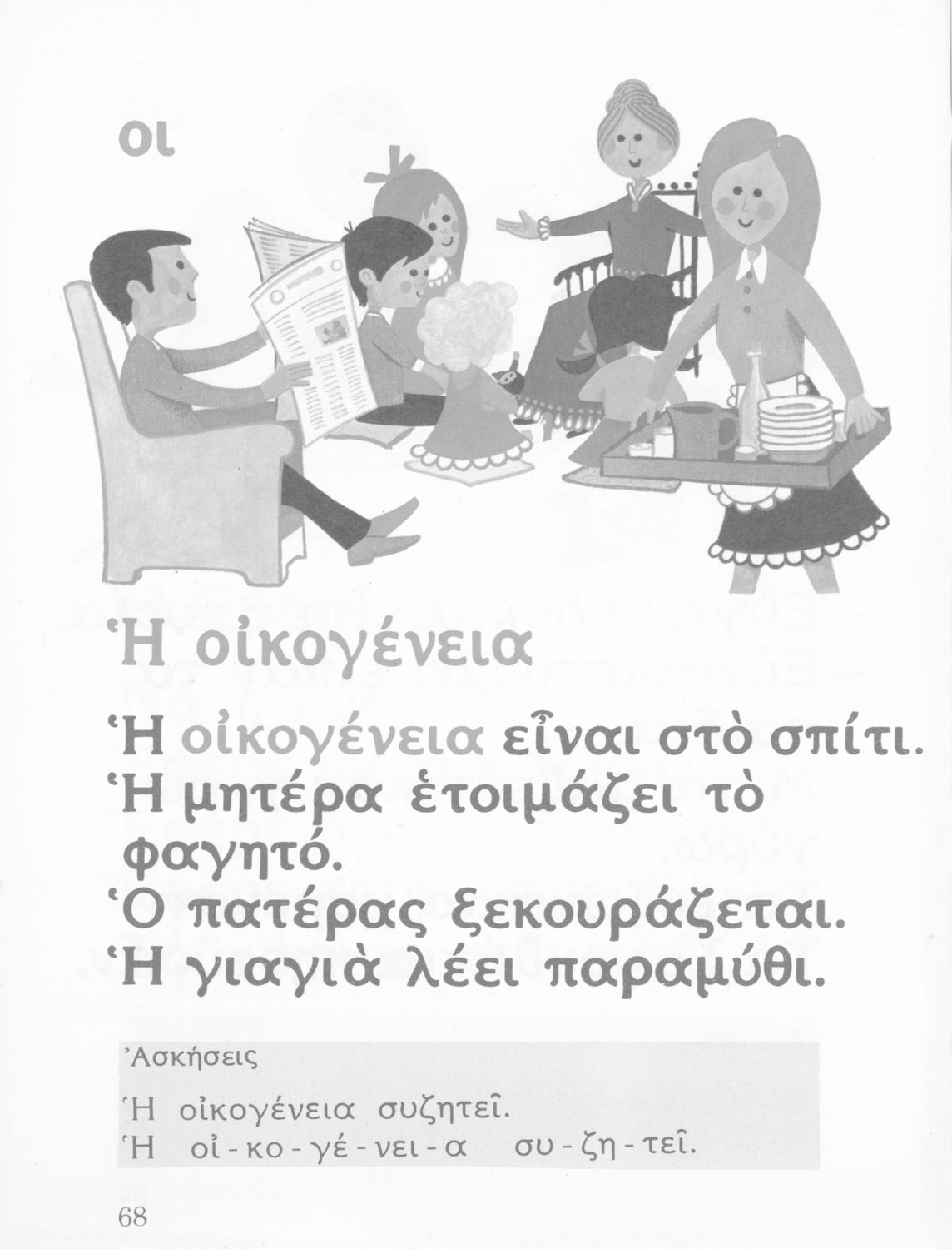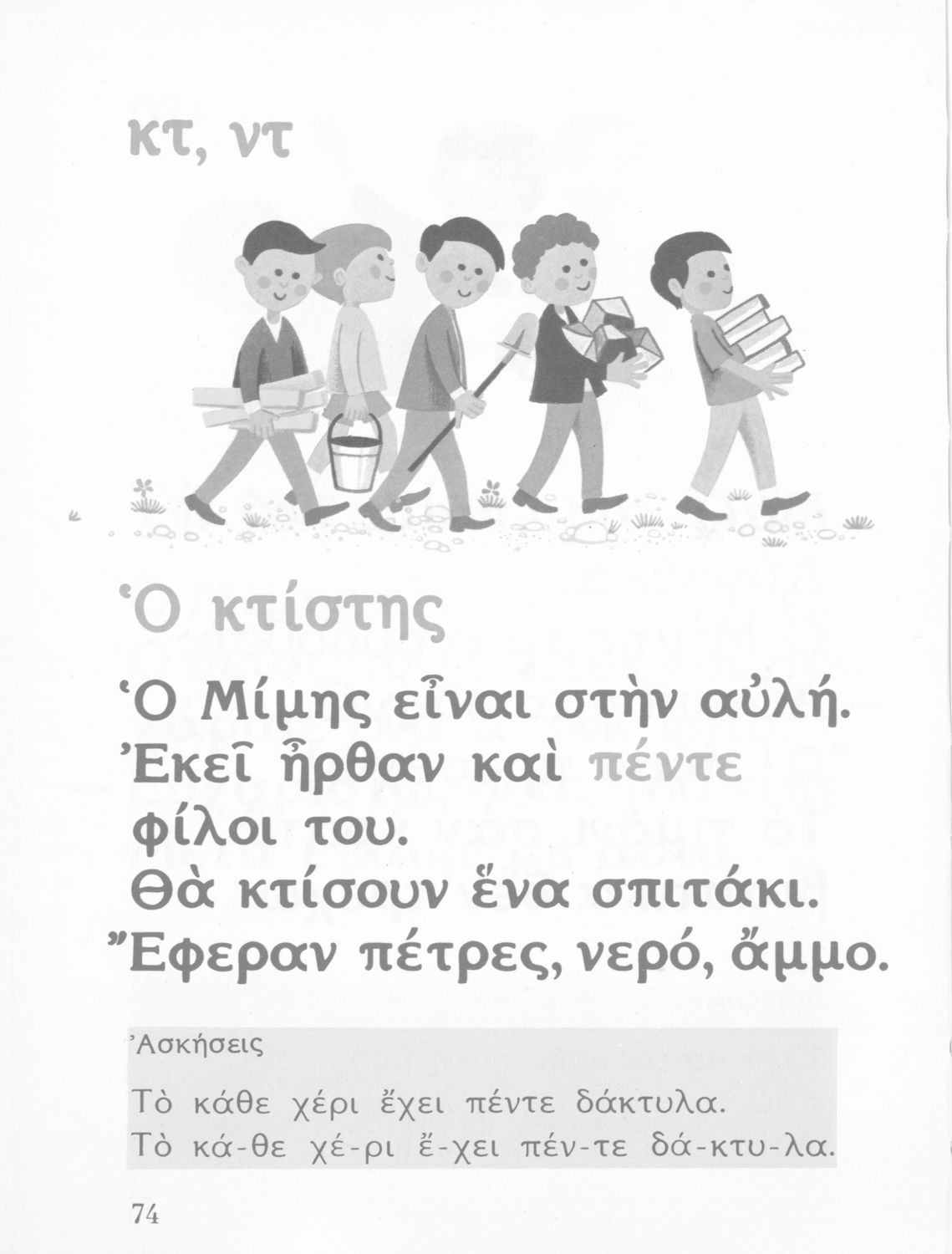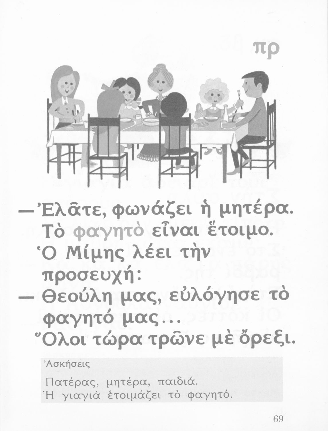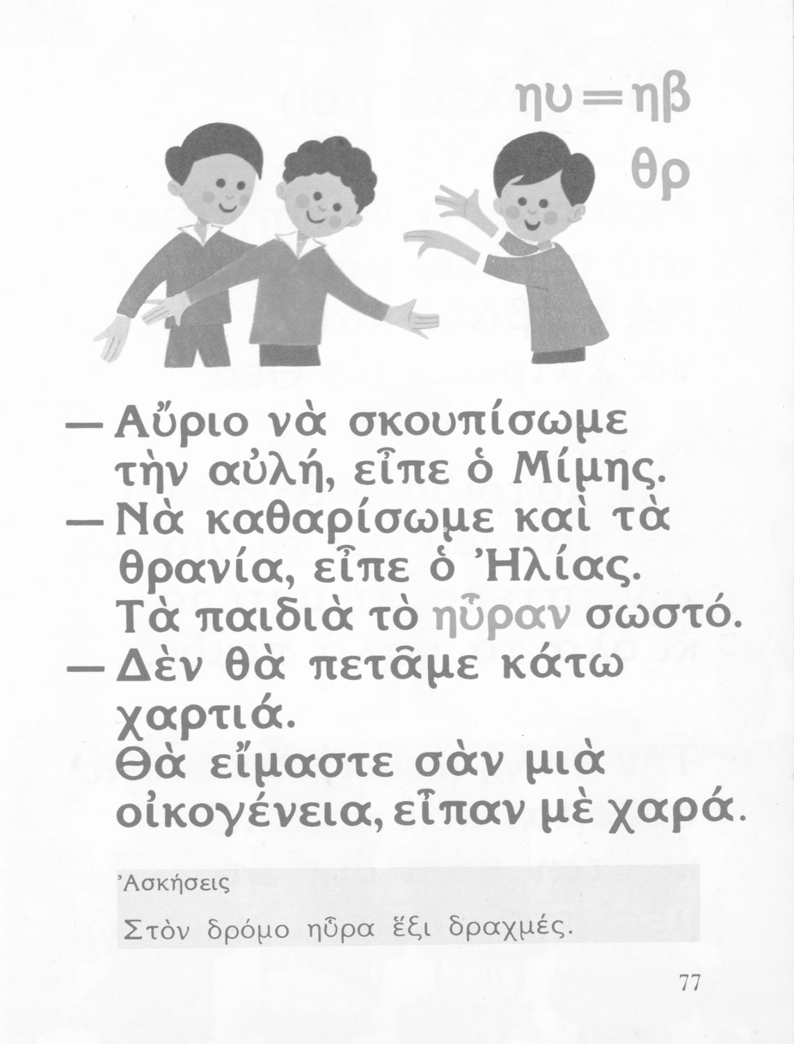 Αναγνωστικό Α΄ Δημοτικού που περιέχει γράμματα, συλλαβές, λέξεις, προτάσεις και κείμενα εμπνευσμένα από την οικογενειακή και κοινωνική ζωή του τόπου. Φέρει το σύμβολο της δικτατορίας.
