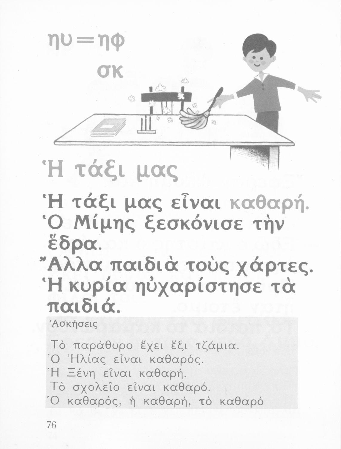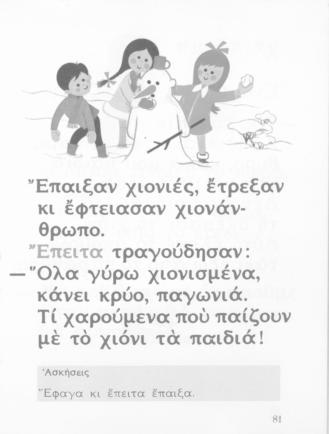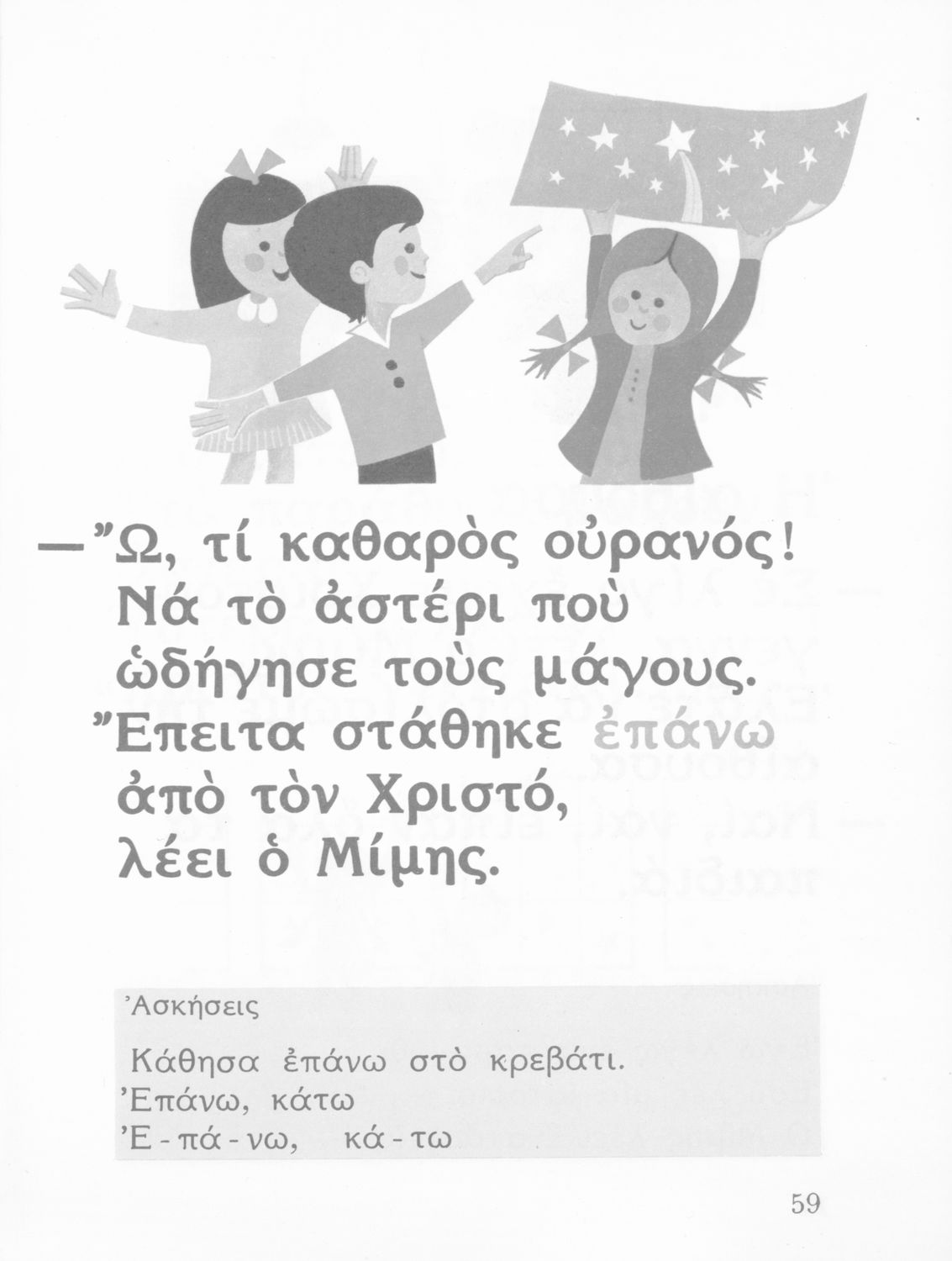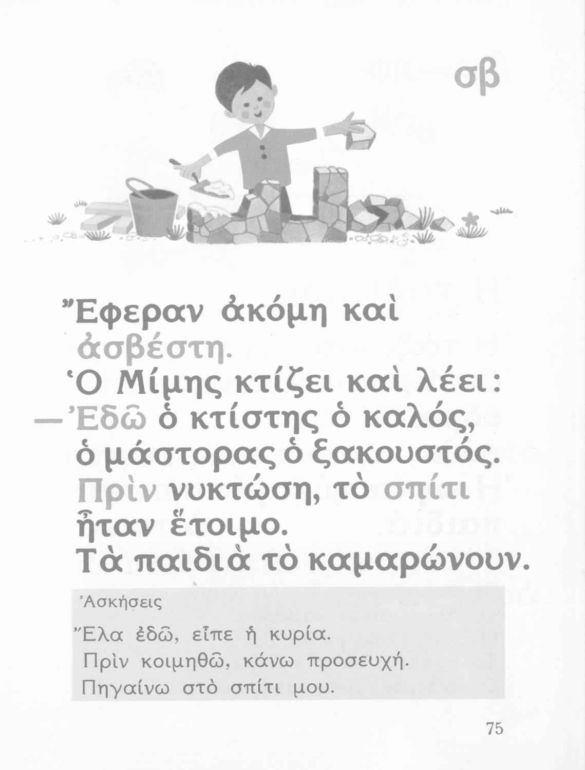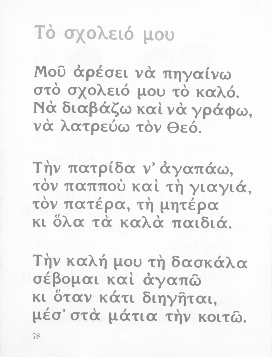 Αναγνωστικό Α΄ Δημοτικού που περιέχει γράμματα, συλλαβές, λέξεις, προτάσεις και κείμενα εμπνευσμένα από την οικογενειακή και κοινωνική ζωή του τόπου. Φέρει το σύμβολο της δικτατορίας.