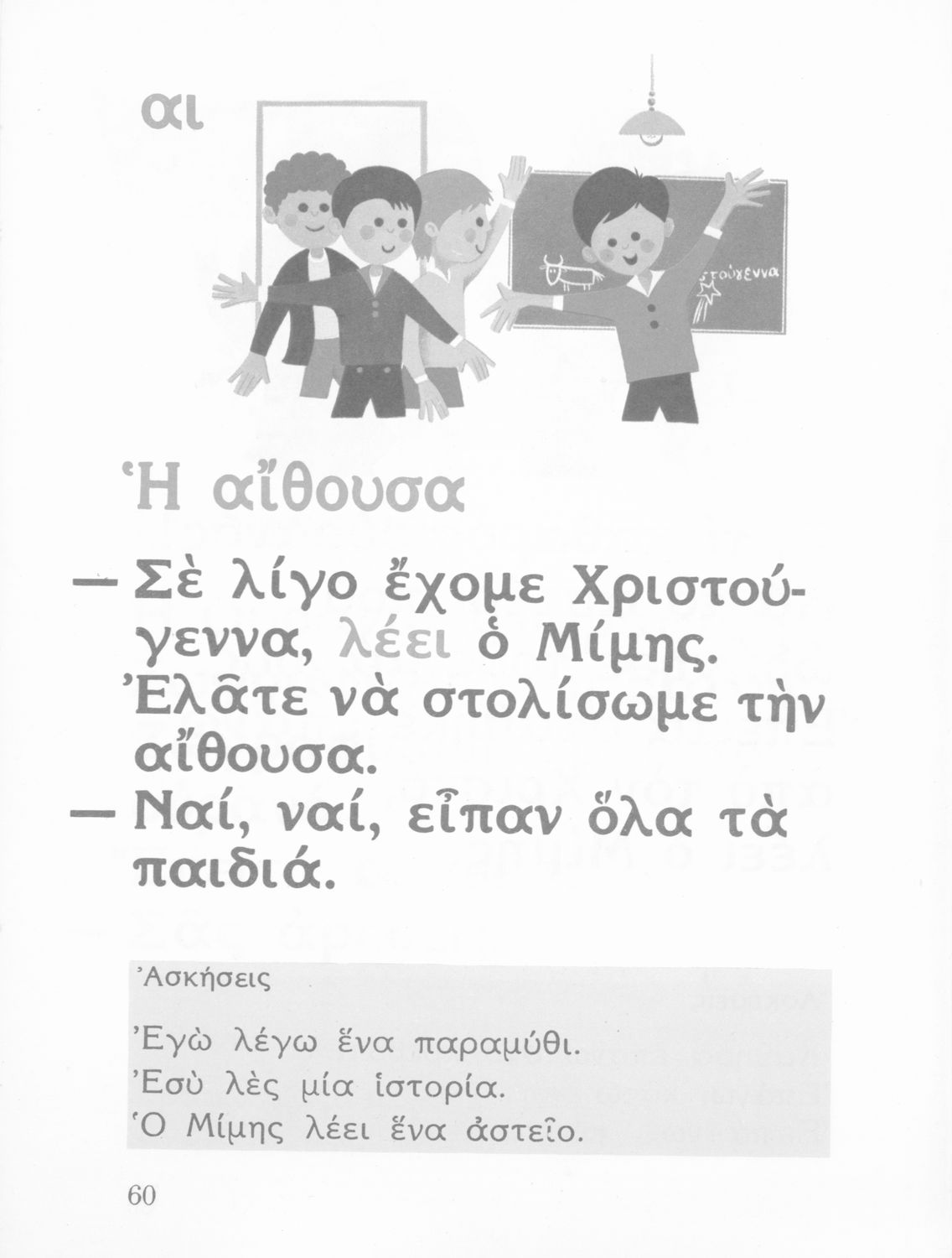 Αναγνωστικό Α΄ Δημοτικού που περιλαμβάνει το ελληνικό αλφάβητο, εικόνες, συλλαβές και μικρές φράσεις και προτάσεις.
