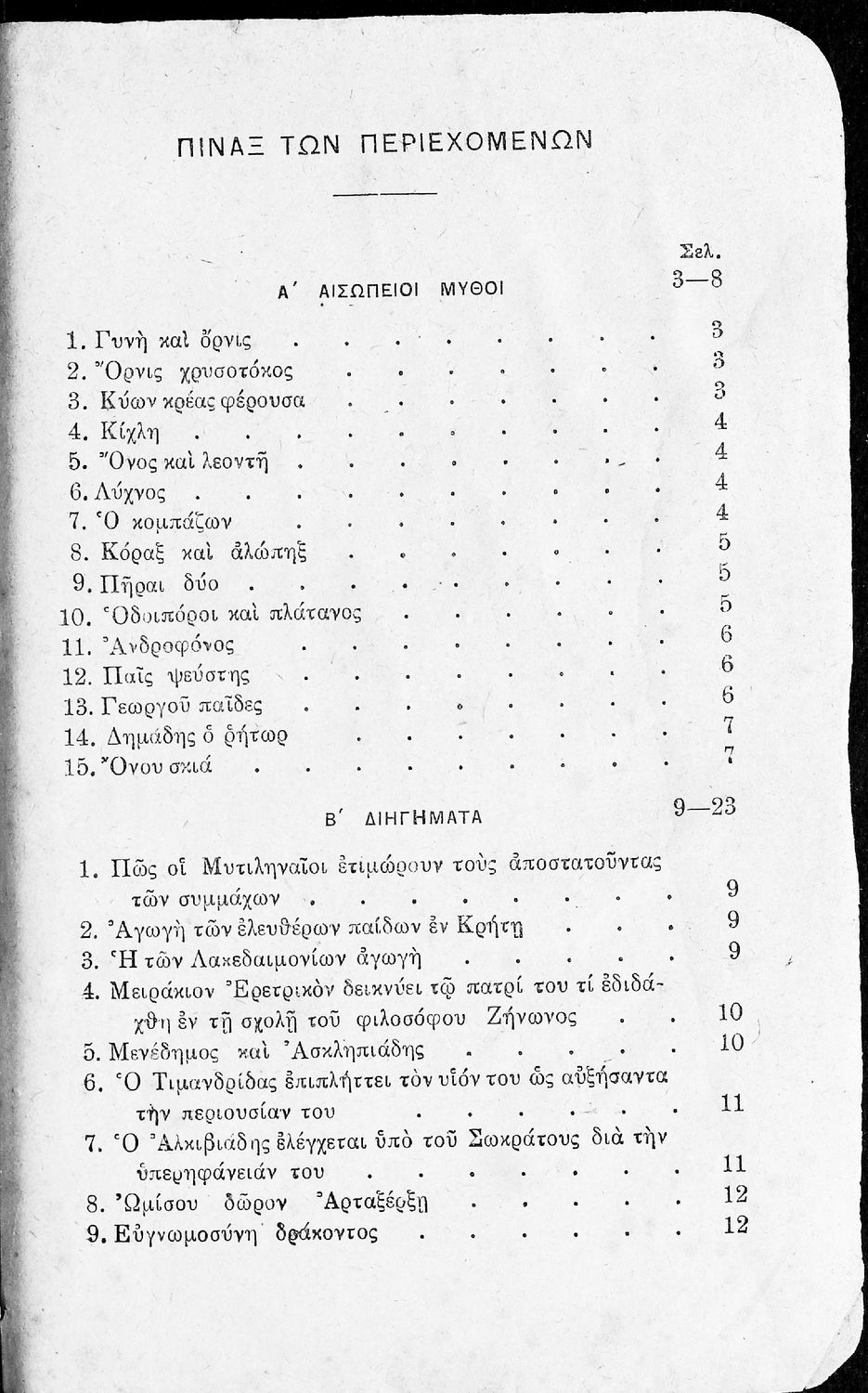 Σχολικό εγχειρίδιο Αρχαίων Ελληνικών για την Α' Ελληνικού Σχολείου που περιλαμβάνει διηγήματα εμπνευσμένα από τους μύθους του Αισώπου, την αρχαία Ελλάδα, τις ελληνικές πόλεις και την ελληνική μυθολογία. Περιέχει λεξιλόγιο και πίνακα των κυριοτέρων ονομάτων..