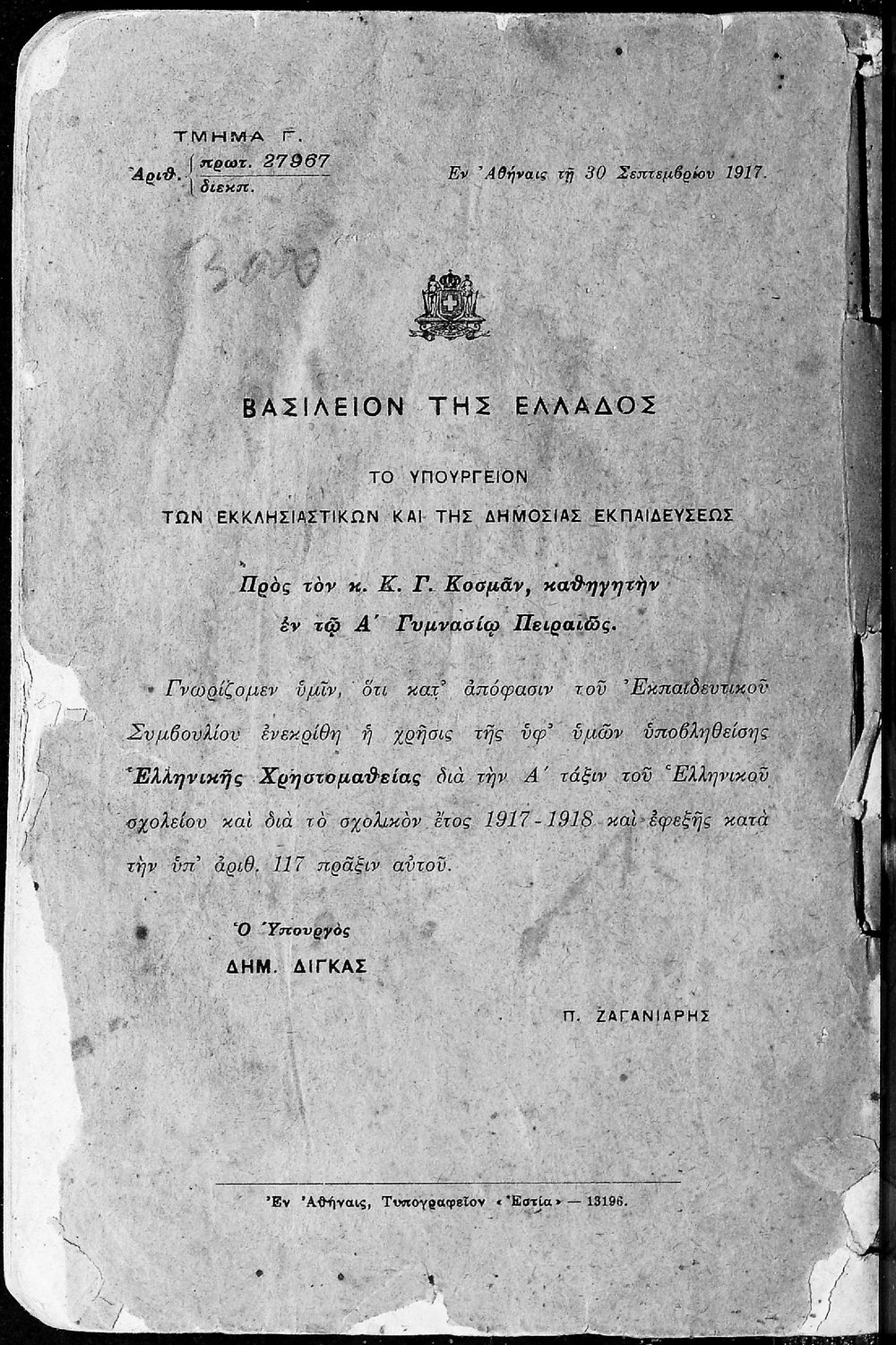 Υπουργική απόφαση / Σύμβαση: 27967/30-9-1917