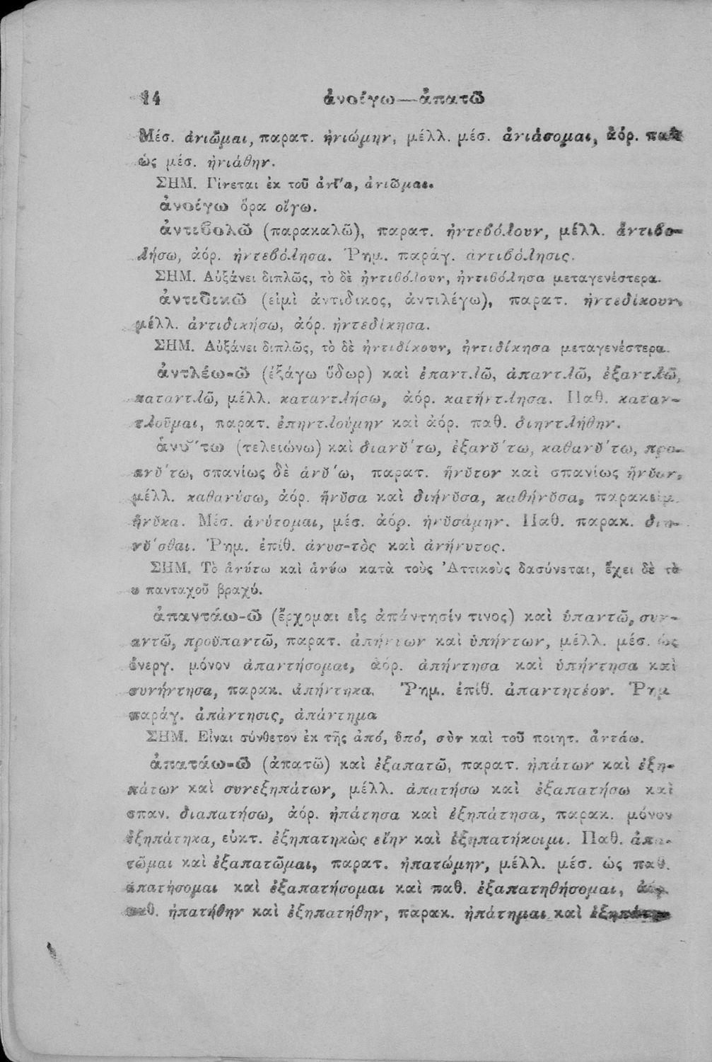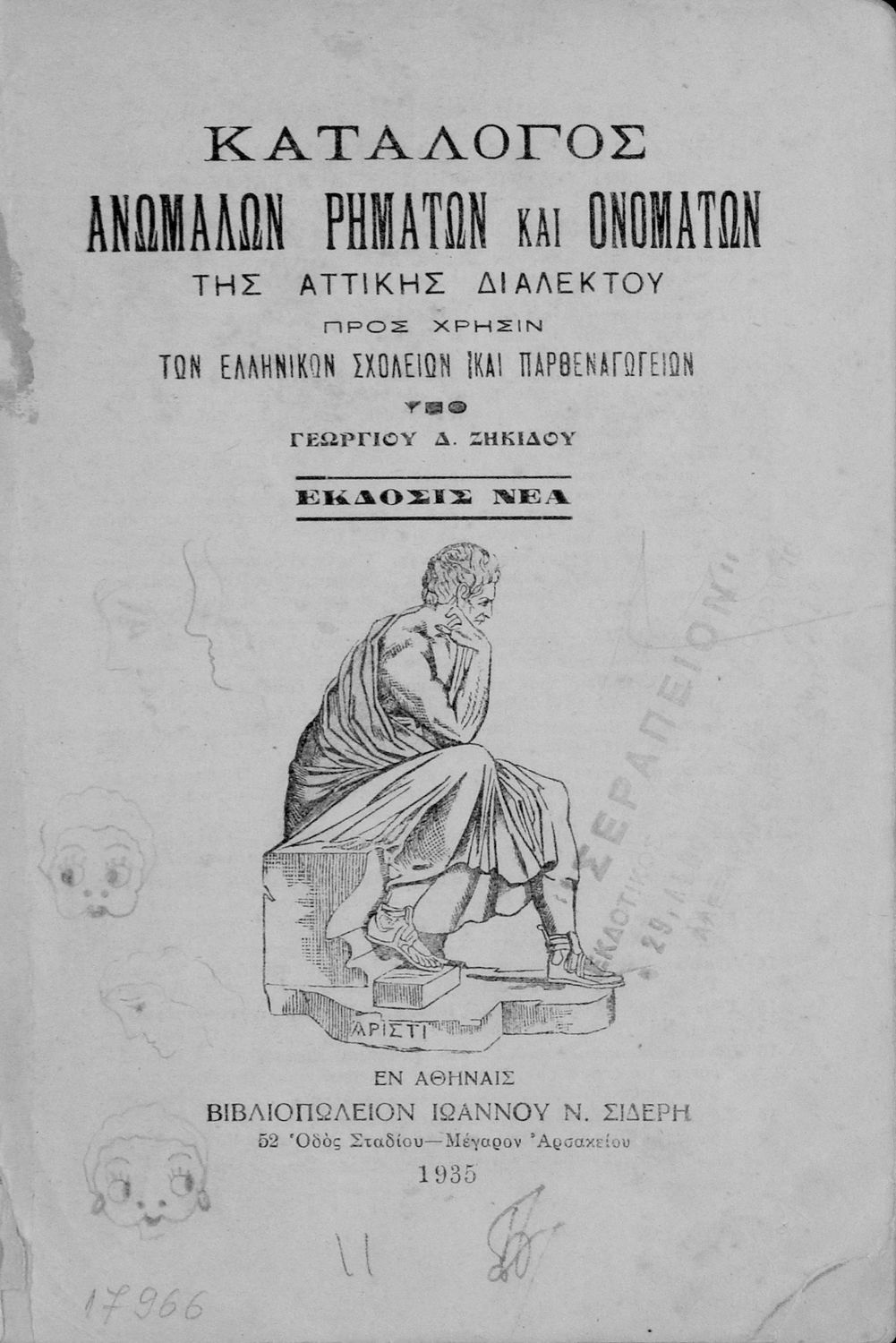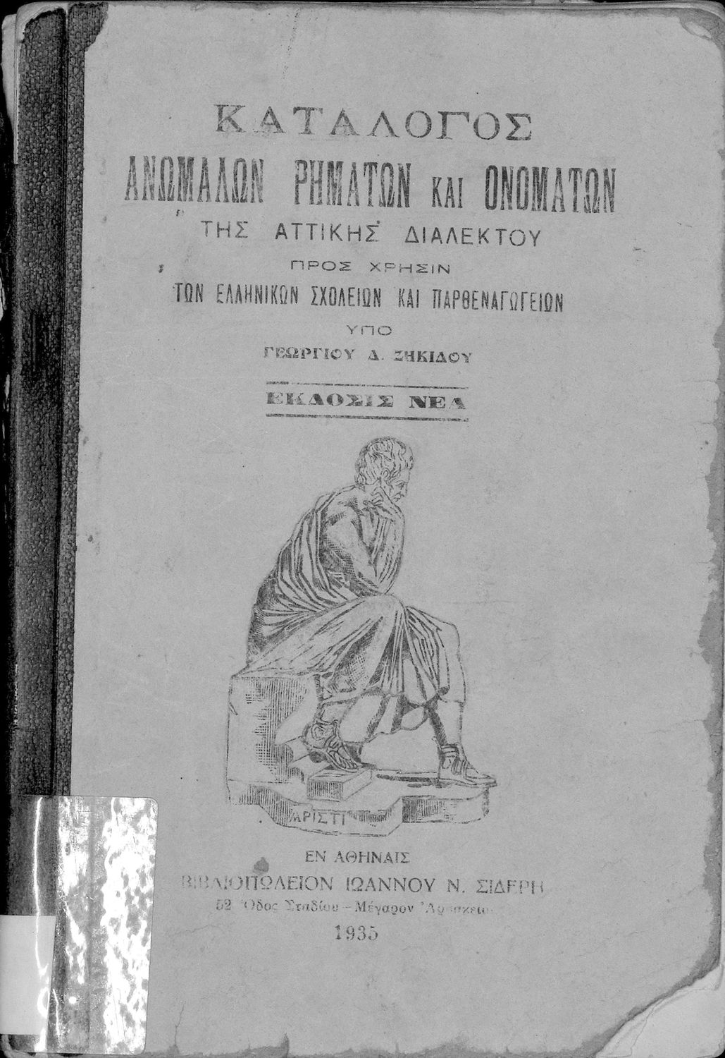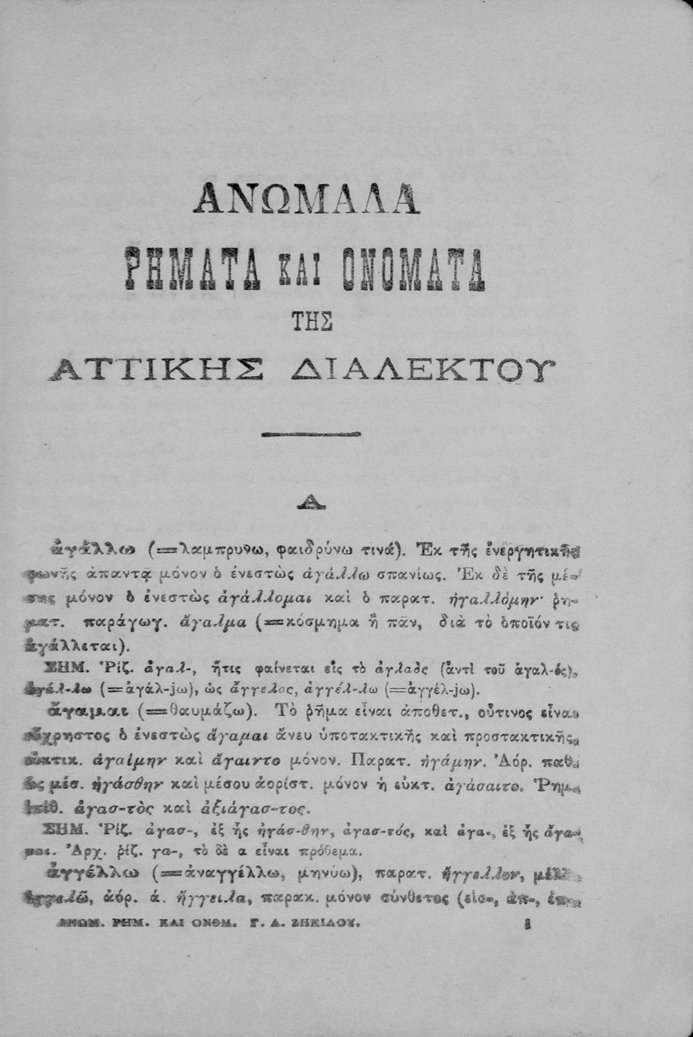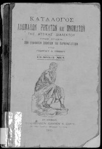Μαθητικό βοήθημα Αρχαίων Ελληνικών Ελληνικού Σχολείου και Παρθεναγωγείου που περιέχει κατάλογο των ανώμαλων ρημάτων και ονομάτων της αρχαίας ελληνικής γραμματείας και ετυμολογικές, γραμματικές και σημασιολογικές παρατηρήσεις..
