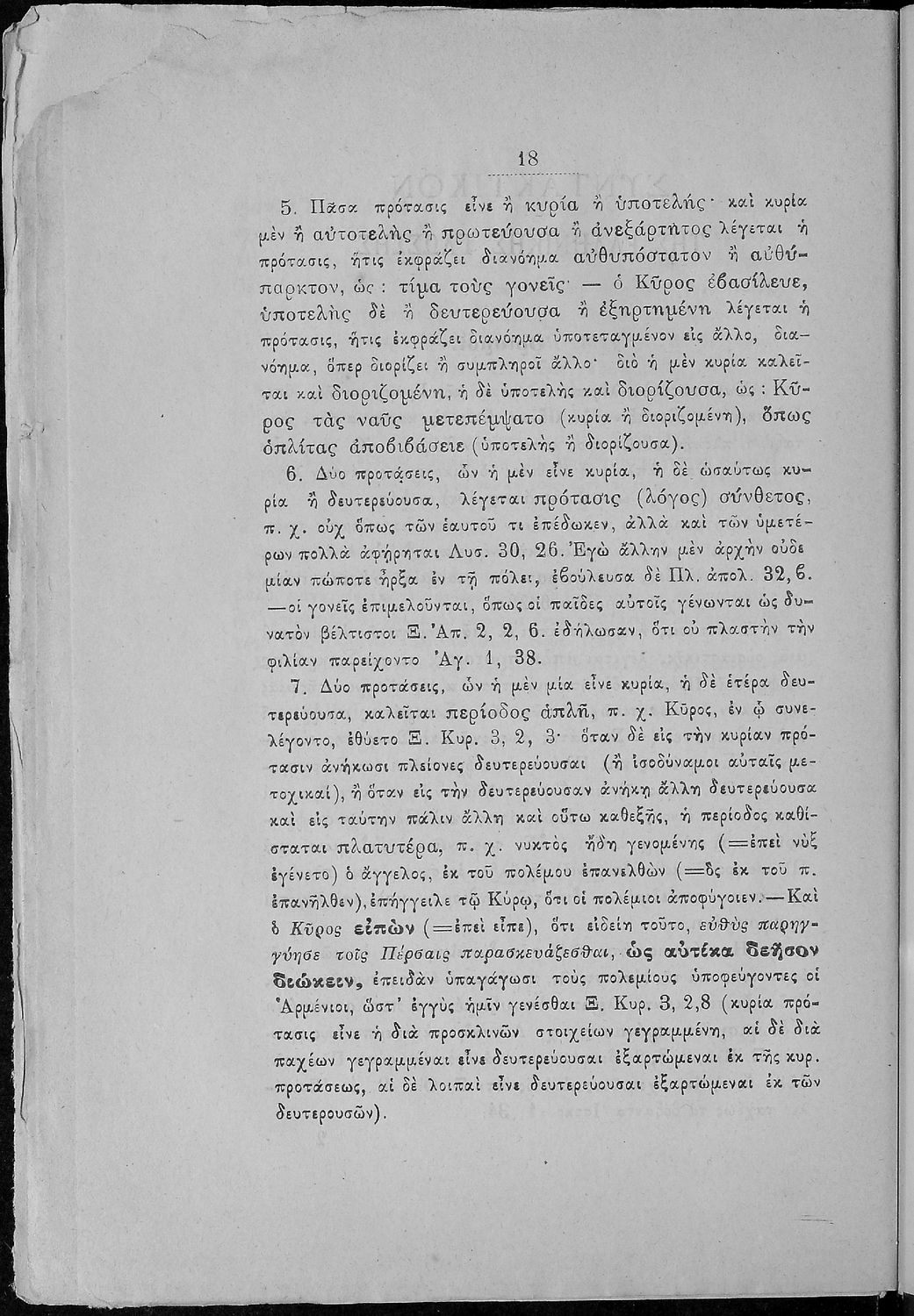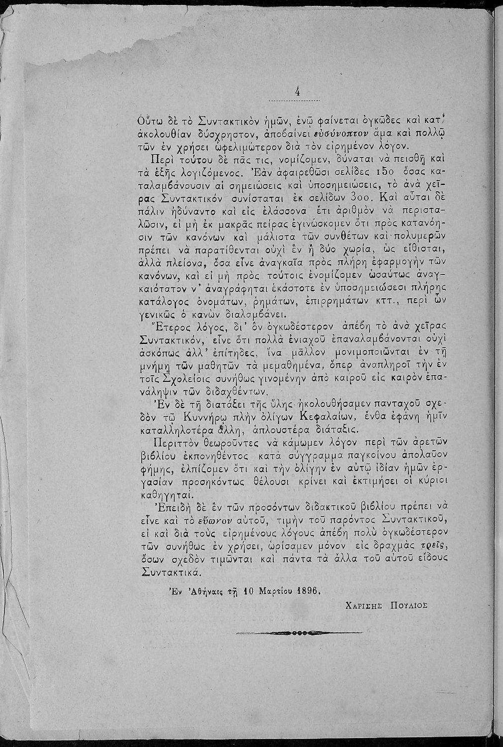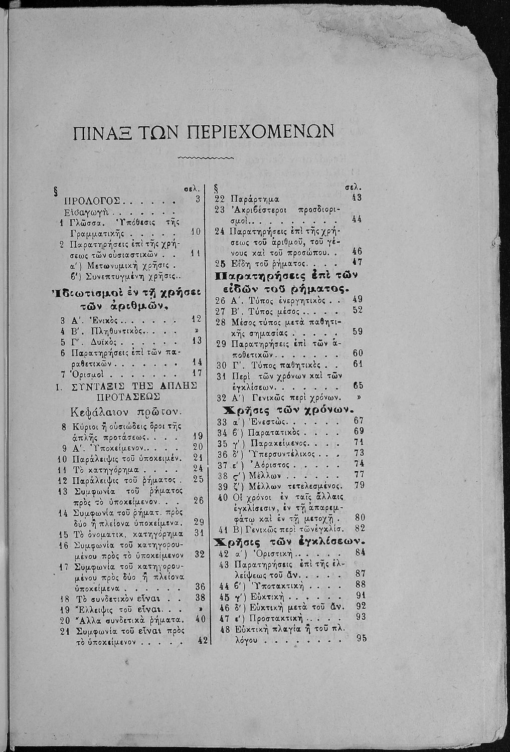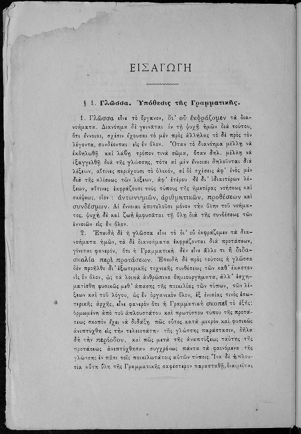 Σχολικό εγχειρίδιο Αρχαίων Ελληνικών για τα Ελληνικά Σχολεία και Παρθεναγωγεία που περιέχει τους κανόνες γραμματικής και είναι χωρισμένο σε φθογγολογικό, τυπολογικό και ετυμολογικό μέρος.