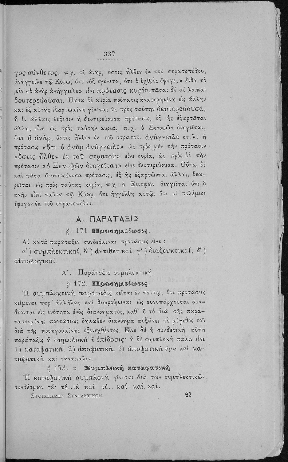 Σχολικό εγχειρίδιο Αρχαίων Ελληνικών για τα Ελληνικά Σχολεία και Παρθεναγωγεία που περιέχει τους κανόνες γραμματικής και είναι χωρισμένο σε φθογγολογικό, τυπολογικό και ετυμολογικό μέρος.