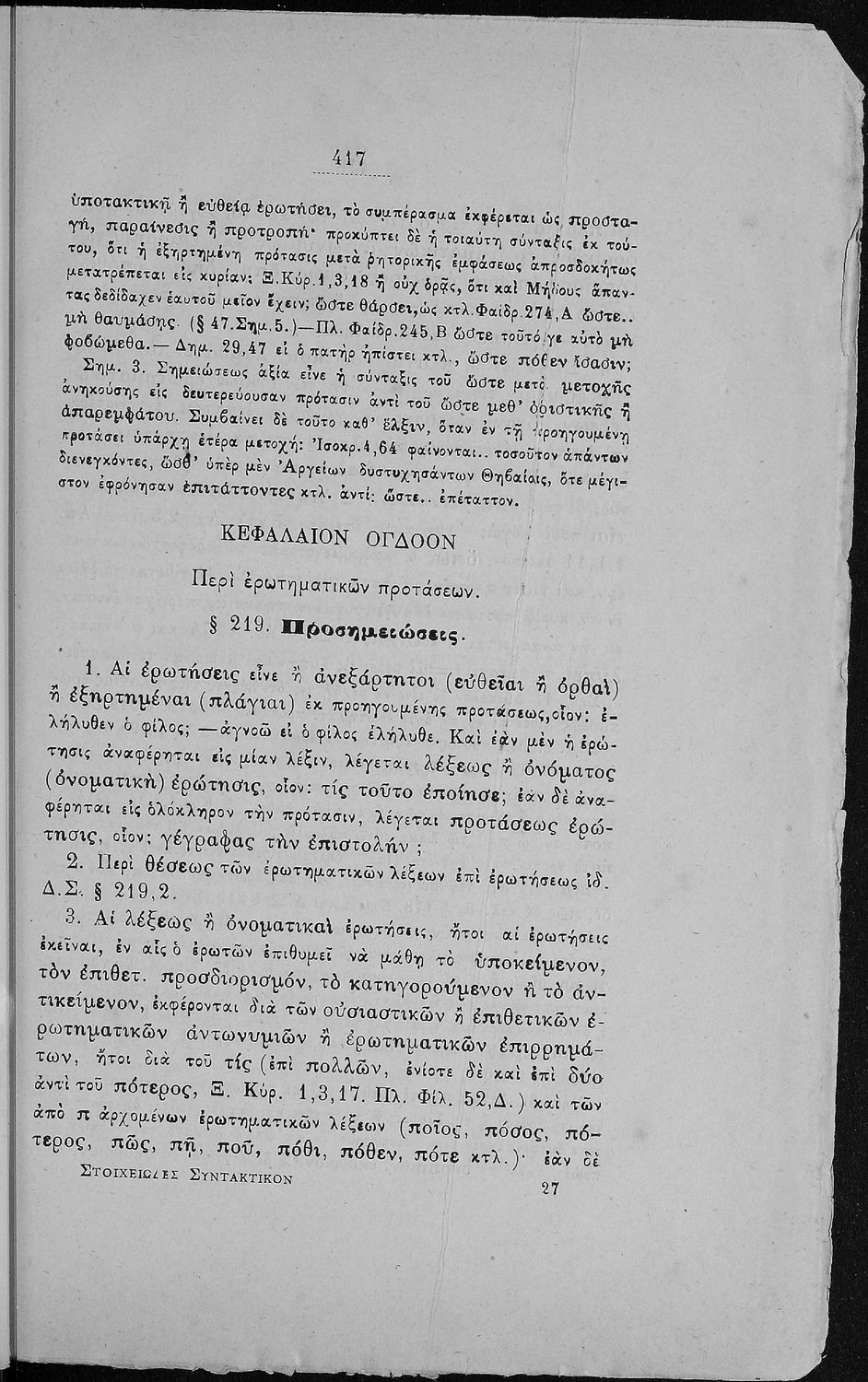 Σχολικό εγχειρίδιο Αρχαίων Ελληνικών για τα Ελληνικά Σχολεία και Παρθεναγωγεία που περιέχει τους κανόνες γραμματικής και είναι χωρισμένο σε φθογγολογικό, τυπολογικό και ετυμολογικό μέρος.
