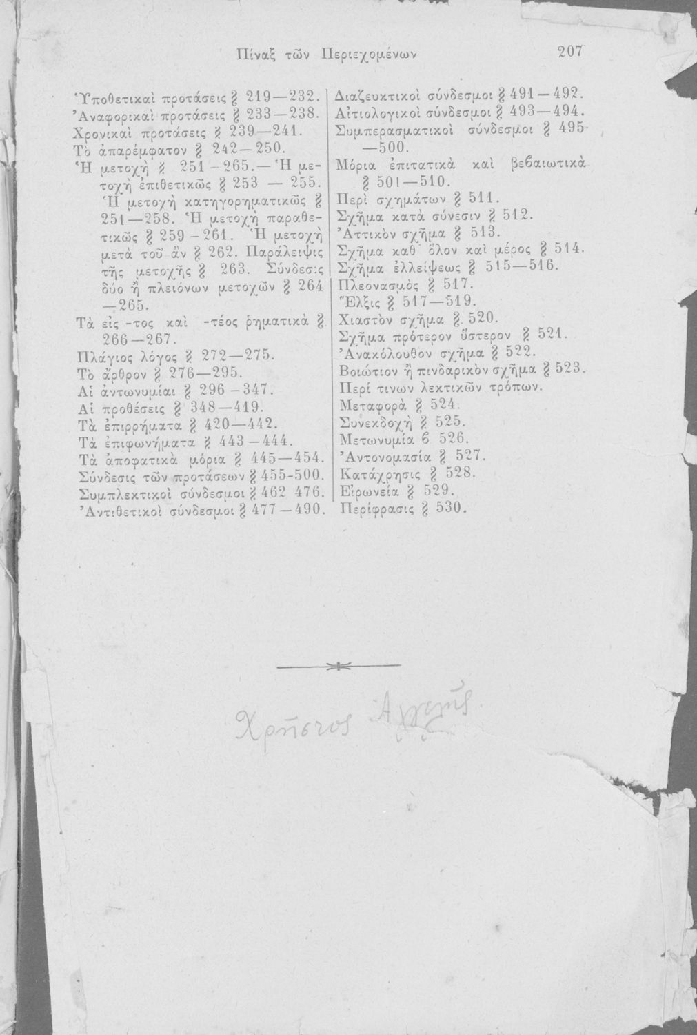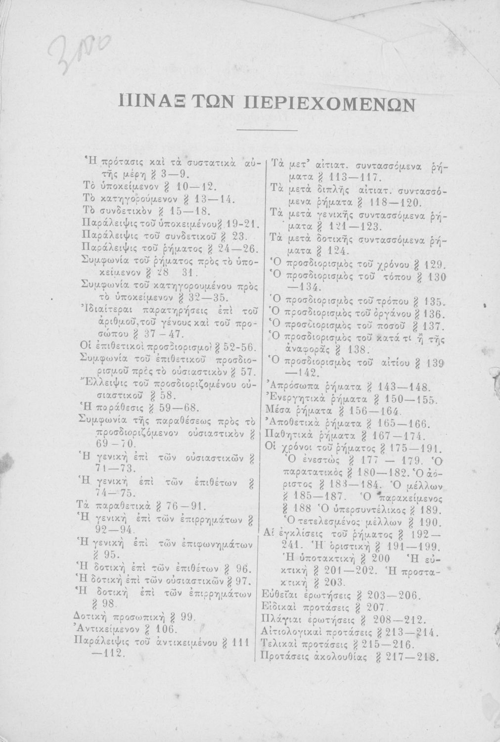 Βαθμίδα εκπαίδευσης: Δευτεροβάθμια Τάξη: Γυμνάσιο Μάθημα: Αρχαία Ελληνικά Γλώσσα: Καθαρεύουσα Παρουσίαση περιεχομένου: Σχολικό εγχειρίδιο Αρχαίων Ελληνικών Γυμνασίου που εξετάζει τα μέρη του λόγου και την σύνταξή τους. |