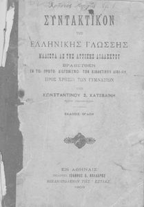 Σχολικό εγχειρίδιο Αρχαίων Ελληνικών για τα Ελληνικά Σχολεία, Παρθεναγωγεία και Γυμνάσια που περιέχει τους κανόνες γραμματικής και είναι χωρισμένο σε φθογγολογικό, τυπολογικό και ετυμολογικό μέρος.