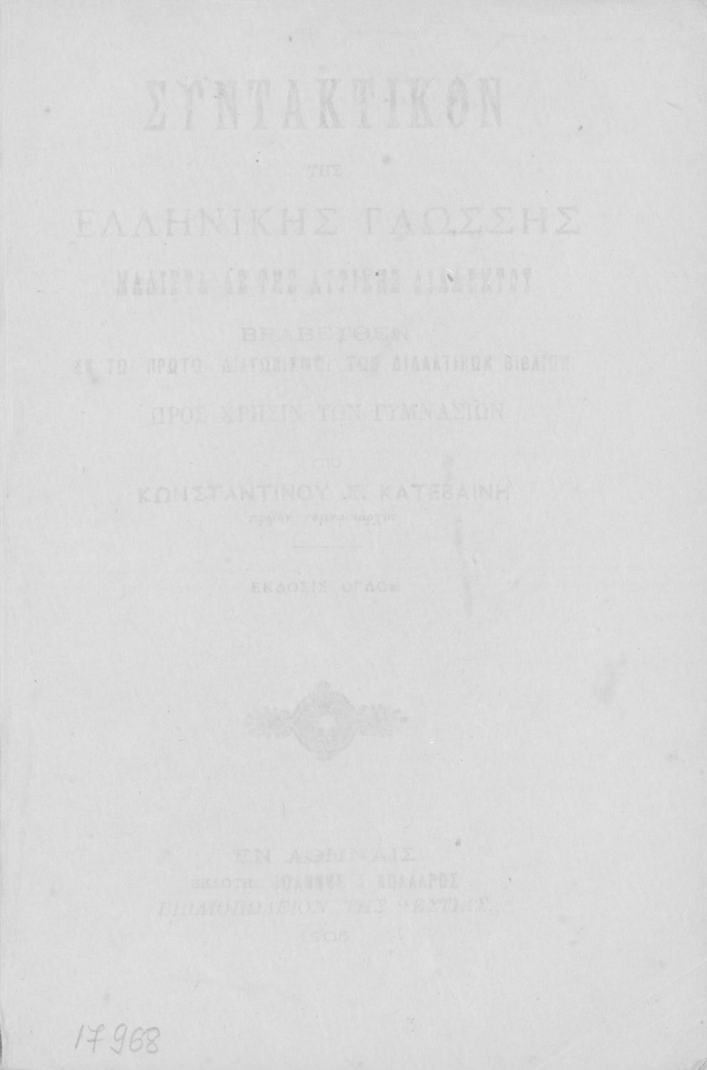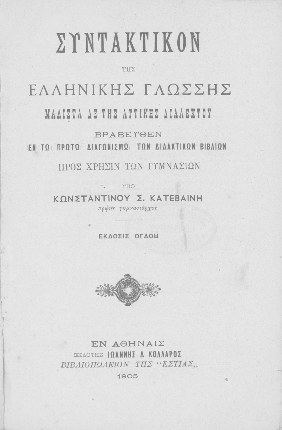 Τίτλος: Συντακτικόν της ελληνικής γλώσσας μάλιστα δε της Αττικής Διαλέκτου προς χρήσιν των Γυμνασίων