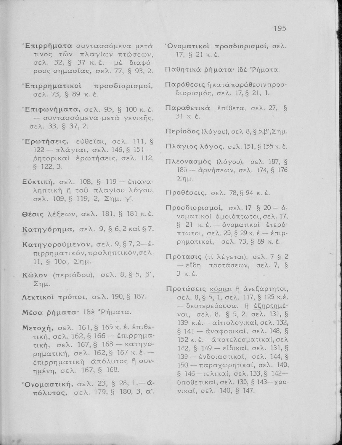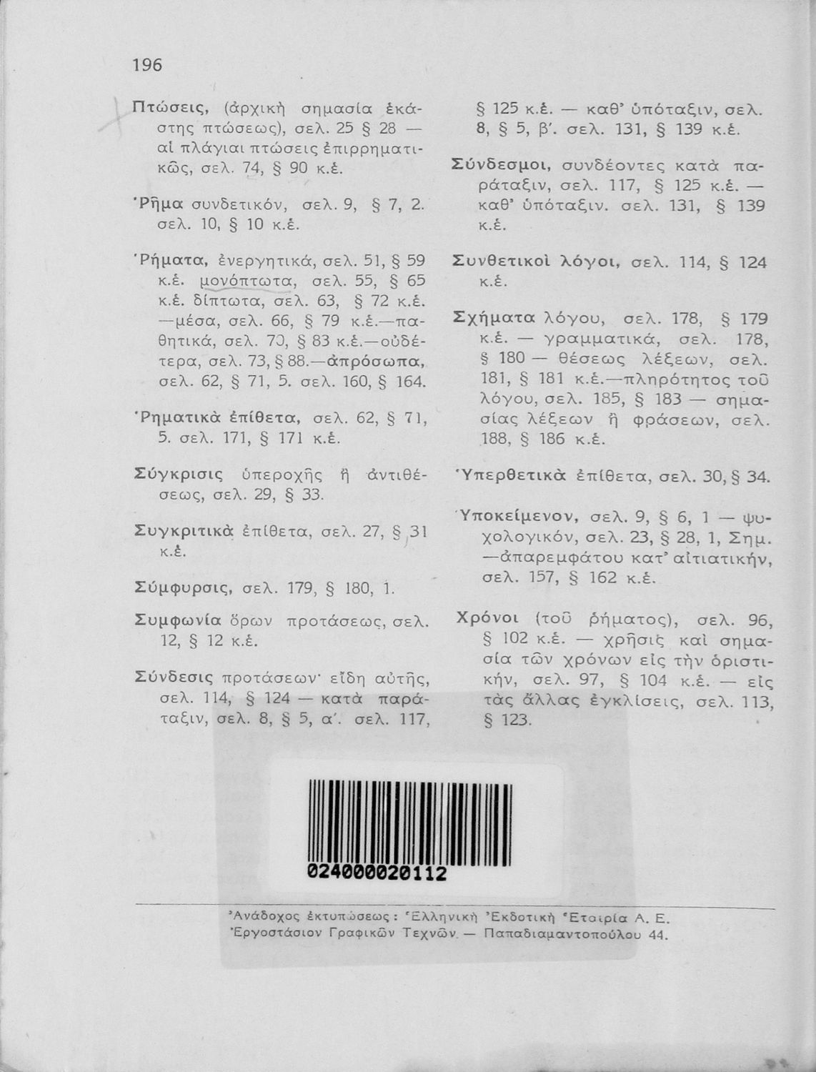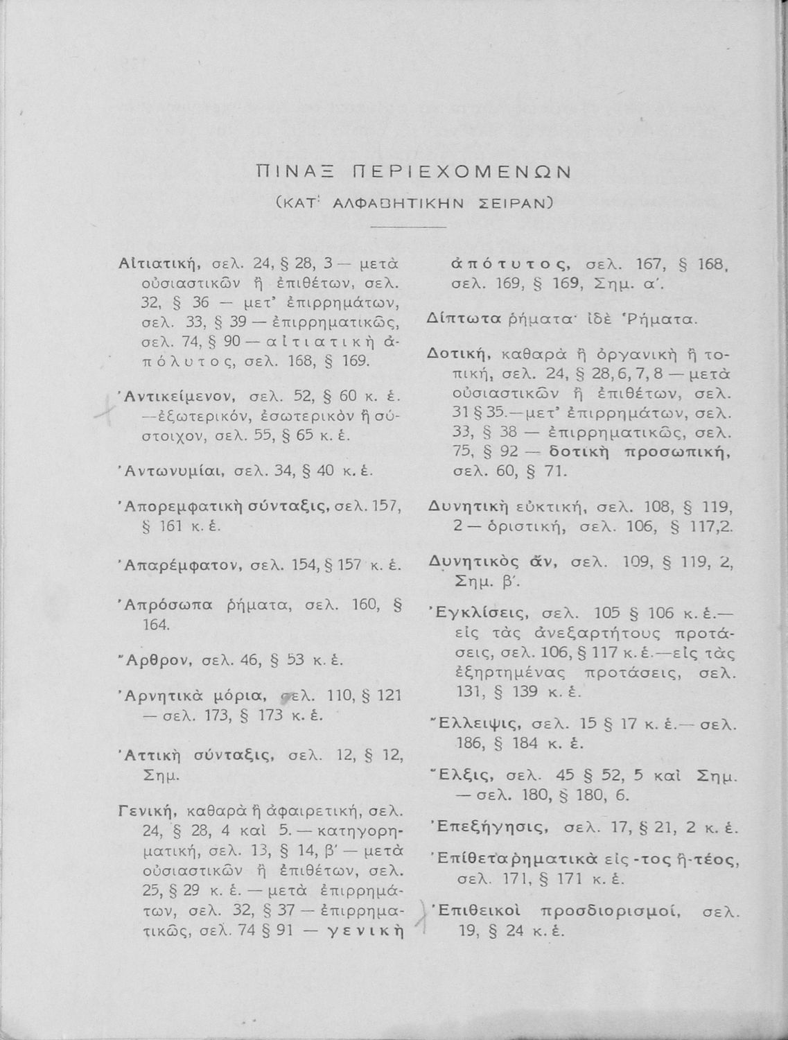 Κωδικός αναγνώρισης: 01-17969 Τίτλος: Συντακτικόν της αρχαίας ελληνικής γλώσσης προς χρήσιν των μαθητών των ανωτέρων τάξεων των Εξαταξίων Γυμνασίων νέου τύπου Συγγραφέας: Αχιλλέας Τζάρτζανος Μέγεθος και υπόστρωμα: Σχολικό εγχειρίδιο, 20εκ., σκληρό εξώφυλλο, 112 σελίδες. |
