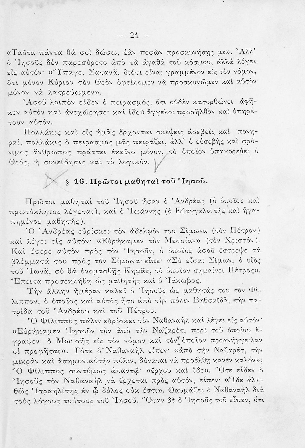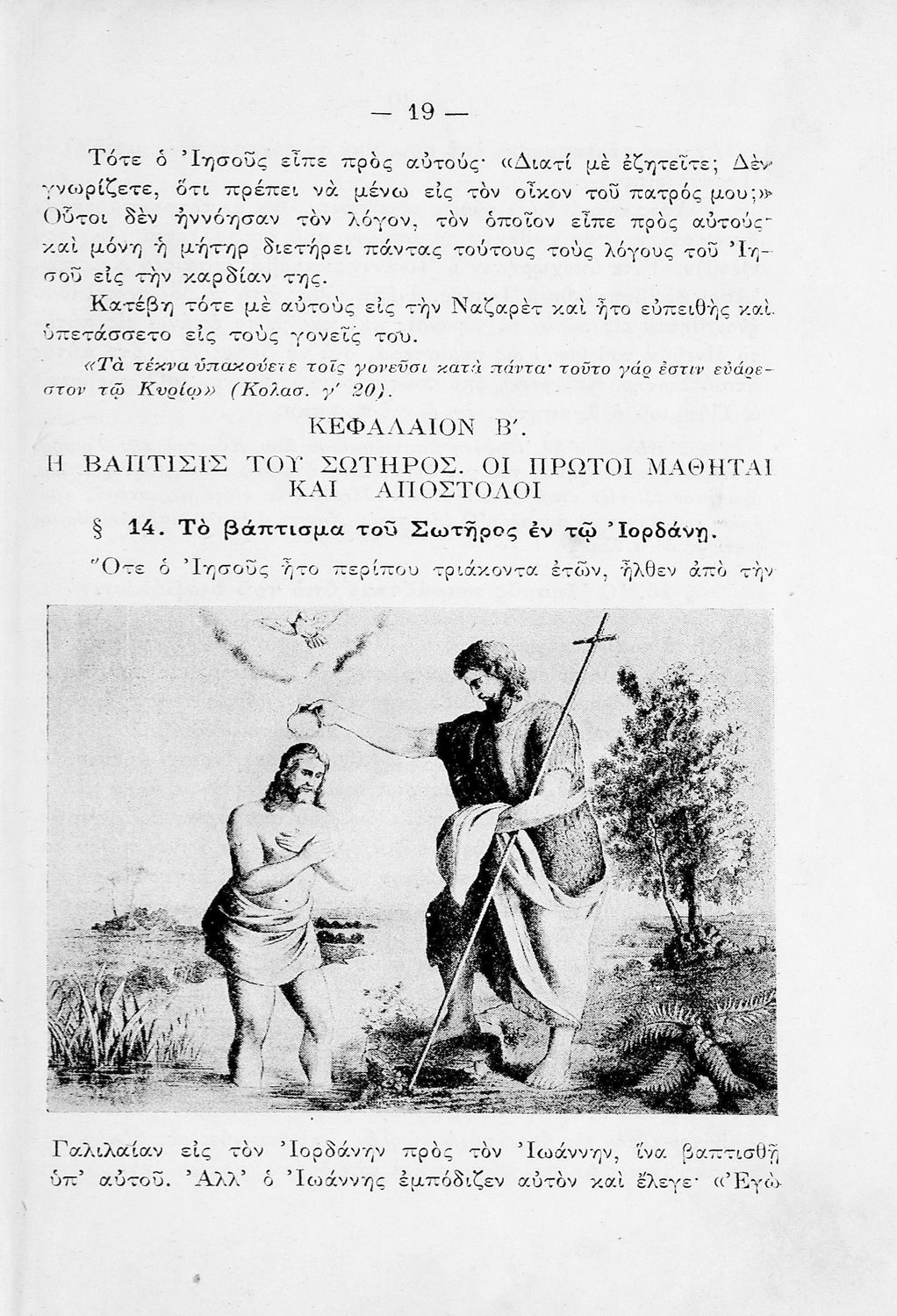 Σχολικό εγχειρίδιο Θρησκευτικών για τα Ελληνικά Σχολεία και τα Παρθεναγωγεία που περιλαμβάνει την ιστορία της Καινής Διαθήκης από τον Ευαγγελισμό της Θεοτόκου μέχρι την ανάληψη του Ιησού Χριστού