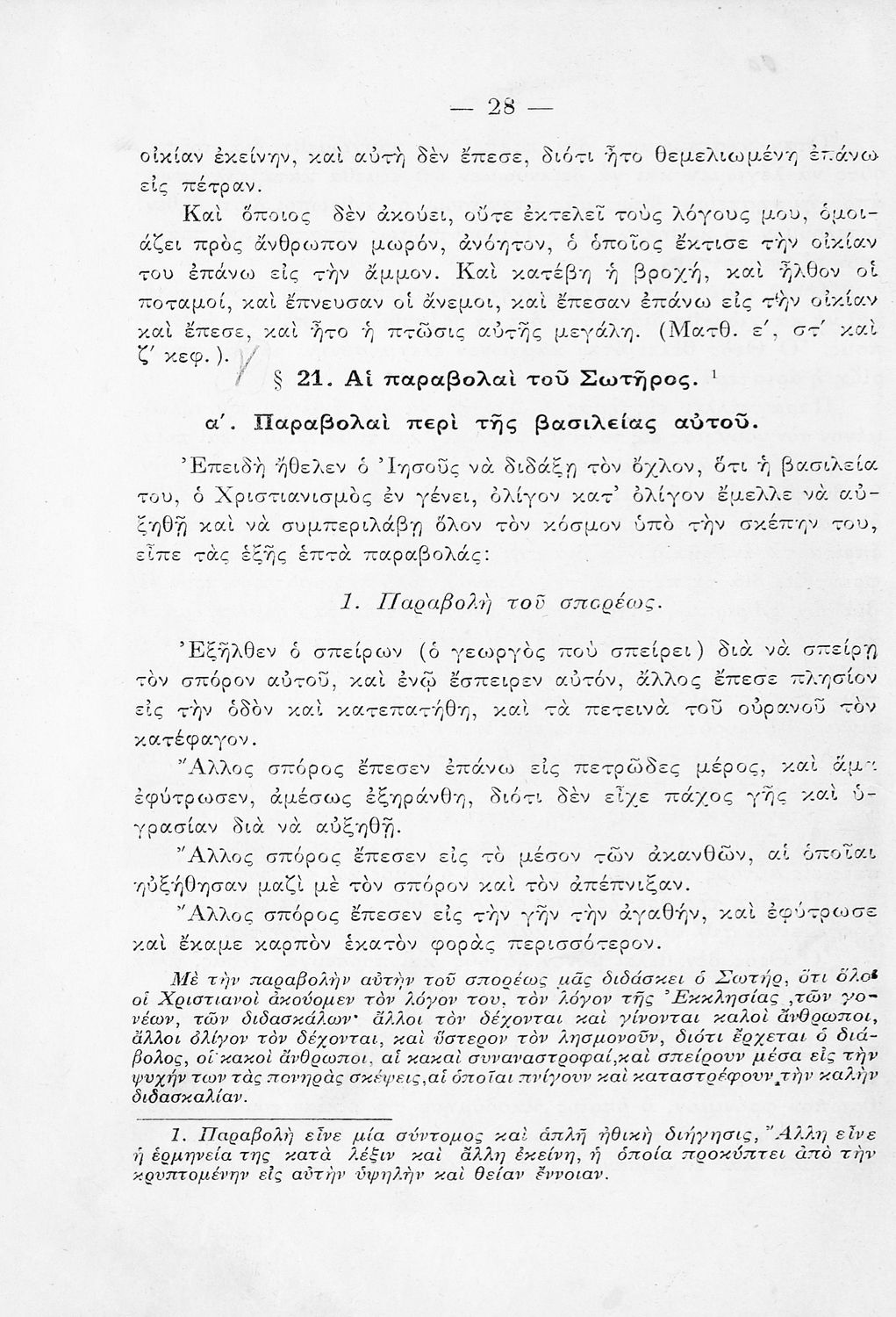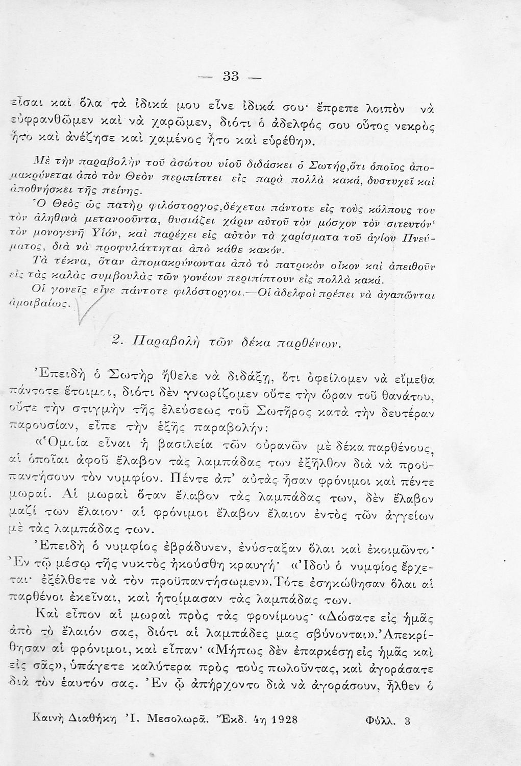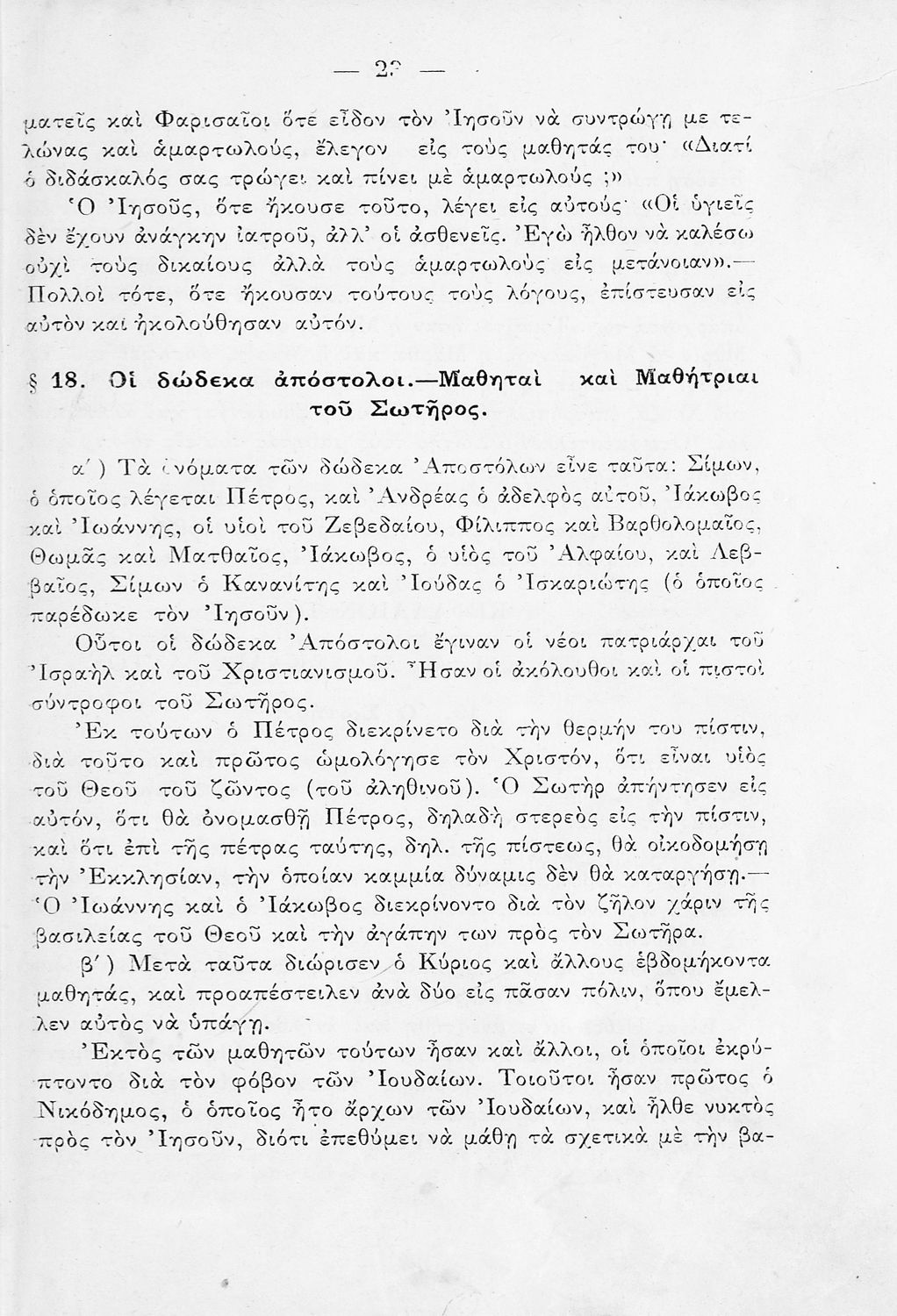 Σχολικό εγχειρίδιο Θρησκευτικών για τα Ελληνικά Σχολεία και τα Παρθεναγωγεία που αποτελεί μια εξιστόρηση της Καινής Διαθήκης από την γέννηση του Ιησού Χριστού ως το έργο των Αποστόλων