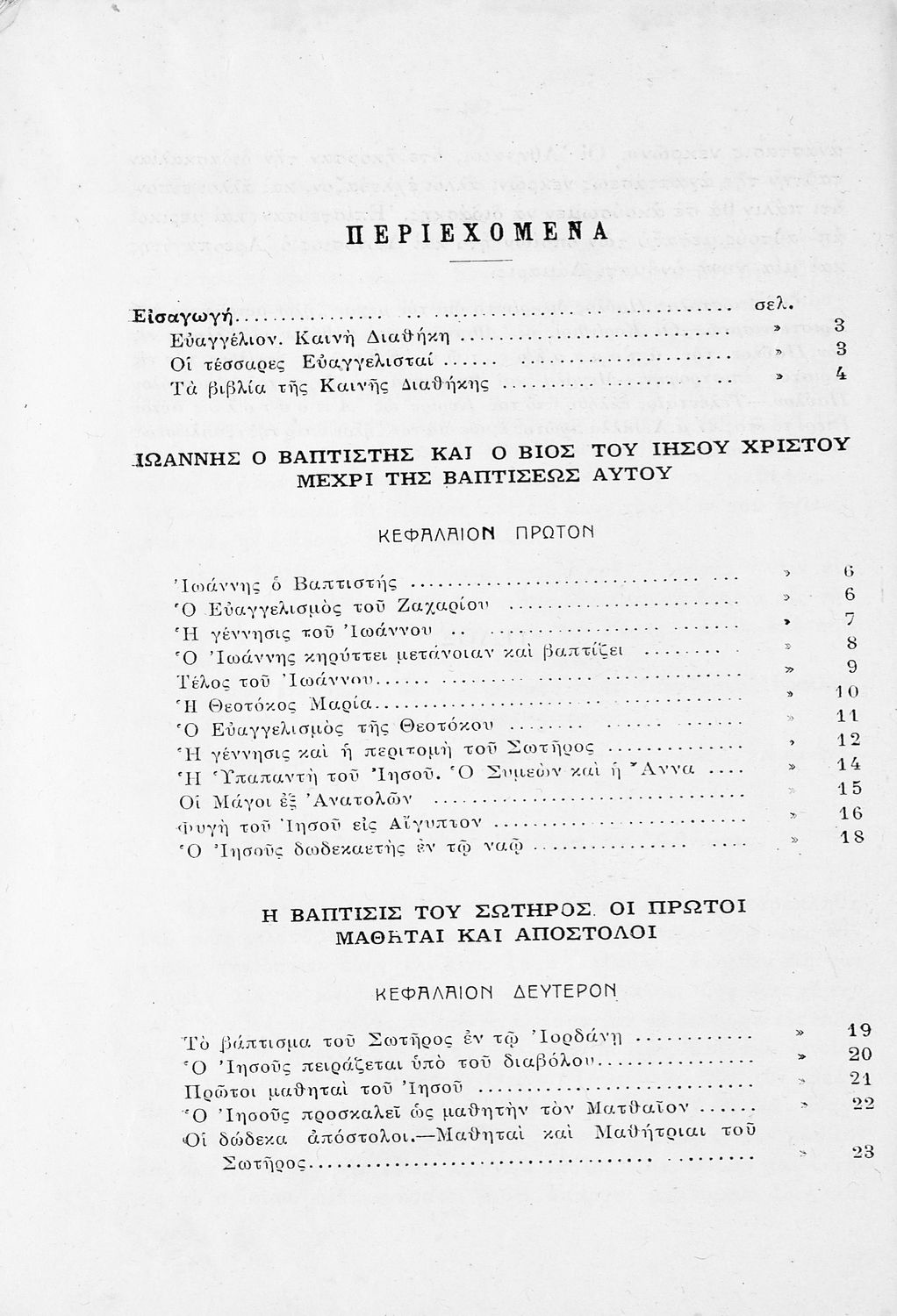 Σχολικό εγχειρίδιο Θρησκευτικών για τα Ελληνικά Σχολεία και Παρθεναγωγεία που συνιστά μία εξιστόρηση της Καινής Διαθήκης από τη γέννηση της Θεοτόκου ως την ανάληψη του Χριστού και τη δράση των Αποστόλων.
