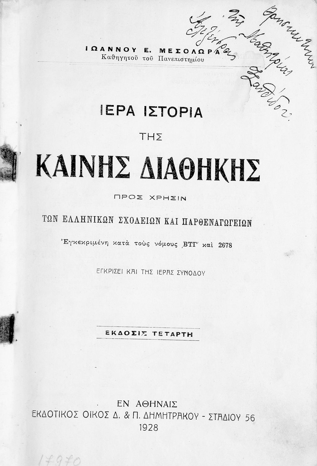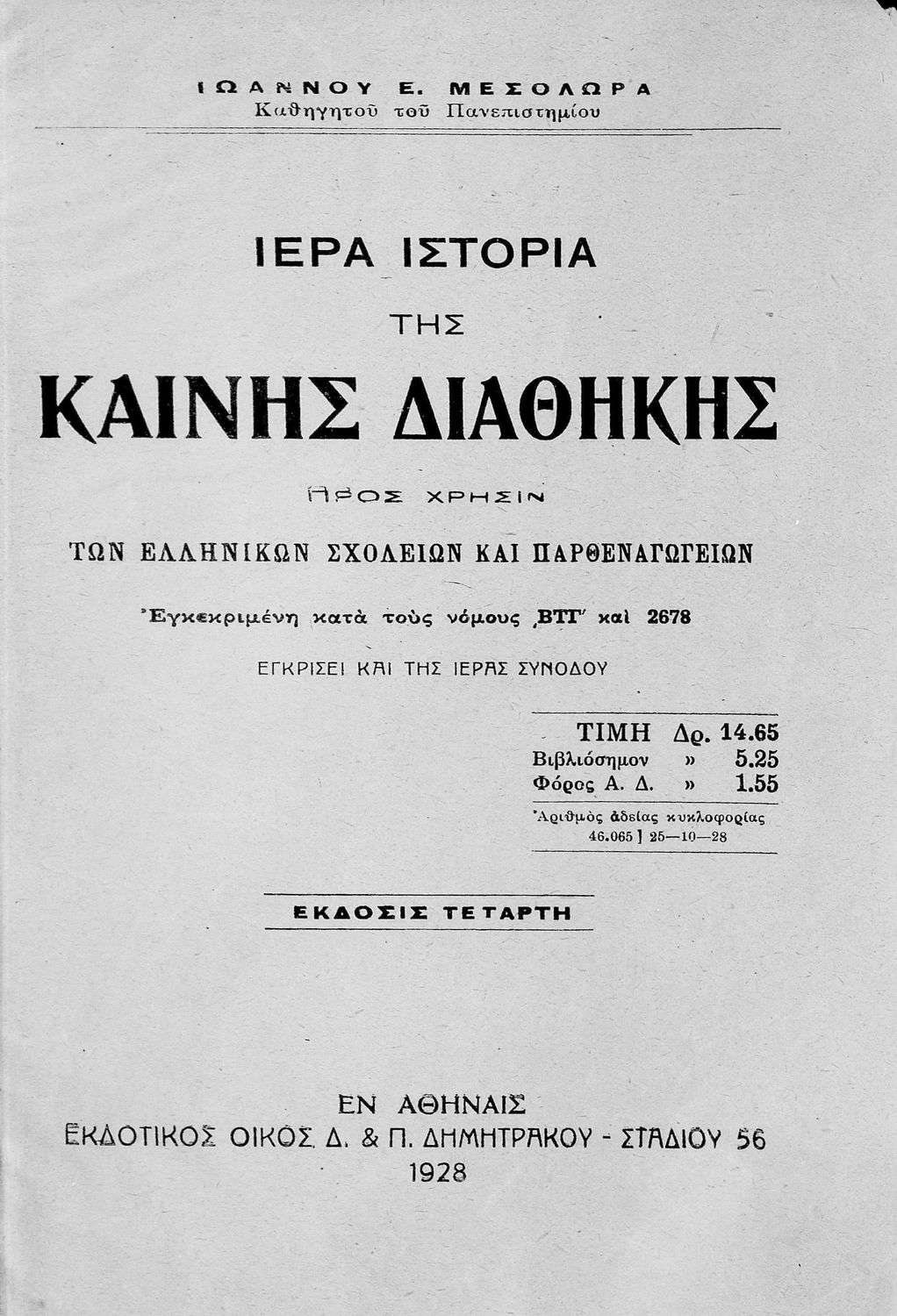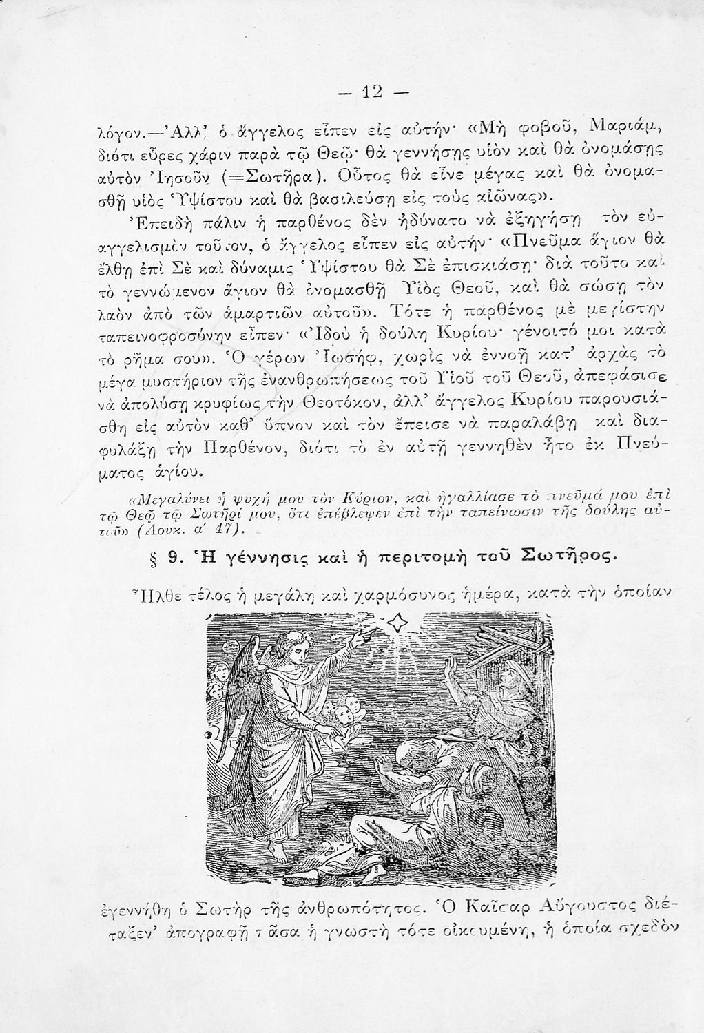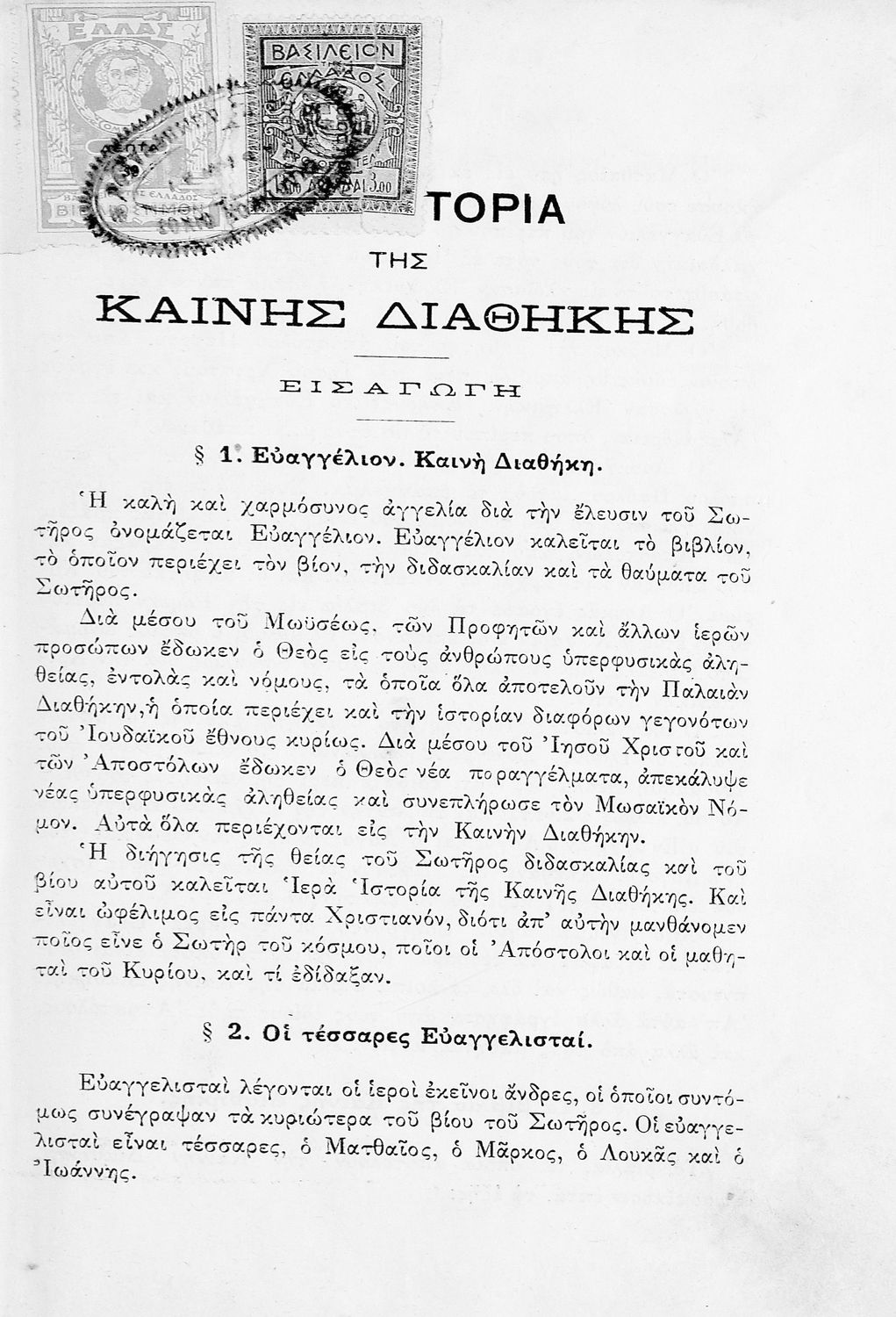 Σχολικό εγχειρίδιο Θρησκευτικών για τα Ελληνικά Σχολεία και τα Παρθεναγωγεία που περιλαμβάνει την ιστορία της Καινής Διαθήκης από τον Ευαγγελισμό της Θεοτόκου μέχρι την ανάληψη του Ιησού Χριστού