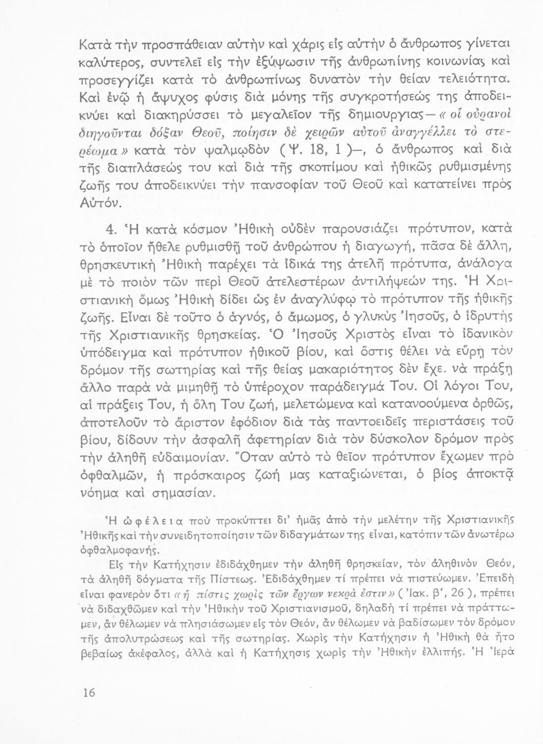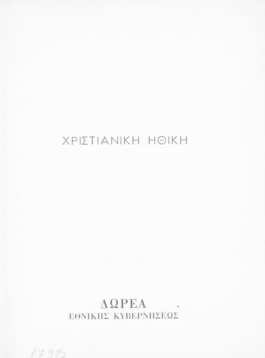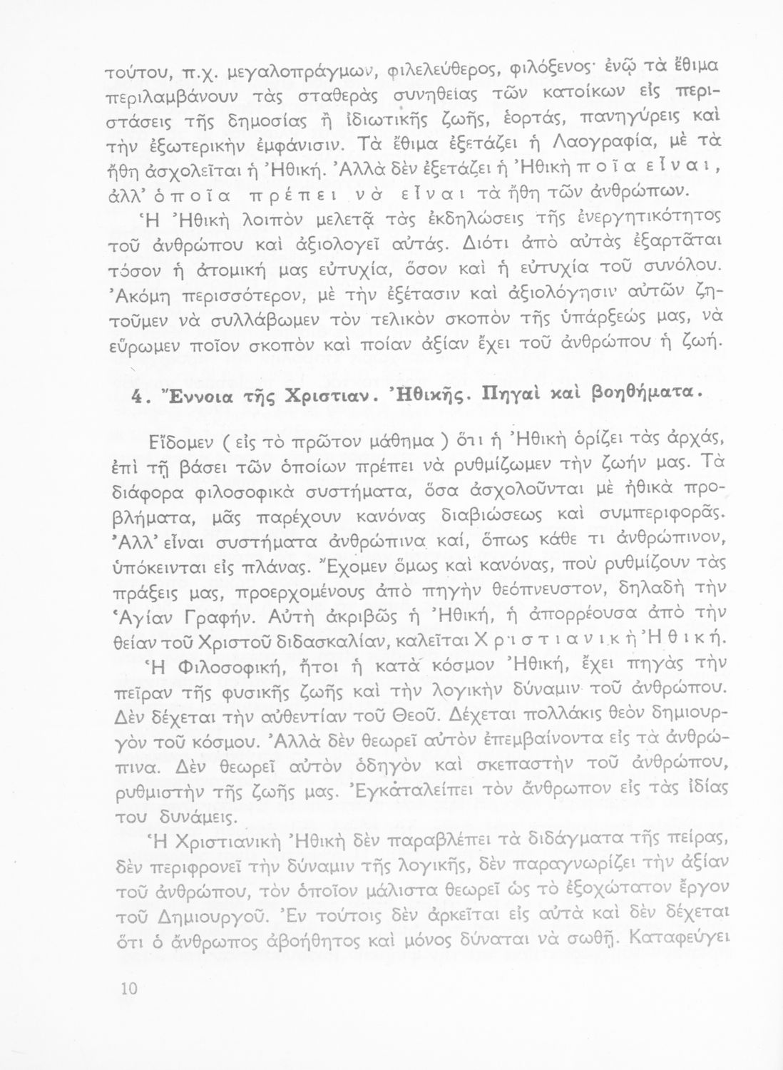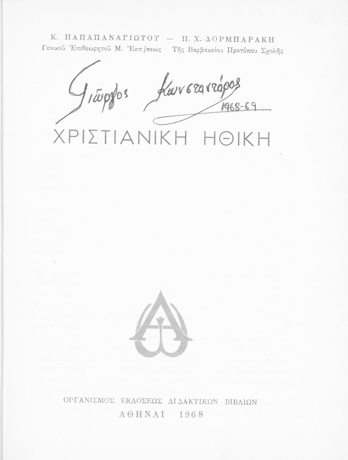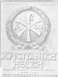 Βαθμίδα εκπαίδευσης: Δευτεροβάθμια Μάθημα: Θρησκευτικά Γλώσσα: Καθαρεύουσα Παρουσίαση περιεχομένου: Σχολικό εγχειρίδιο Θρησκευτικών που πραγματεύεται την έννοια της αρετής και της ηθικής, της αμαρτίας και της λύτρωσης, της δικαιοσύνης και της αγάπης όπως αυτή ορίζεται από το Χριστιανισμό. Φέρει το σύμβολο της δικτατορίας. |