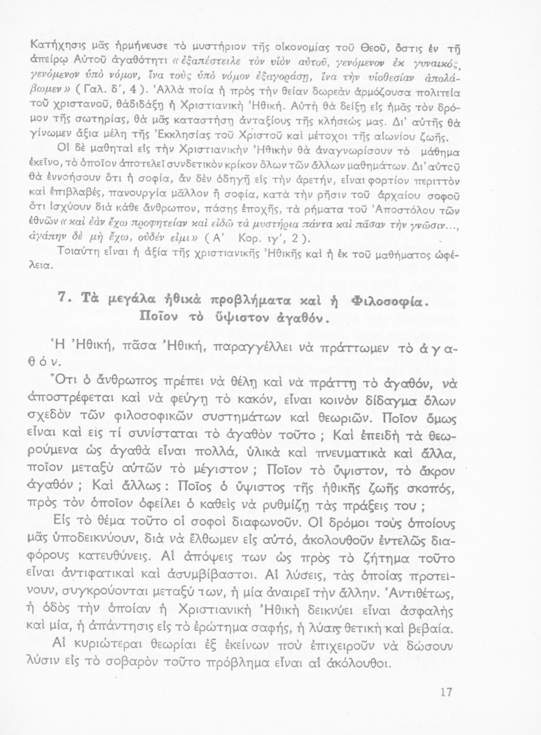 Σχολικό εγχειρίδιο Θρησκευτικών που πραγματεύεται την έννοια της αρετής και της ηθικής, της αμαρτίας και της λύτρωσης, της δικαιοσύνης και της αγάπης όπως αυτή ορίζεται από το Χριστιανισμό. Φέρει το σύμβολο της δικτατορίας.