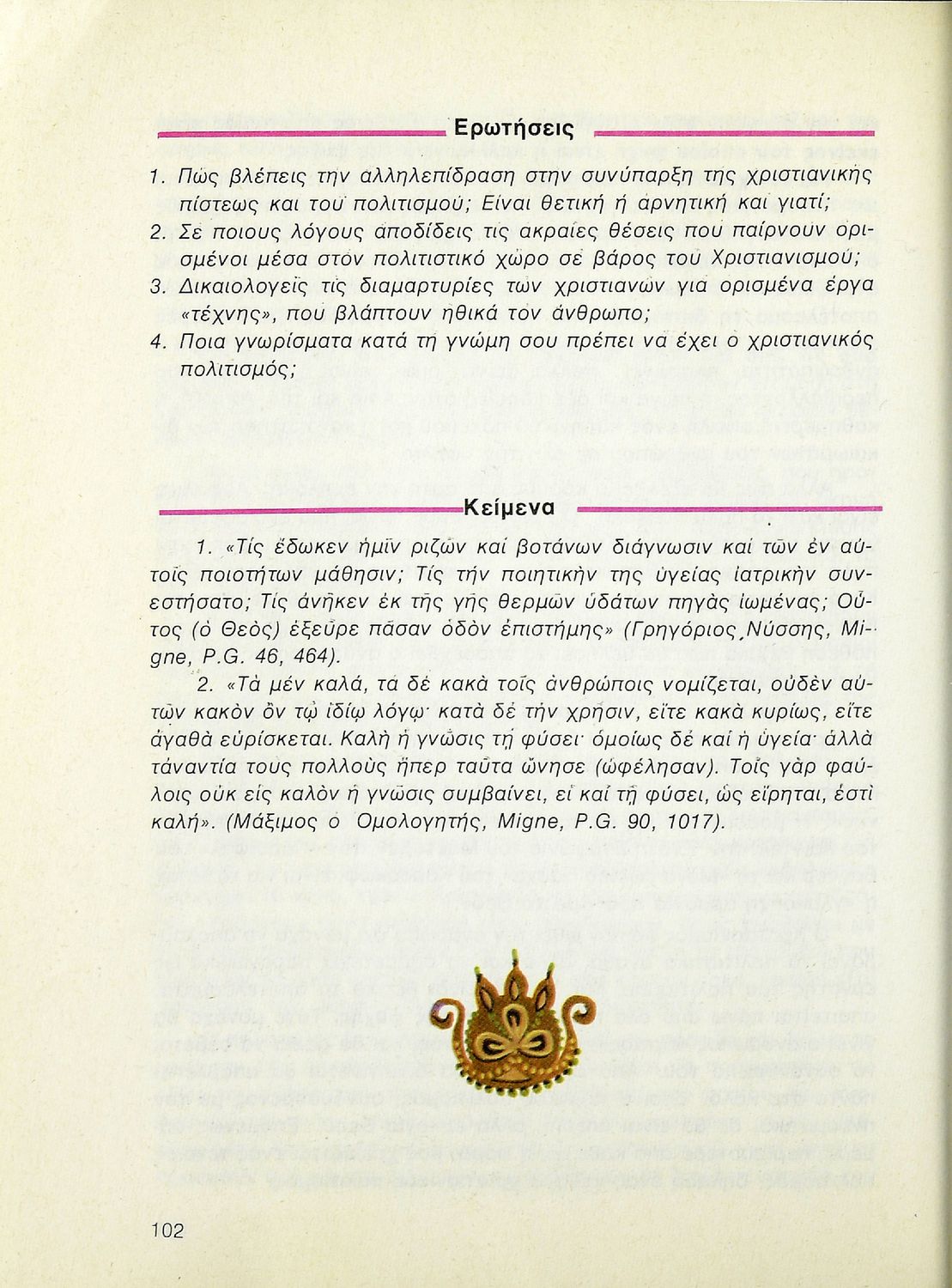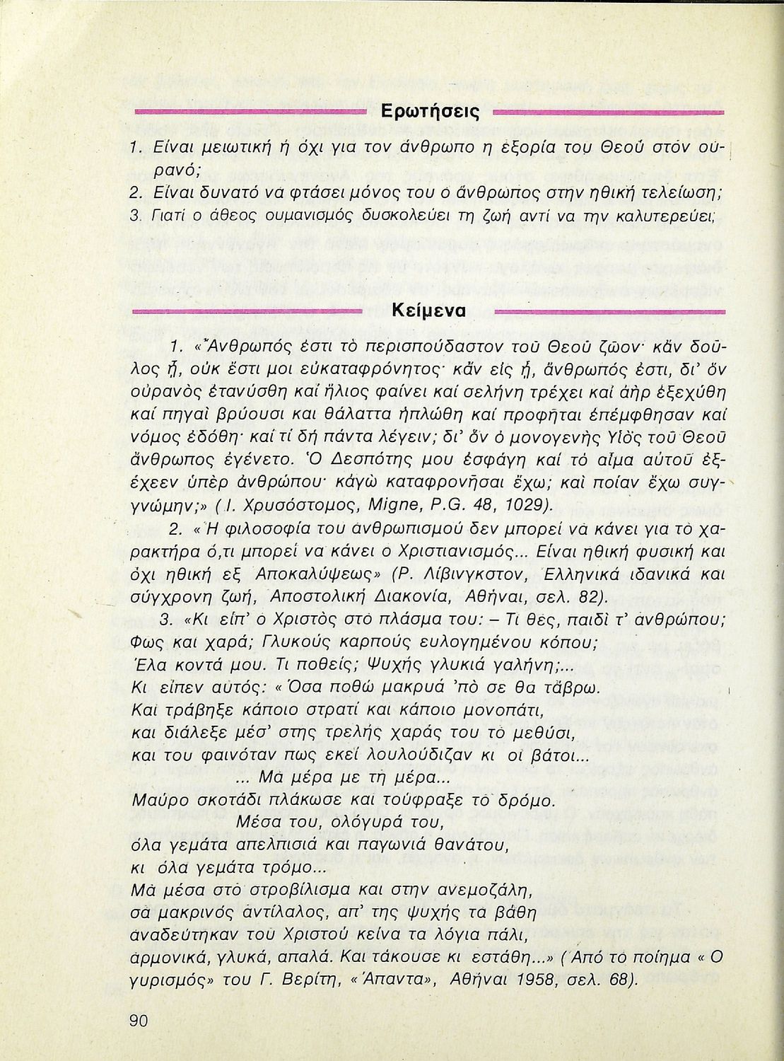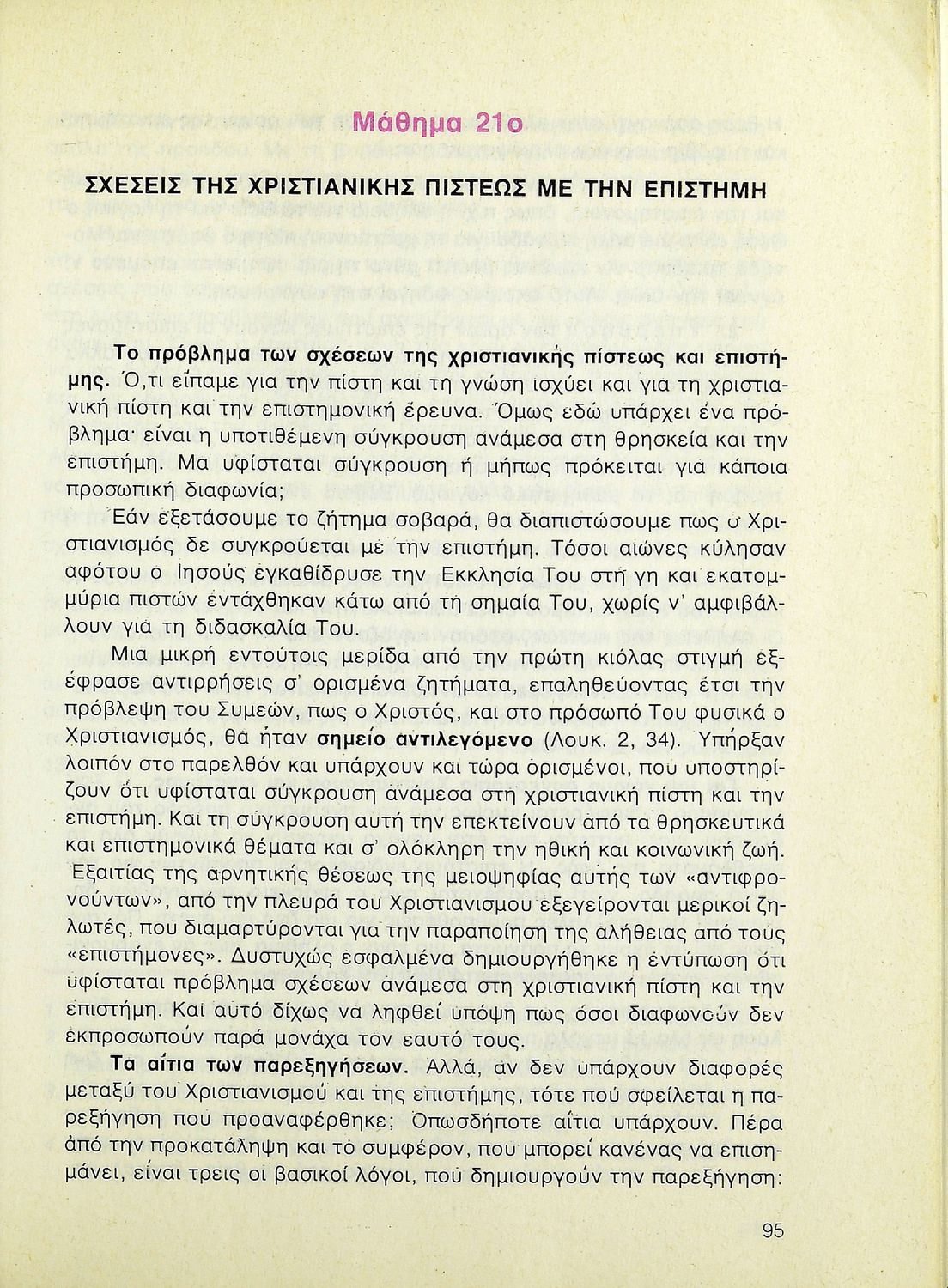 Βαθμίδα εκπαίδευσης: Δευτεροβάθμια Τάξη: Β' Λυκείου Μάθημα: Θρησκευτικά Γλώσσα: Δημοτική Παρουσίαση περιεχομένου: Σχολικό εγχειρίδιο Θρησκευτικών Β΄ Λυκείου που περιλαμβάνει μια συνοπτική παρουσίαση των κυριότερων θρησκειών, αναλύει τη σχέση του χριστιανισμού με τις άλλες θρησκείες, και εστιάζει στις πηγές και τα θρησκευτικά κείμενα της χριστιανικής πίστης. Περιέχει και ερωτήσεις κατανόησης. |