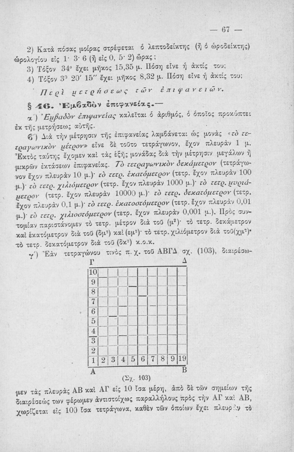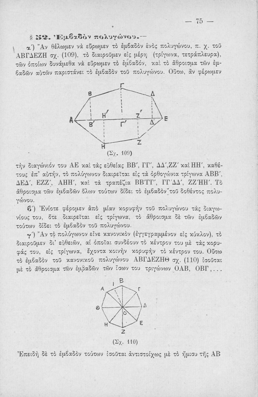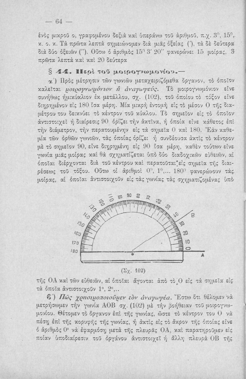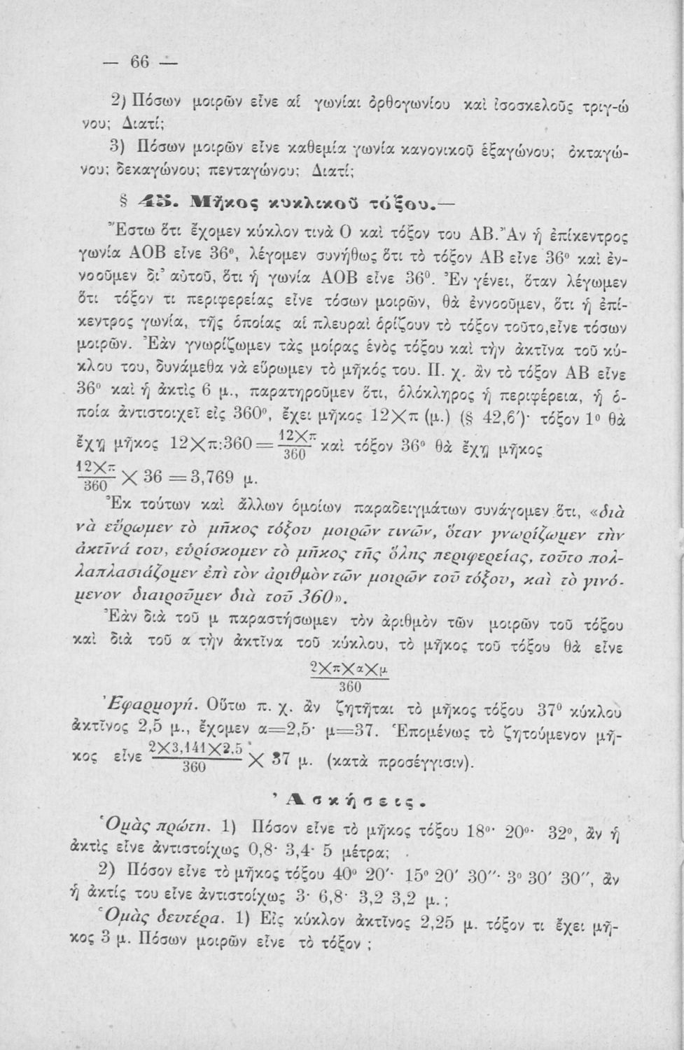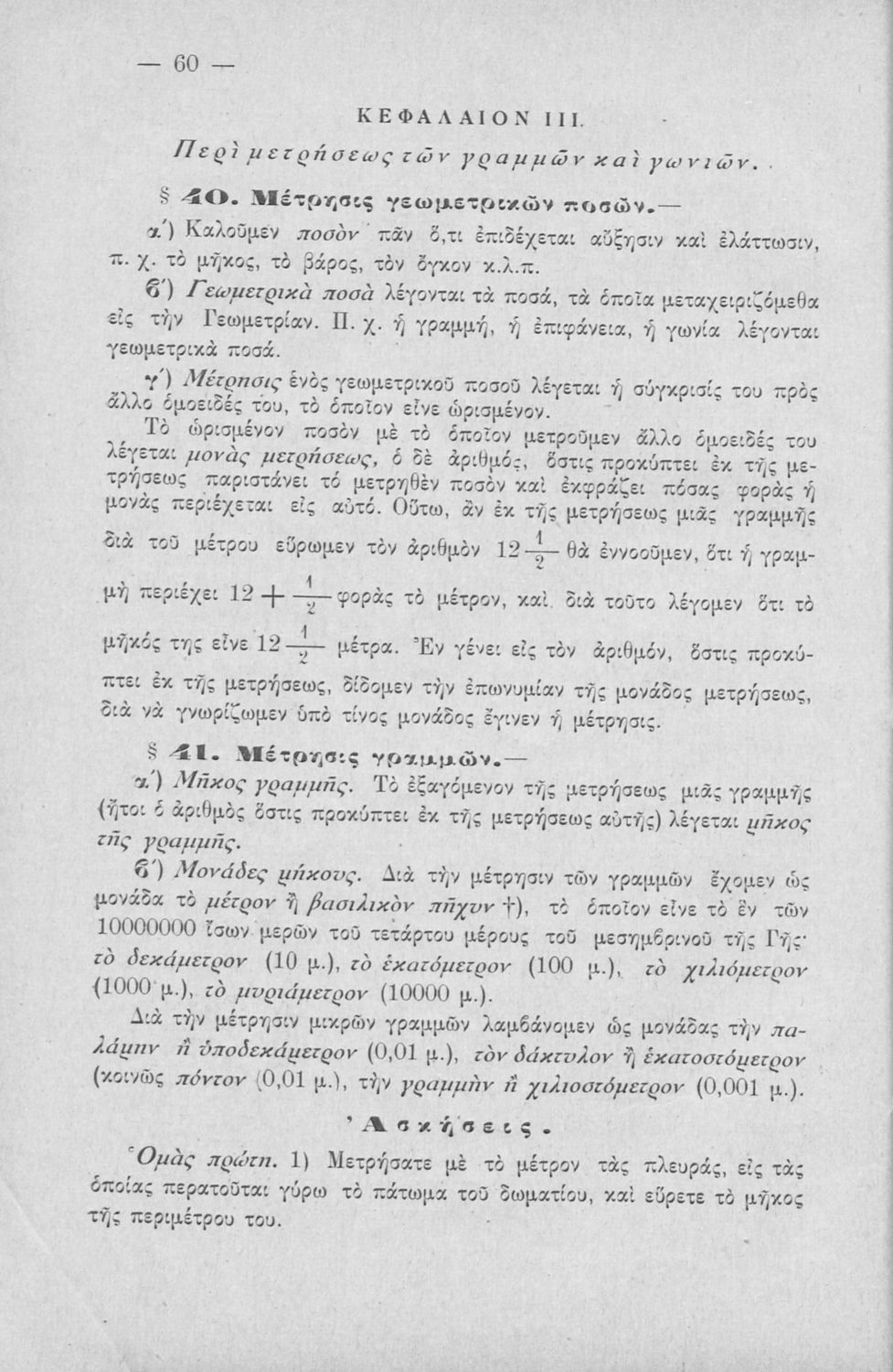 Σχολικό εγχειρίδιο Γεωμετρίας για τα Ελληνικά και Αστικά Σχολεία χωρισμένο σε Επιπεδομετρία και Στερεομετρία. Περιλαμβάνει προβλήματα και στοιχεία χωρομετρίας.