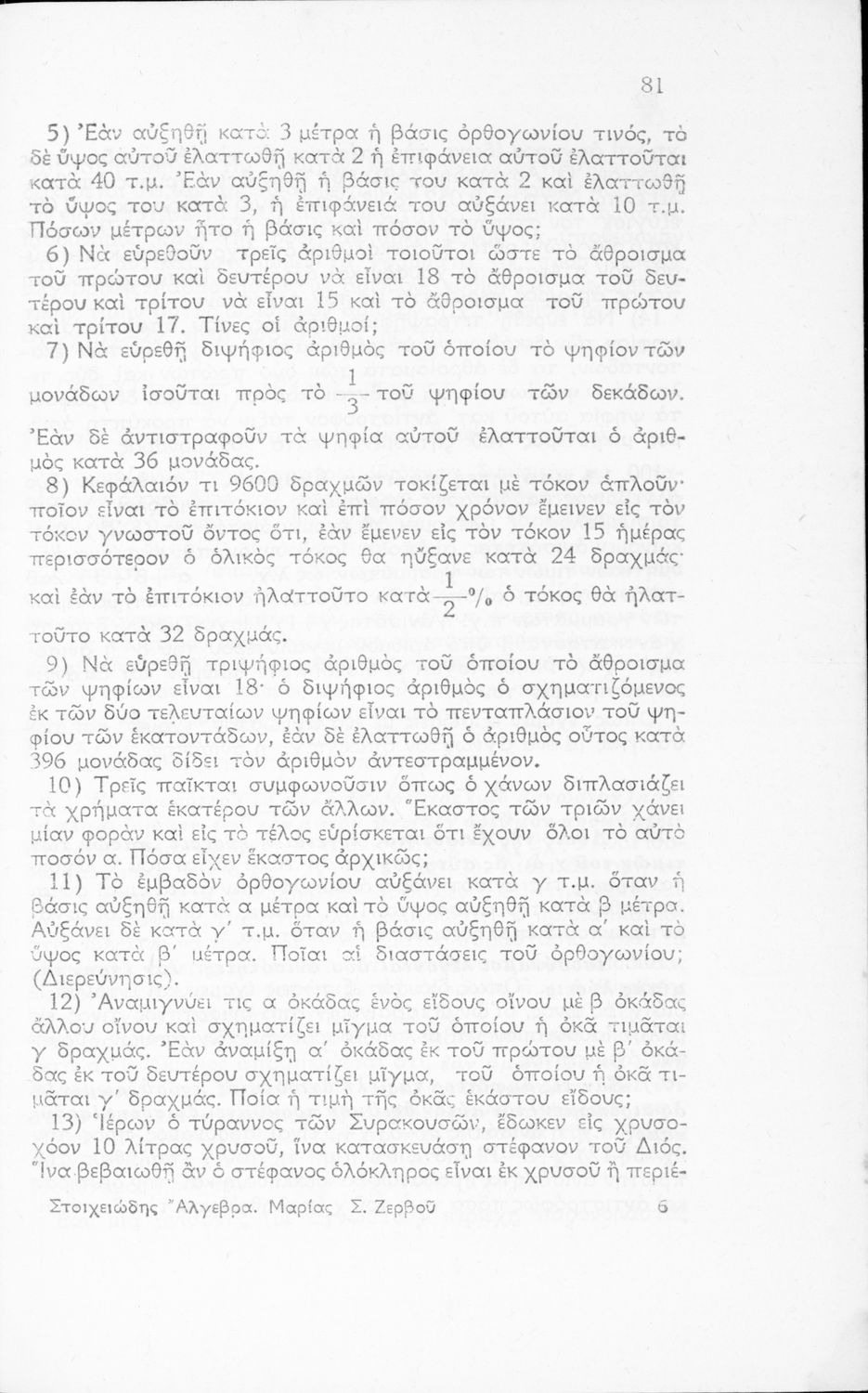 Κωδικός αναγνώρισης: 01-17976 Τίτλος: Στοιχειώδης άλγεβρα προς χρήσιν των Γυμνασίων Συγγραφέας: Μαρία Σ. Ζερβού Μέγεθος και υπόστρωμα: Σχολικό εγχειρίδιο, 21εκ., μαλακό εξώφυλλο, 185 σελίδες. |