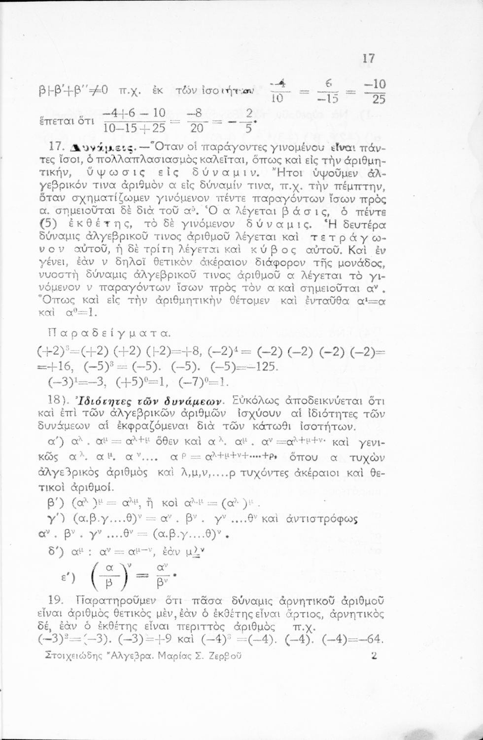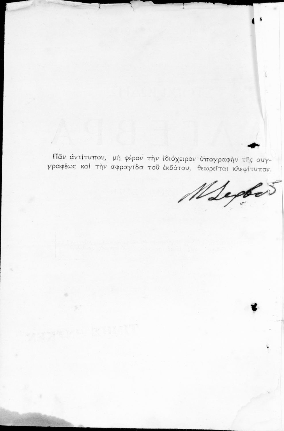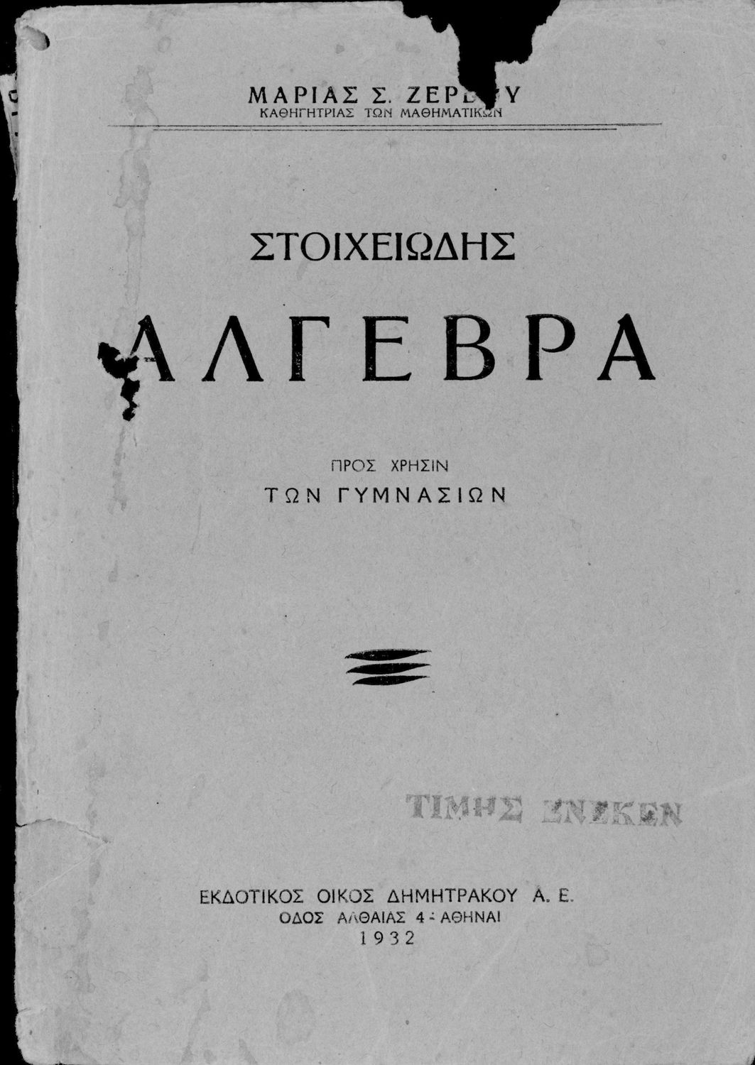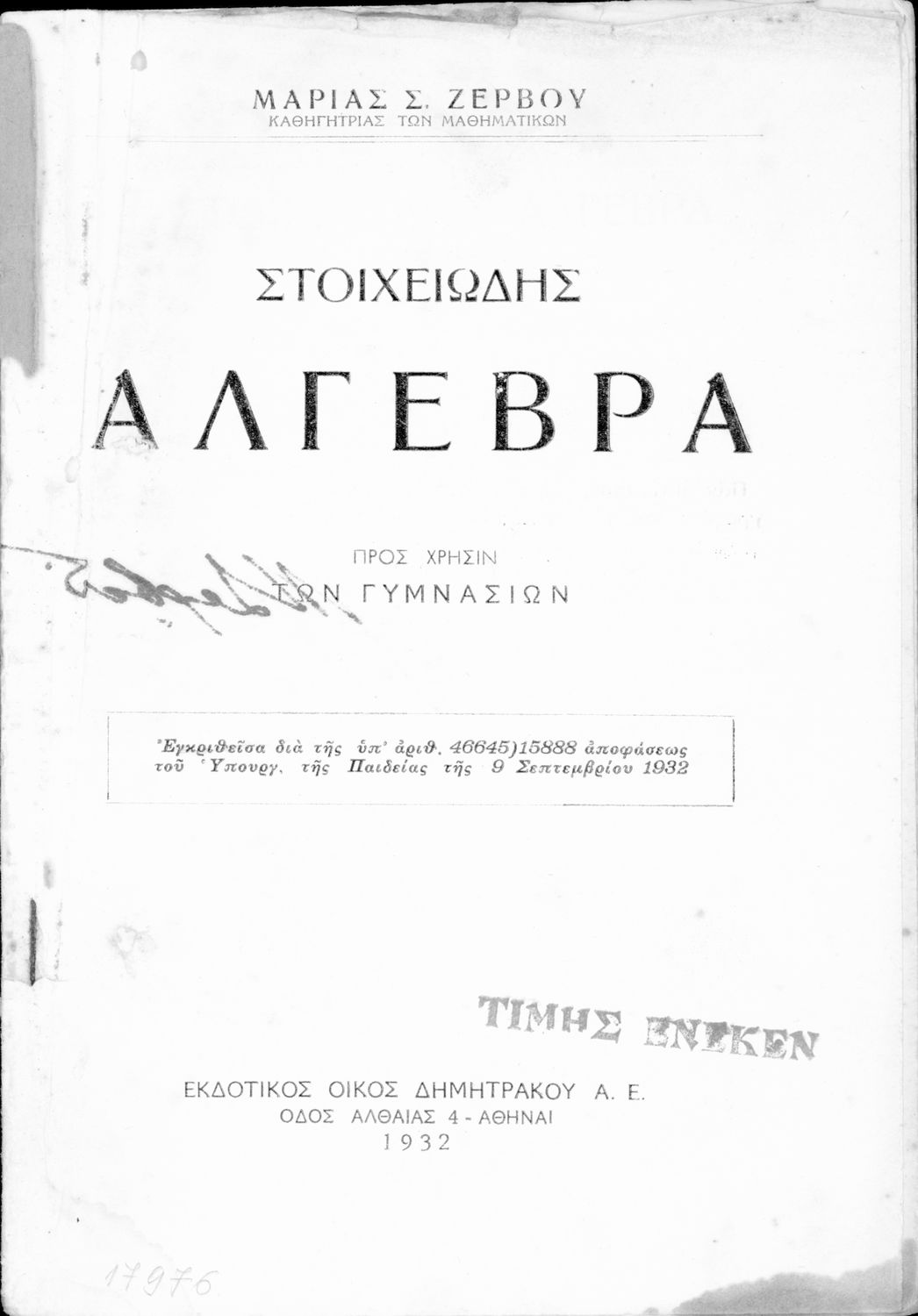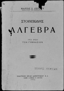 Κωδικός αναγνώρισης: 01-17976 Τίτλος: Στοιχειώδης άλγεβρα προς χρήσιν των Γυμνασίων Συγγραφέας: Μαρία Σ. Ζερβού Μέγεθος και υπόστρωμα: Σχολικό εγχειρίδιο, 21εκ., μαλακό εξώφυλλο, 185 σελίδες. |