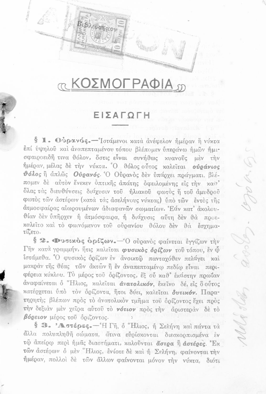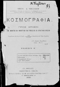 Βαθμίδα εκπαίδευσης: Δευτεροβάθμια Τάξη: Γυμνάσιο / Πρακτικό Λύκειο Μάθημα: Κοσμογραφία Γλώσσα: Καθαρεύουσα Παρουσίαση περιεχομένου: Σχολικό εγχειρίδιο Κοσμογραφίας Γυμνασίου και Πρακτικού Λυκείου που εστιάζει στην κίνηση των πλανητών και στον τρόπο υπολογισμού της τροχιάς τους. Ο συγγραφέας ήταν καθηγητής στην πρότυπη Βαρβάκειο σχολή του Διδασκαλείου Μέσης Εκπαίδευσης. |