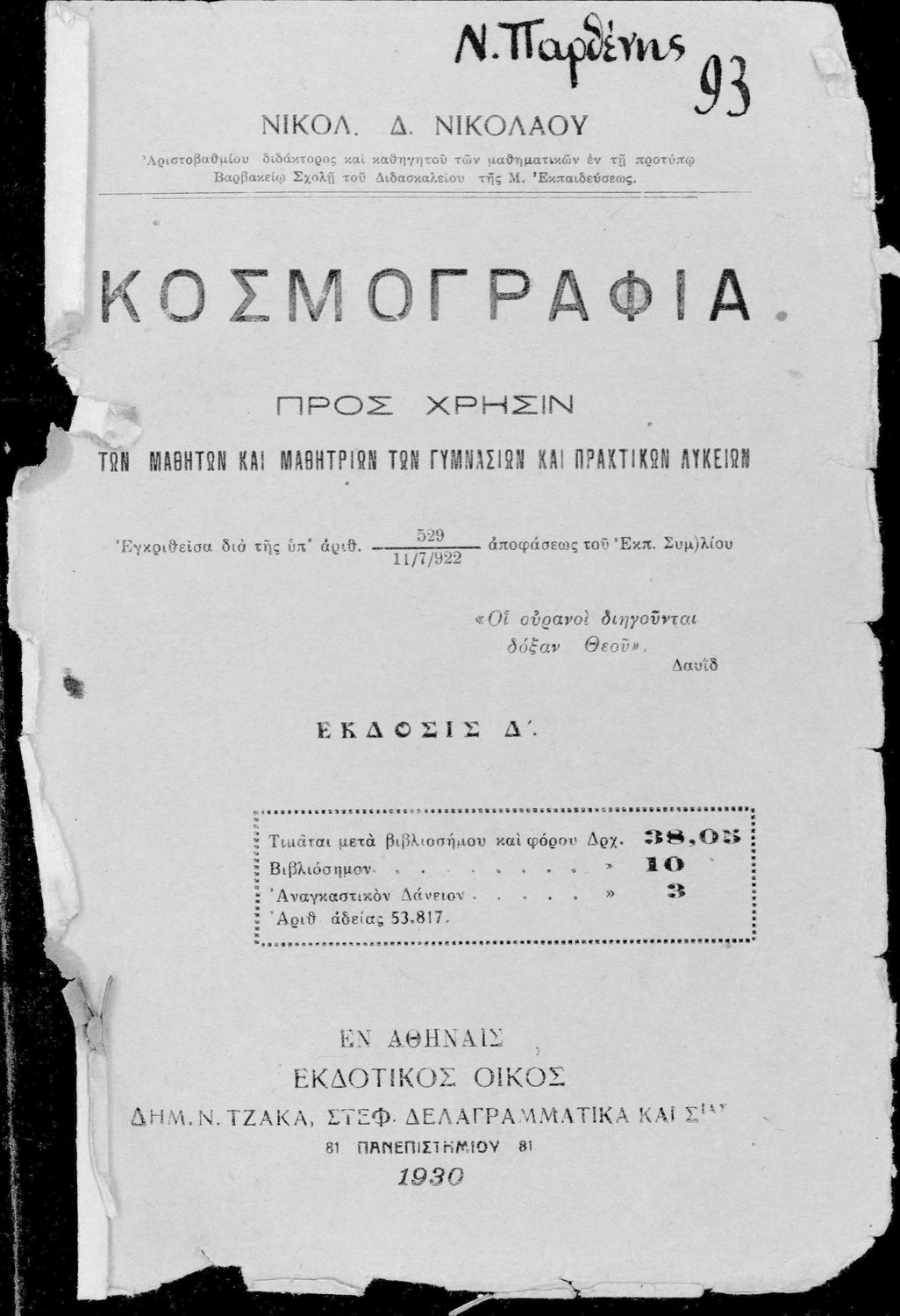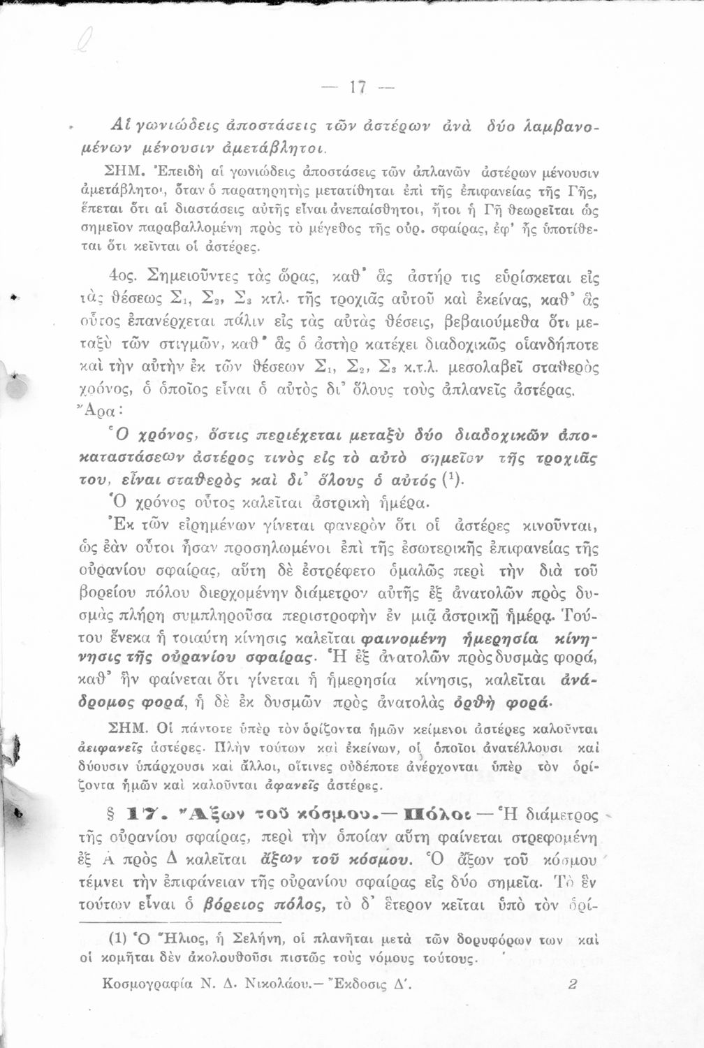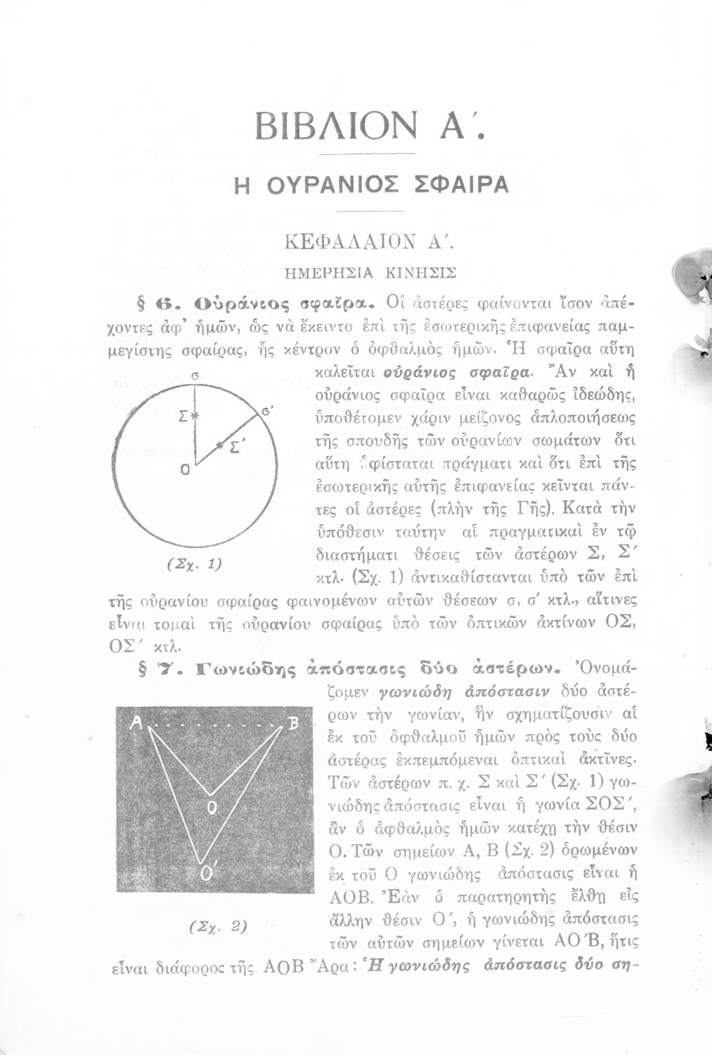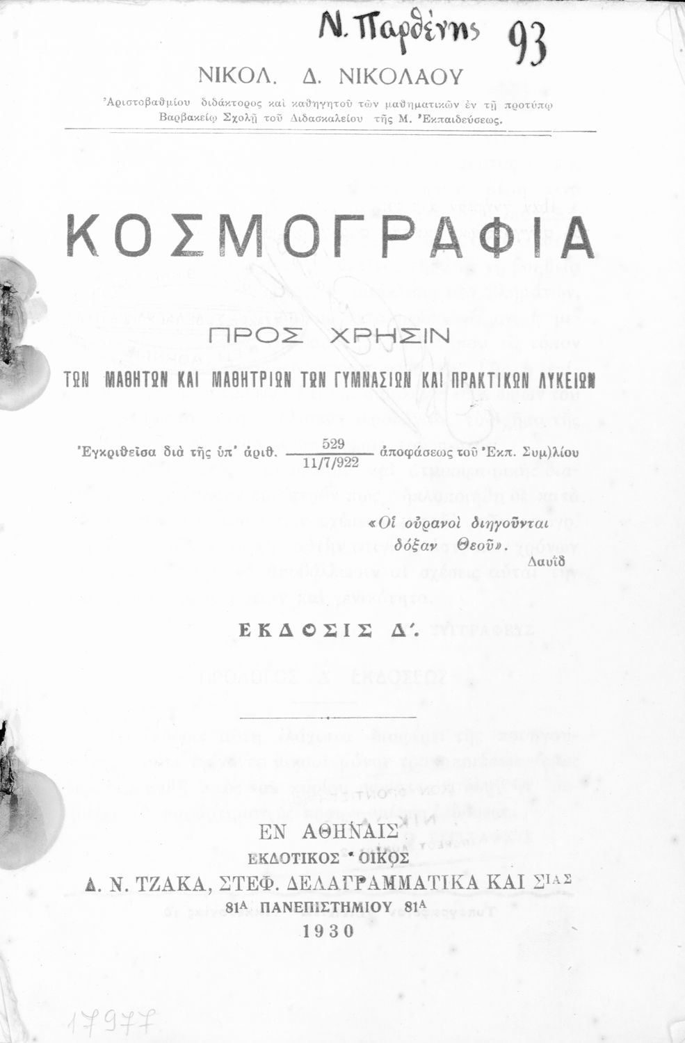 Σχολικό εγχειρίδιο Κοσμογραφίας Γυμνασίου και Πρακτικού Λυκείου που εστιάζει στην κίνηση των πλανητών και στον τρόπο υπολογισμού της τροχιάς τους. Ο συγγραφέας ήταν καθηγητής στην πρότυπη Βαρβάκειο σχολή του Διδασκαλείου Μέσης Εκπαίδευσης.