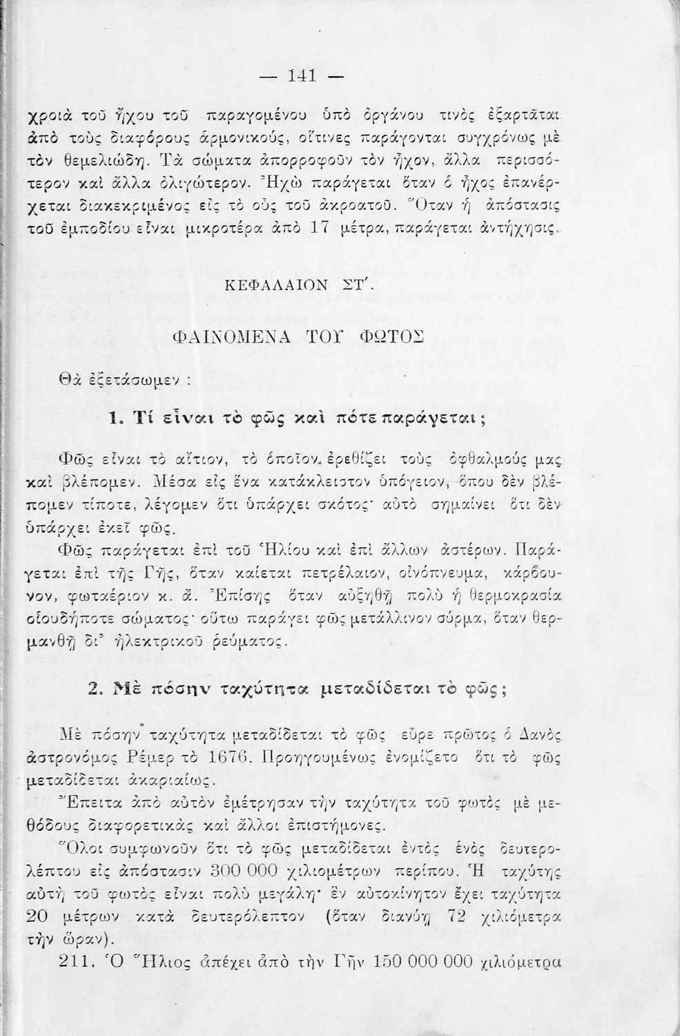 Σχολικό εγχειρίδιο της Α΄ Γυμνασίου για το μάθημα της Φυσικής. Παρέχει βασικές γνώσεις της φυσικής επιστήμης και της χημείας. Αναλύει τις ιδιότητες των σωμάτων, καθώς και της θερμότητας, του ηλεκτρισμού και του μαγνητισμού, την υδροστατική, την βαρύτητα και την αεροστατική. Σχετικά με τη Χημεία αναφέρεται στα μέταλλα, στα οξέα, τις βάσεις, τα άλατα. Αναφέρεται στην πρακτική εφαρμογή της φυσικής και της χημείας στην καθημερινότητά. Επίσης, περιλαμβάνει πολλά από τα όργανα, που χρησιμοποιούνται στη φυσική, και τη χημεία. Περιέχει εικόνες και σχεδιαγράμματα τα οποία βοηθούν τη διδασκαλία.
