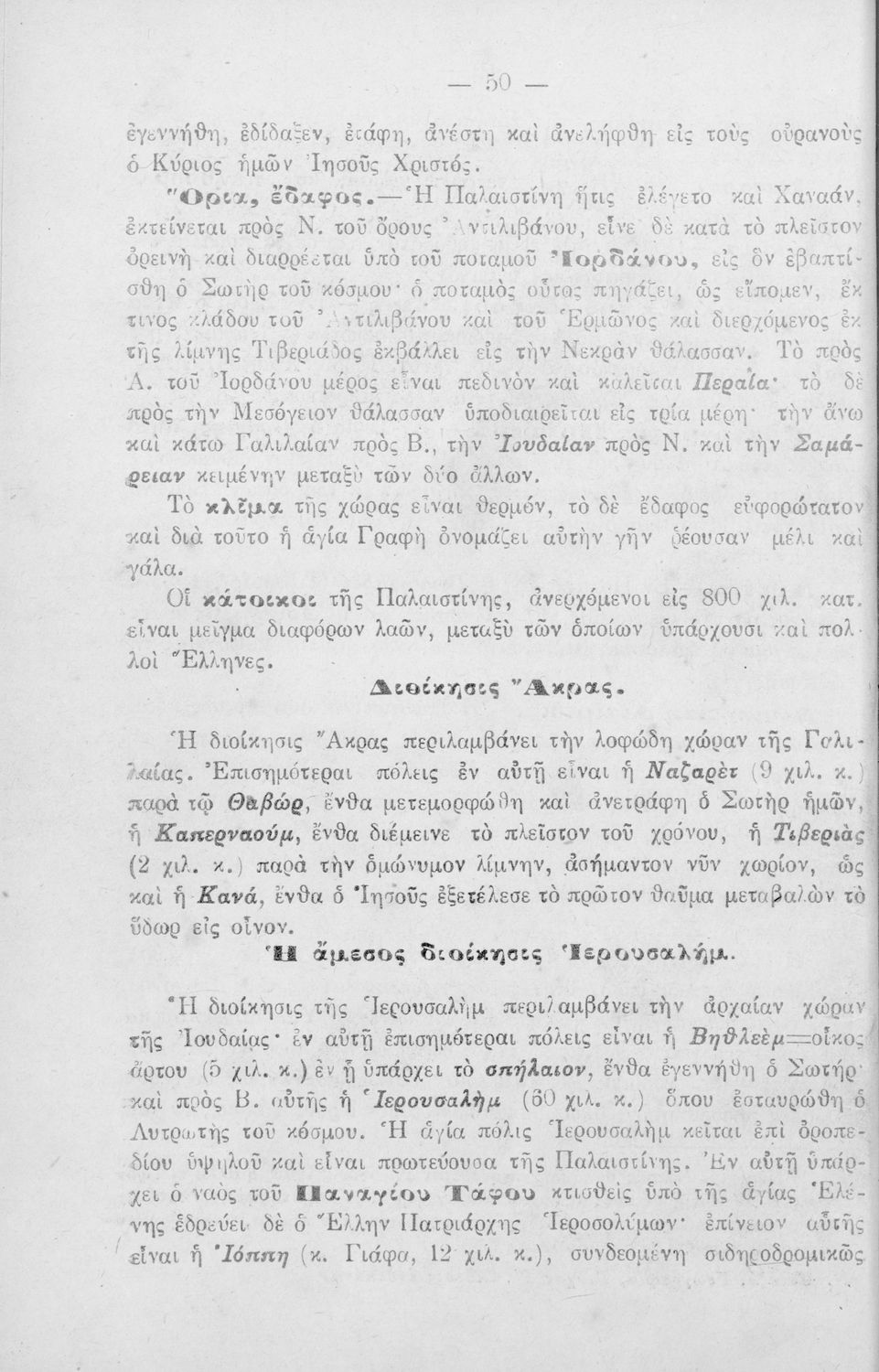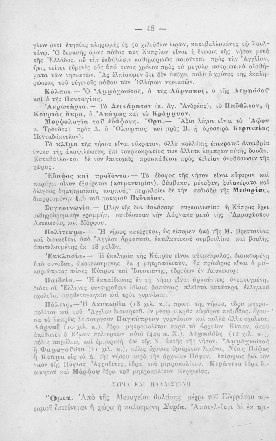 Σχολικό εγχειρίδιο Γεωγραφίας για τις Ε΄ και ΣΤ΄ Δημοτικού που περιλαμβάνει στοιχεία μαθηματικής και φυσικής γεωγραφίας, γεωλογίας και κοσμογραφίας, και εξετάζει την Ελλάδα και ενδεικτικές χώρες από τις πέντε ηπείρους. Περιέχει και αναφορά στις "αλύτρωτες ελληνικές χώρες" στις οποίες περιλαμβάνει την Σερβική και Βουλγαρική Μακεδονία, τη Βόρεια Ήπειρο, τη Μικρά Ασία και την Κύπρο.