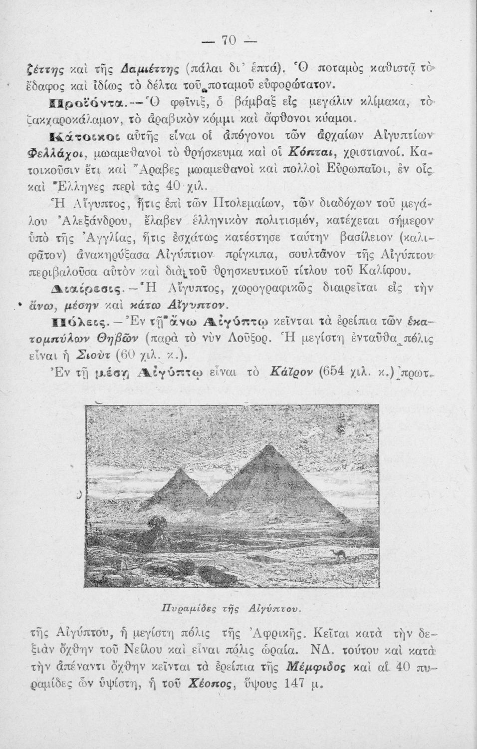 Σχολικό εγχειρίδιο Γεωγραφίας για τις Ε΄ και ΣΤ΄ Δημοτικού που περιλαμβάνει στοιχεία μαθηματικής και φυσικής γεωγραφίας, γεωλογίας και κοσμογραφίας, και εξετάζει την Ελλάδα και ενδεικτικές χώρες από τις πέντε ηπείρους. Περιέχει και αναφορά στις "αλύτρωτες ελληνικές χώρες" στις οποίες περιλαμβάνει την Σερβική και Βουλγαρική Μακεδονία, τη Βόρεια Ήπειρο, τη Μικρά Ασία και την Κύπρο.