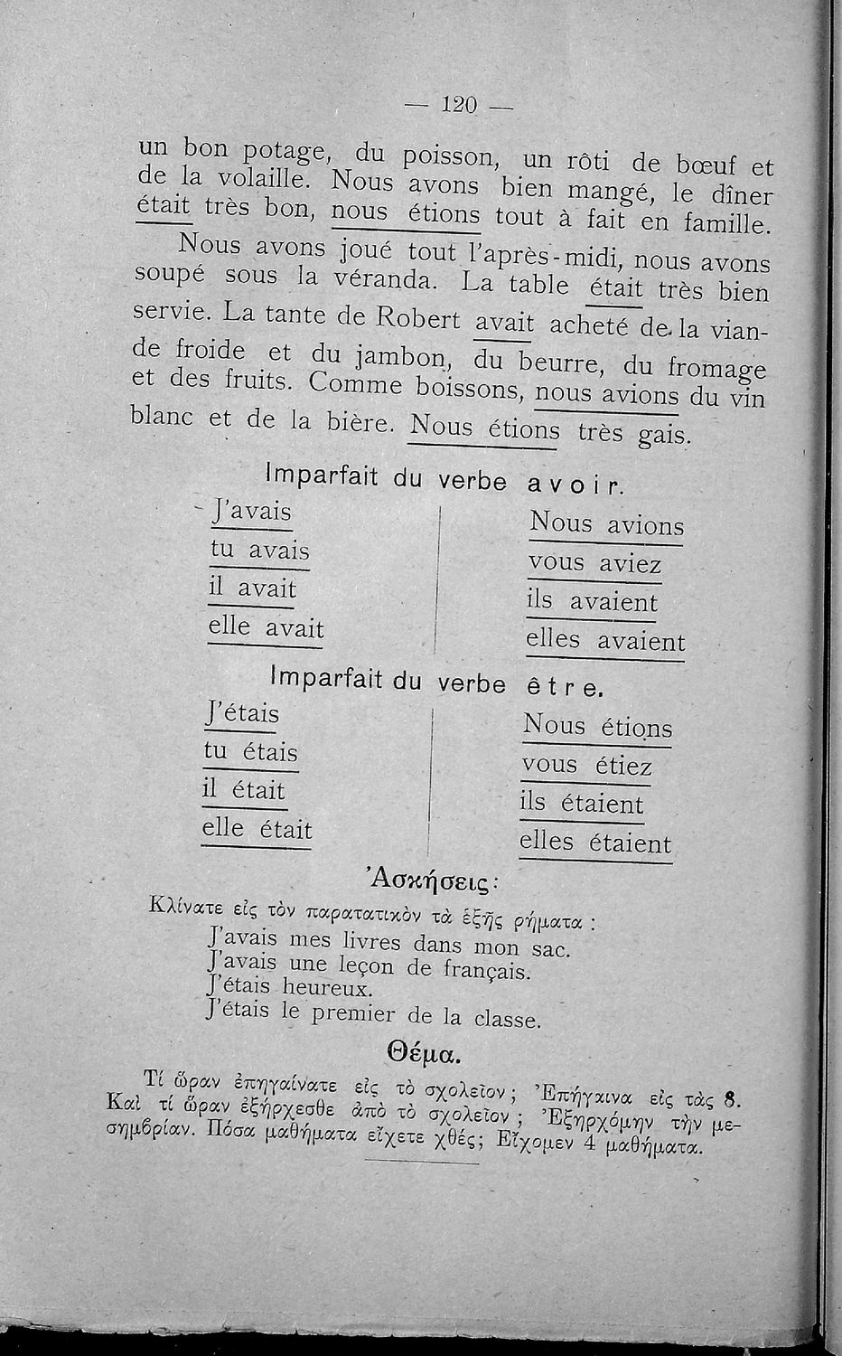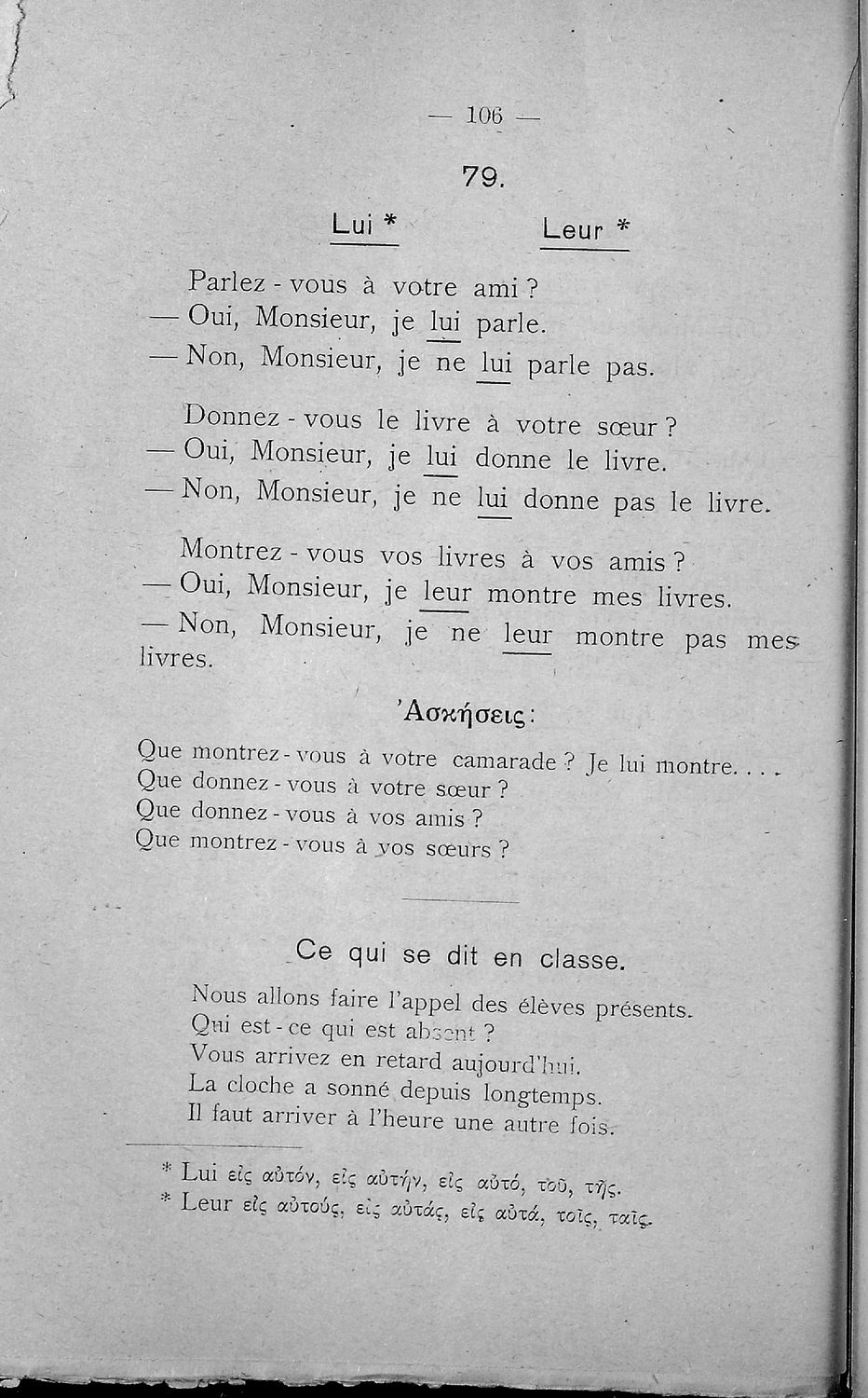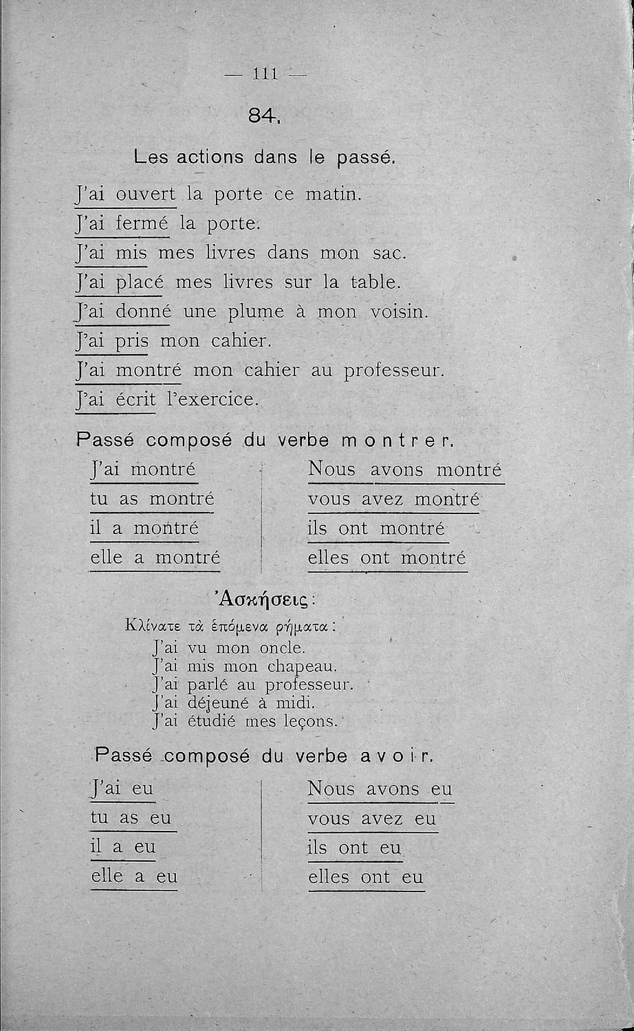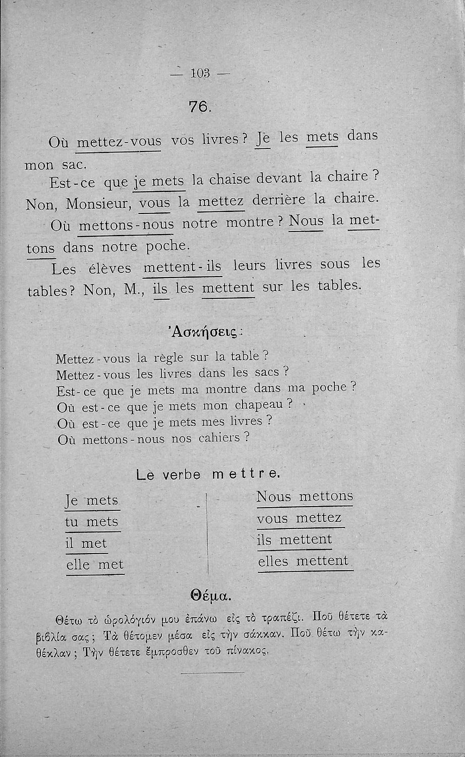 Σχολικό εγχειρίδιο Γαλλικών Β΄ και Γ' Ελληνικού Σχολείου, Αστικού Σχολείου και Παρθεναγωγείου που περιλαμβάνει κείμενα, κανόνες γραμματικής και συντακτικού, ερωτήσεις και ασκήσεις κατανόησης, και λεξιλογικά ...