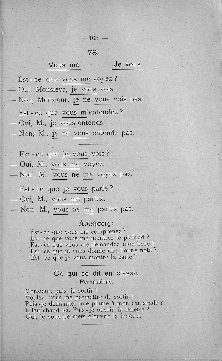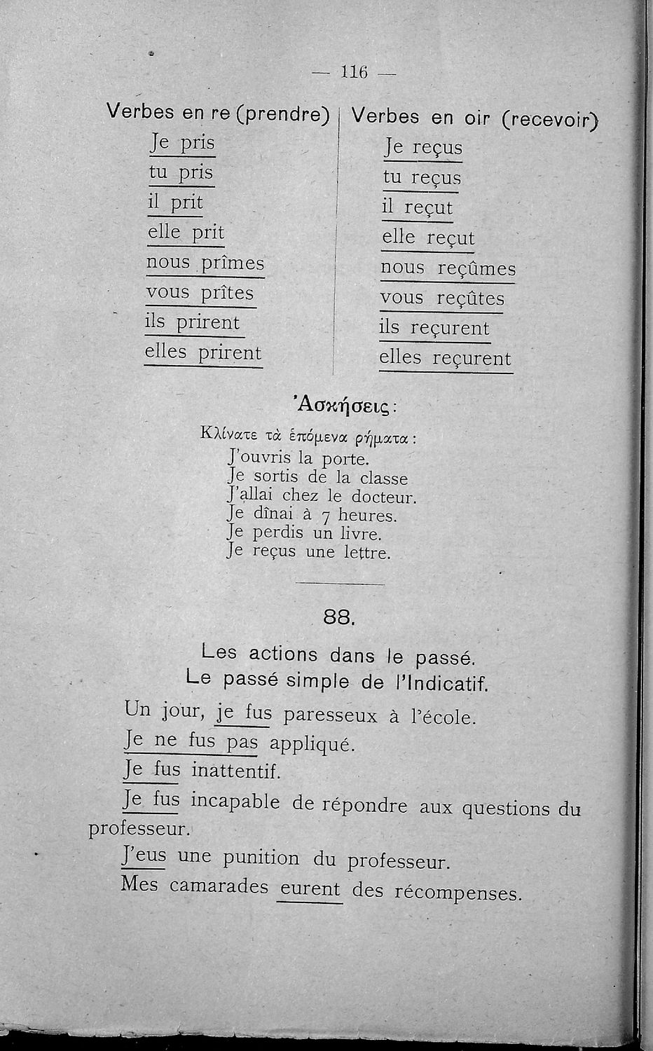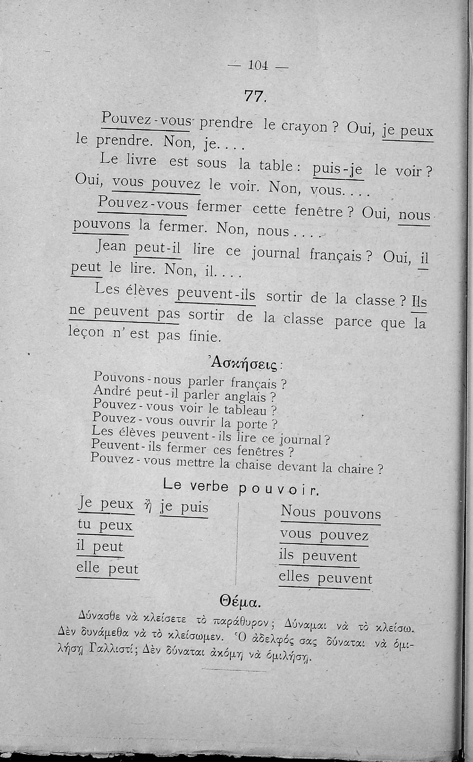Σχολικό εγχειρίδιο Γαλλικών Β΄ και Γ' Ελληνικού Σχολείου, Αστικού Σχολείου και Παρθεναγωγείου που περιλαμβάνει κείμενα, κανόνες γραμματικής και συντακτικού, ερωτήσεις και ασκήσεις κατανόησης, και λεξιλογικά ...
