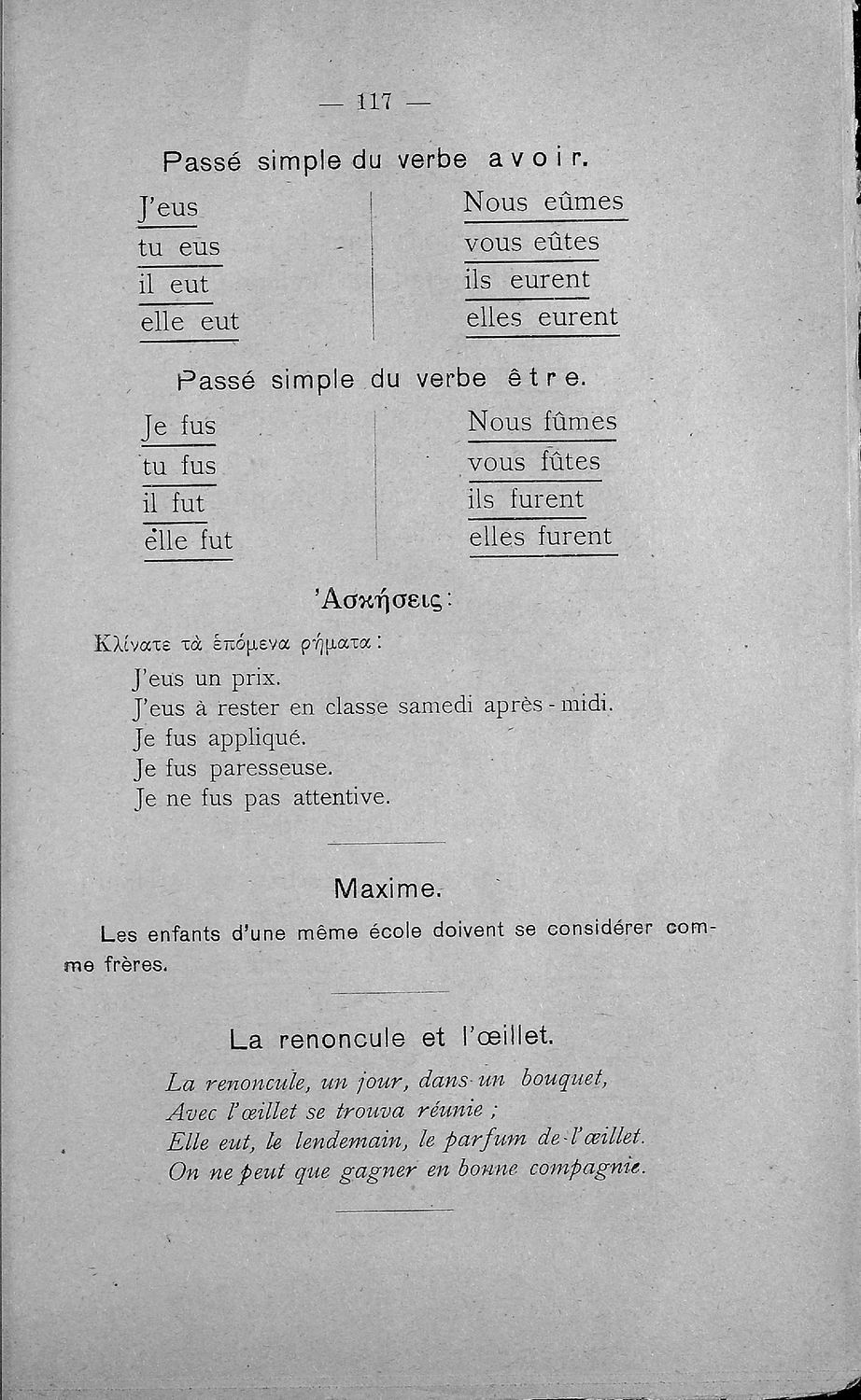 Σχολικό εγχειρίδιο Γαλλικών των Γυμνασίων, Αστικών Σχολείων θηλέων και Διδασκαλείων Δημοτικής Εκπαίδευσης. Κείμενα, ποιήματα, από εποχές και τον κοινωνικό και οικογενειακό βίο, τα οποία συνοδεύονται ασκήσεις ...