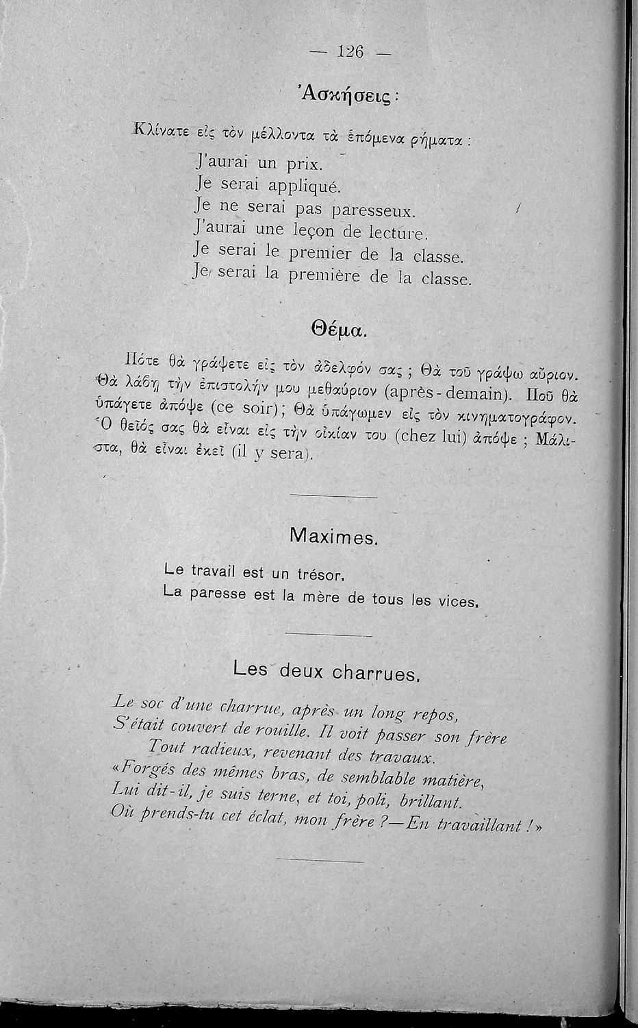 Σχολικό εγχειρίδιο Γαλλικών των Γυμνασίων, Αστικών Σχολείων θηλέων και Διδασκαλείων Δημοτικής Εκπαίδευσης. Κείμενα, ποιήματα, από εποχές και τον κοινωνικό και οικογενειακό βίο, τα οποία συνοδεύονται ασκήσεις ...