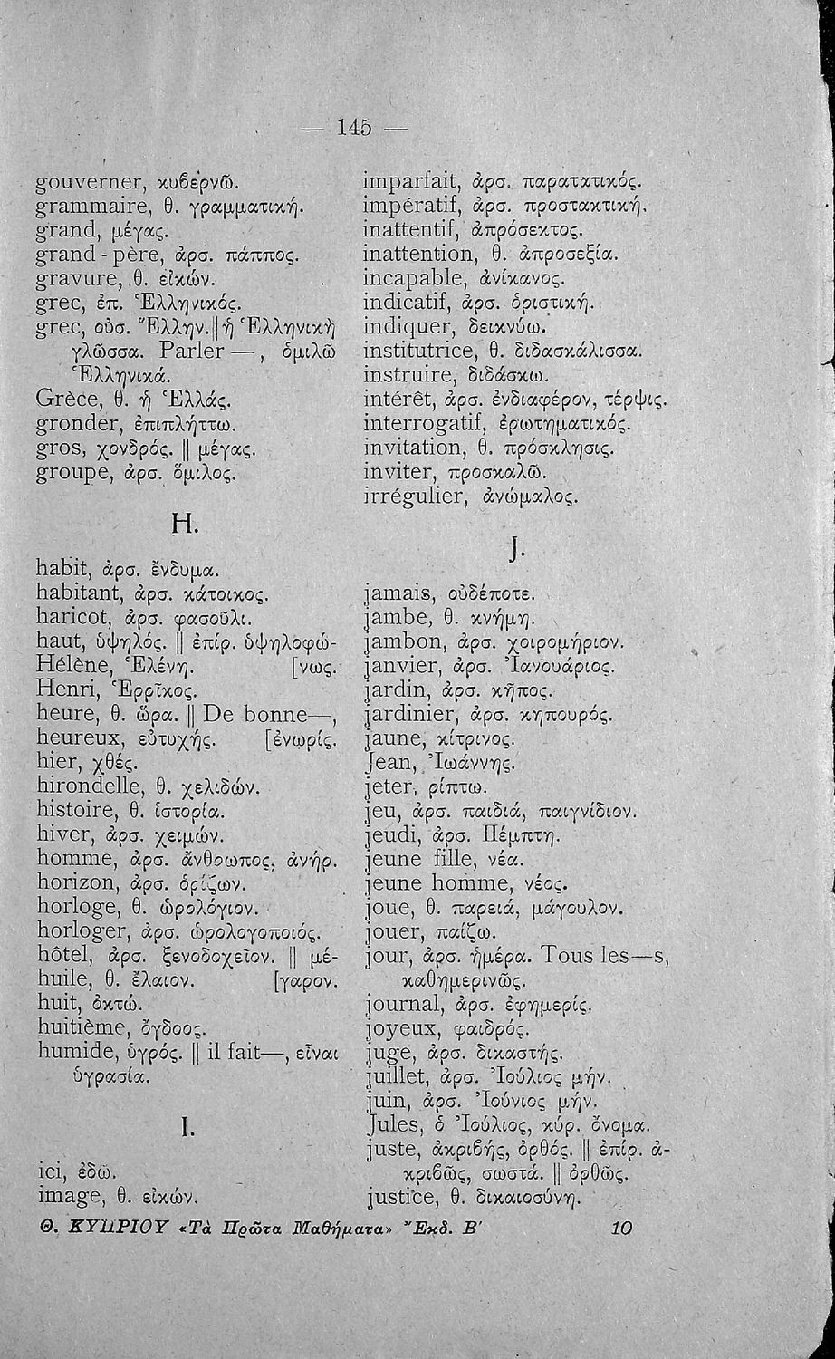 Γραμματική της γαλλικής γλώσσης τα πρώτα μαθήματα δια την Β΄ και Γ΄ τάξιν των Ελληνικών Σχολείων και τας αντιστοίχους τάξεις των Αστικών Σχολείων και Παρθεναγωγείων