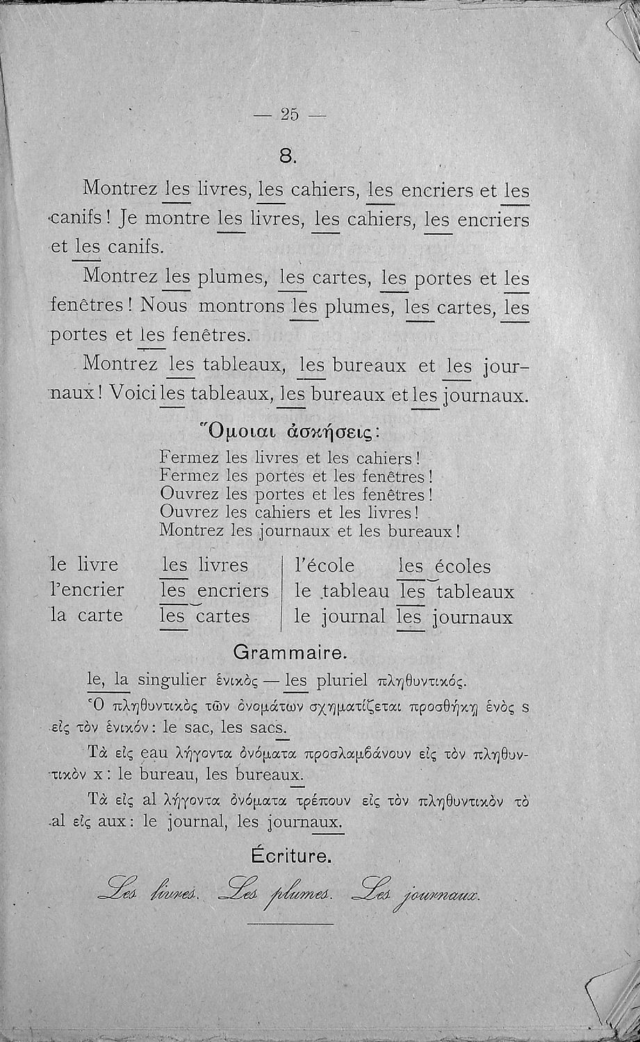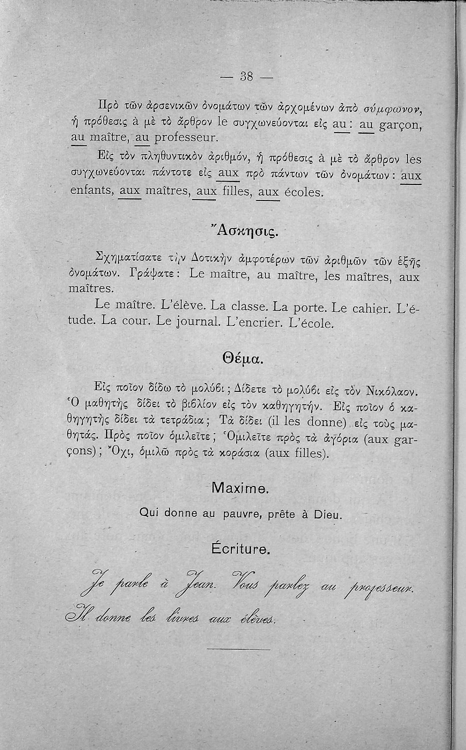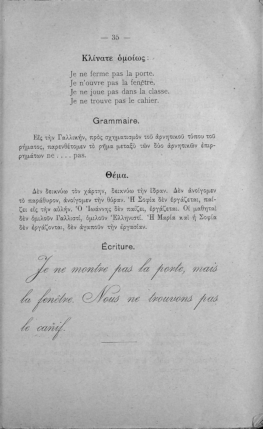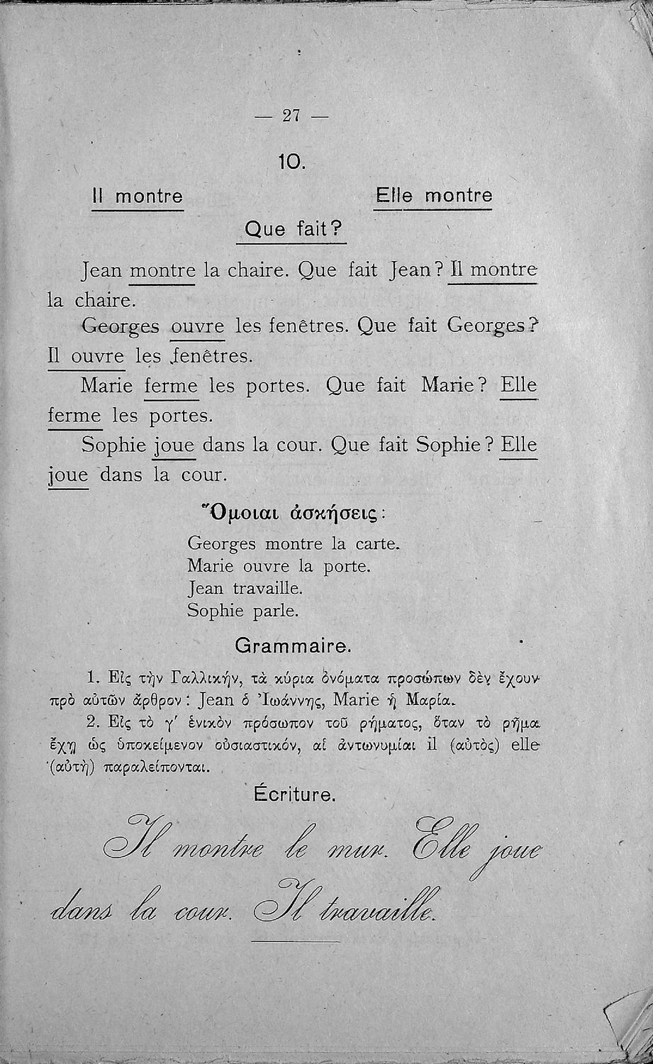 Γραμματική της Γαλλικής γλώσσας για τα Τετρατάξια Γυμνάσια, τη Γ΄ τάξη των Αστικών Σχολείων των Θηλέων και τα Διδασκαλεία της Δημοτικής Εκπαίδευσης που περιλαμβάνει θεωρία, ασκήσεις και λεξιλόγιο.
