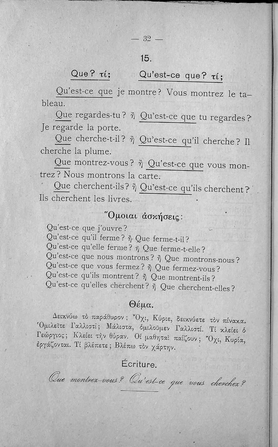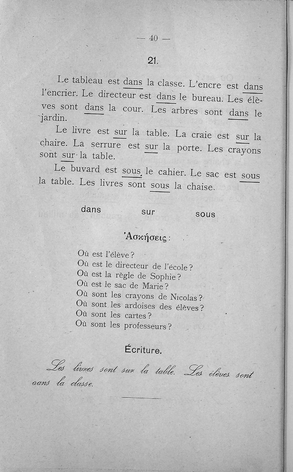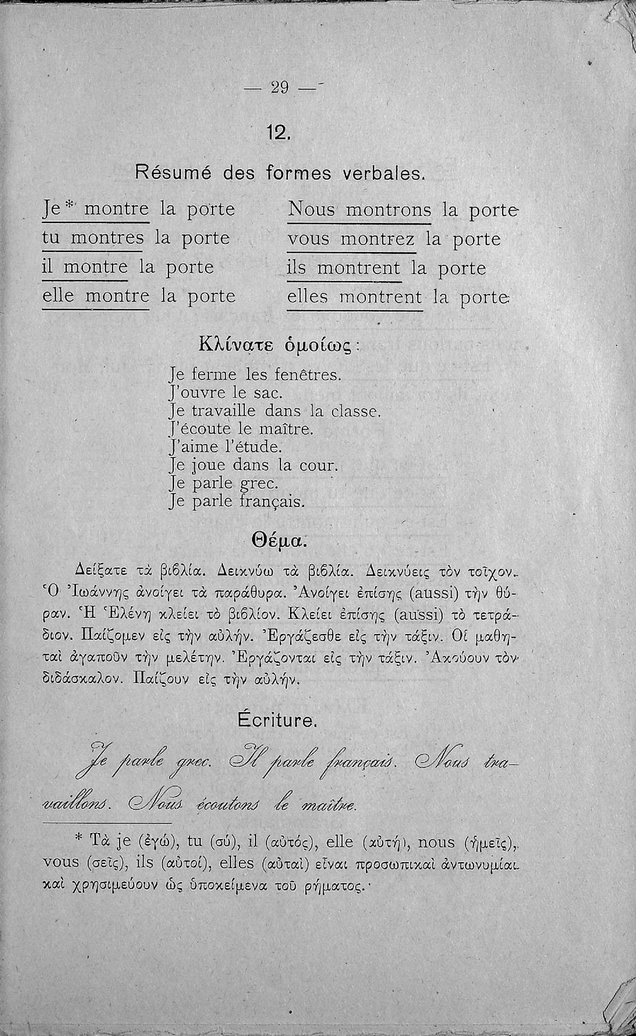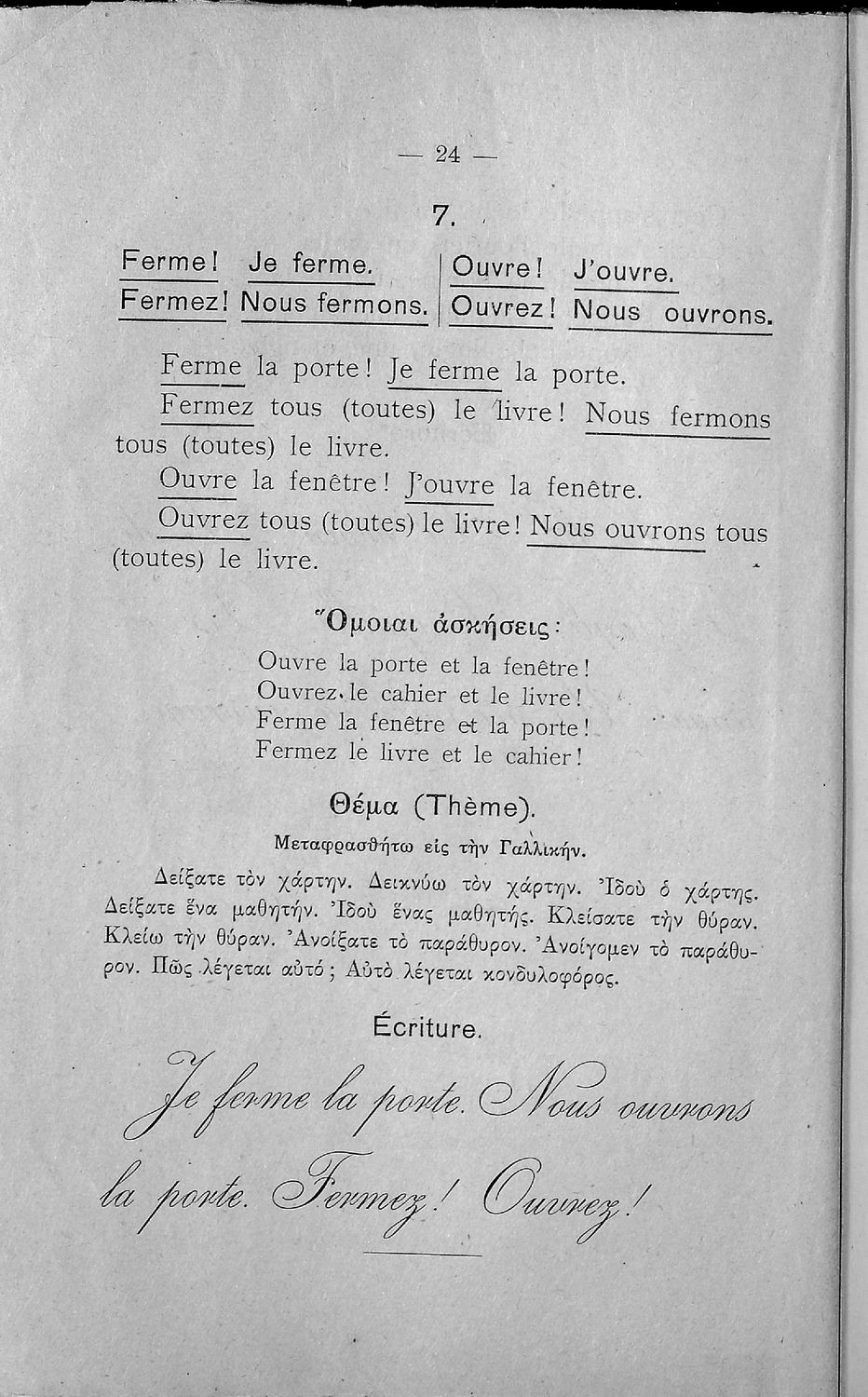 Γραμματική της Γαλλικής γλώσσας για τα Τετρατάξια Γυμνάσια, τη Γ΄ τάξη των Αστικών Σχολείων των Θηλέων και τα Διδασκαλεία της Δημοτικής Εκπαίδευσης που περιλαμβάνει θεωρία, ασκήσεις και λεξιλόγιο.